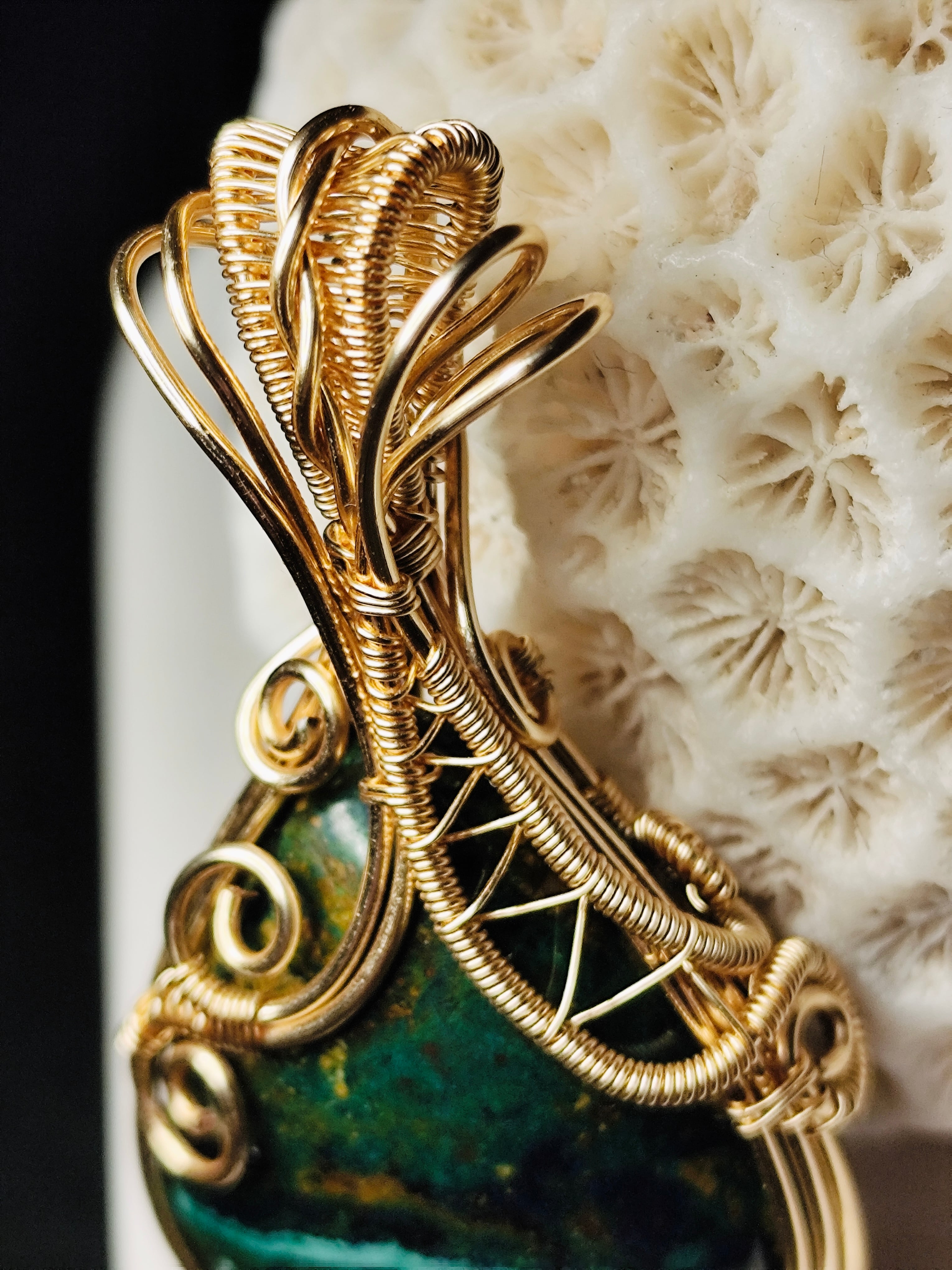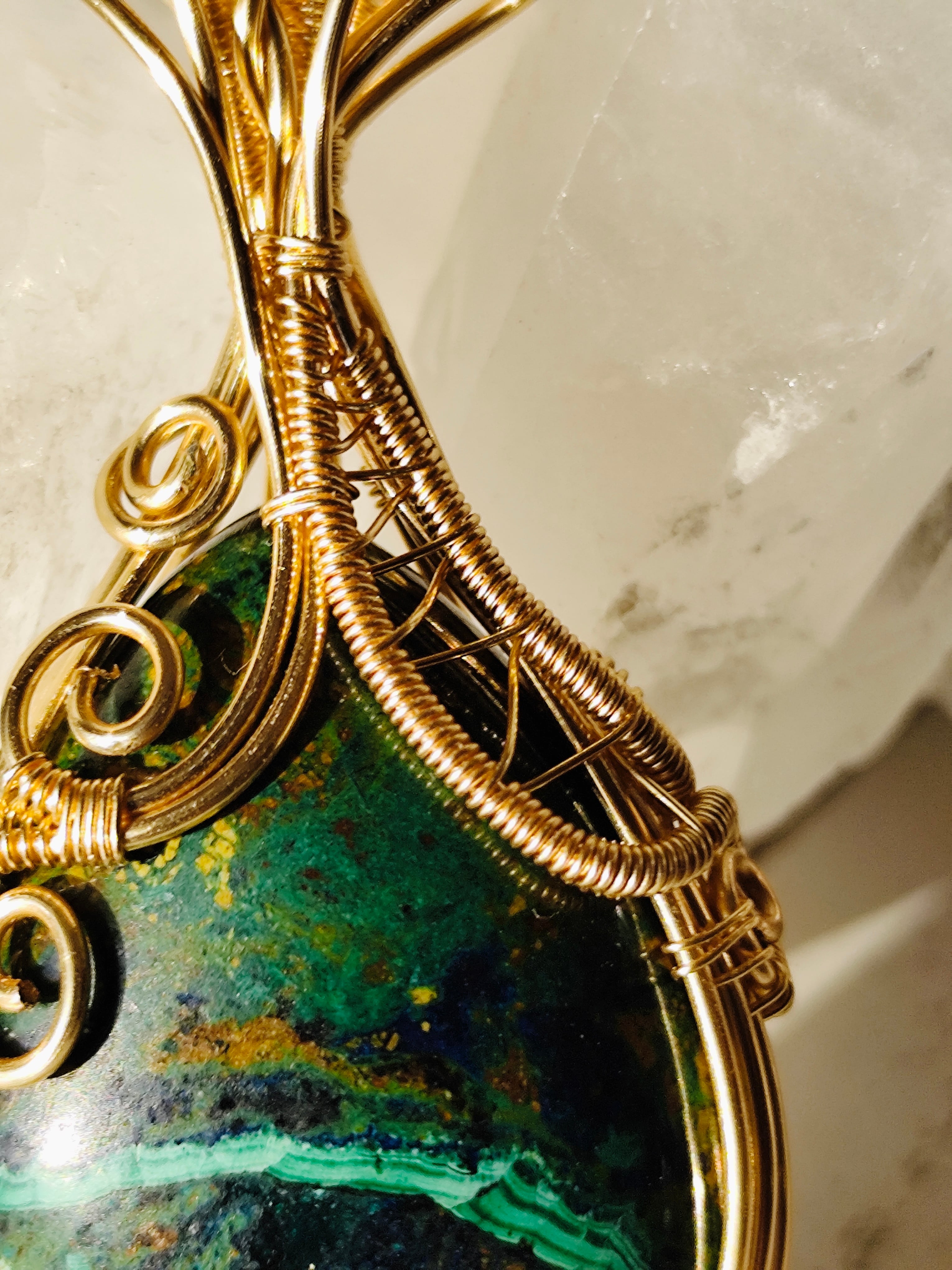 アズロマラカイトには、上空から、美しい地球のようです。表と裏どちらから見ても引き込まれる魅力がありますね♬ 石を囲いものはゴールドメッキワイヤー。こちらのペンダントにはペンダント紐が1本無料で付いております。長さ調整は可能となっております。