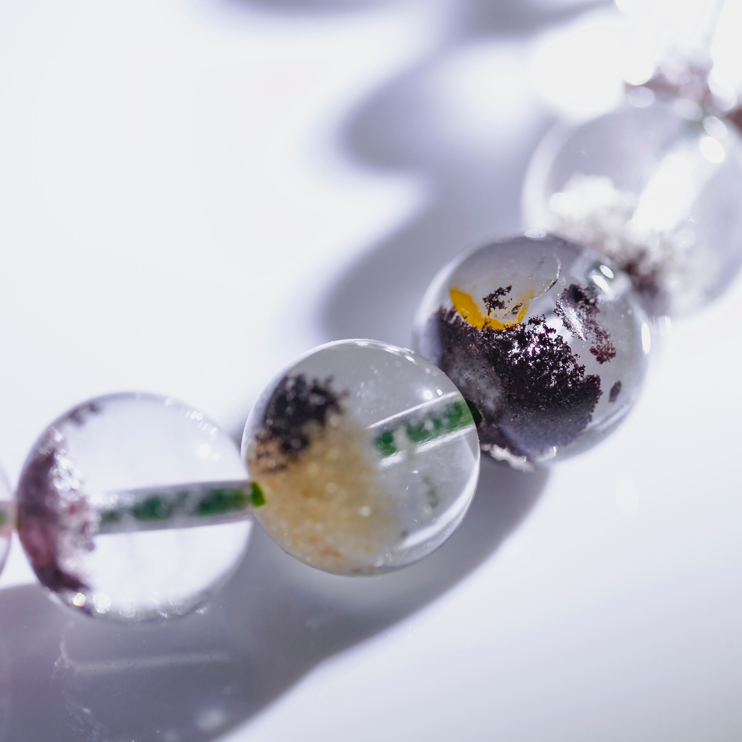 ガーデンクォーツの内部には、様々な鉱物結晶が含まれています。このブレスレットには、自然の神秘を感じる紅葉のような色合い、とても綺麗ですね!