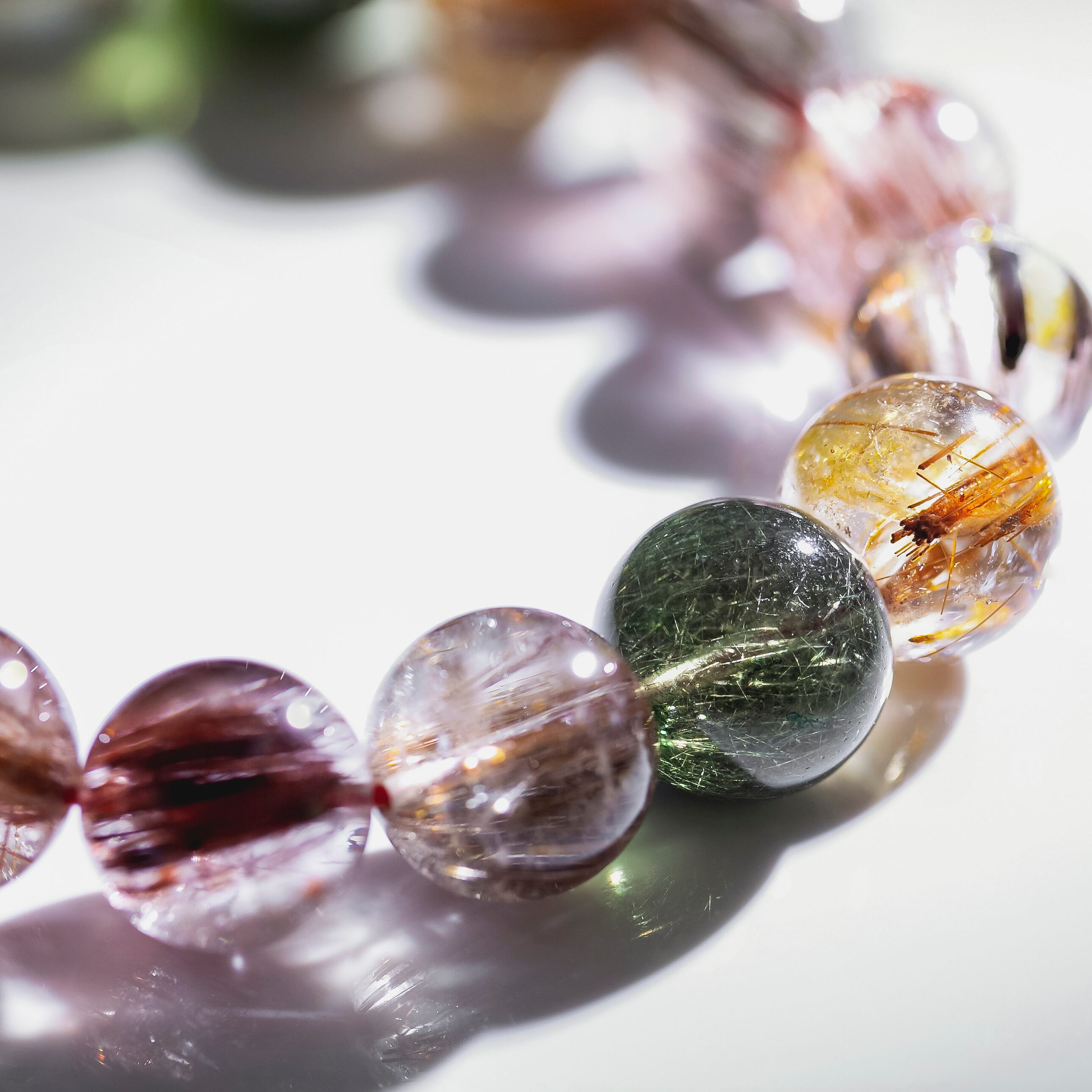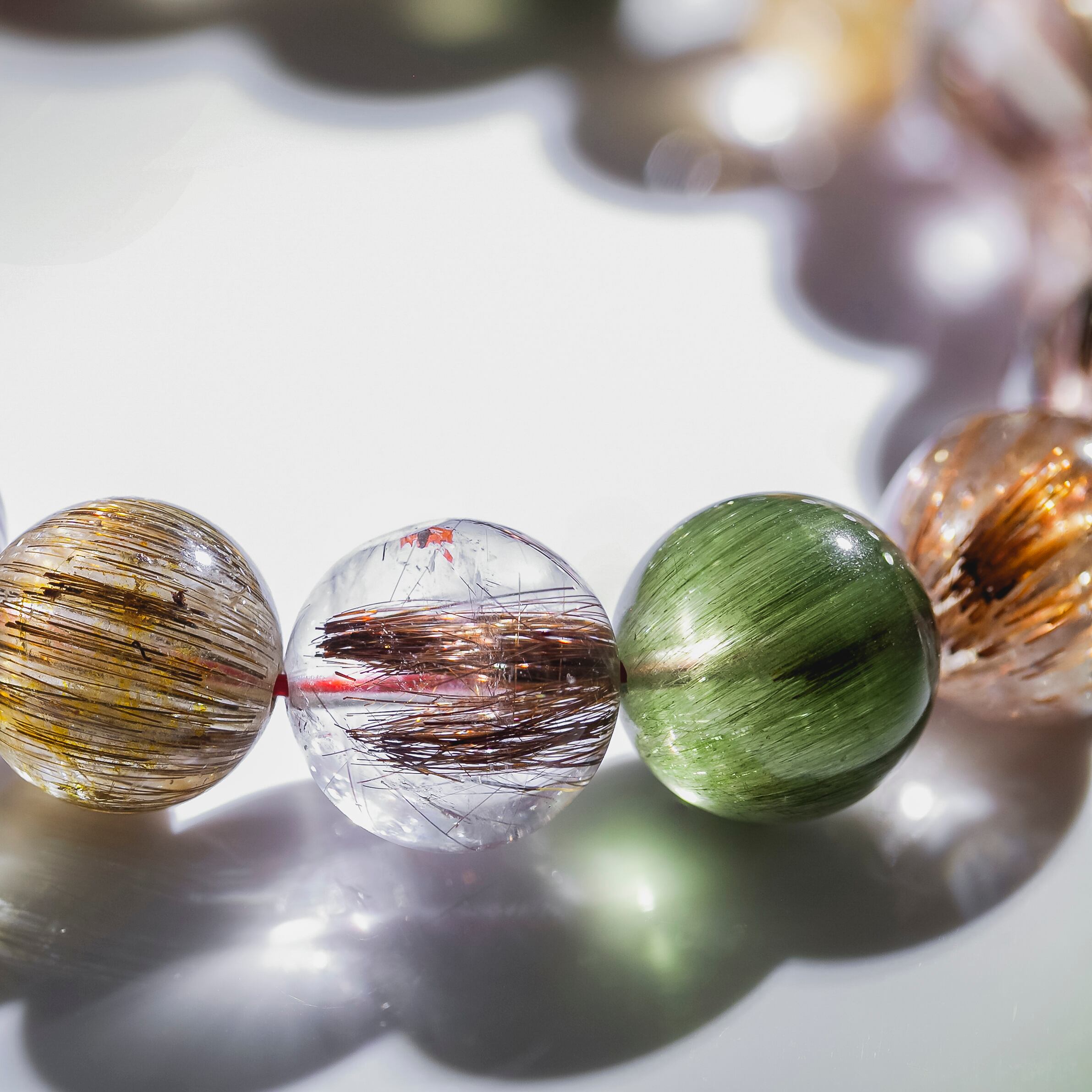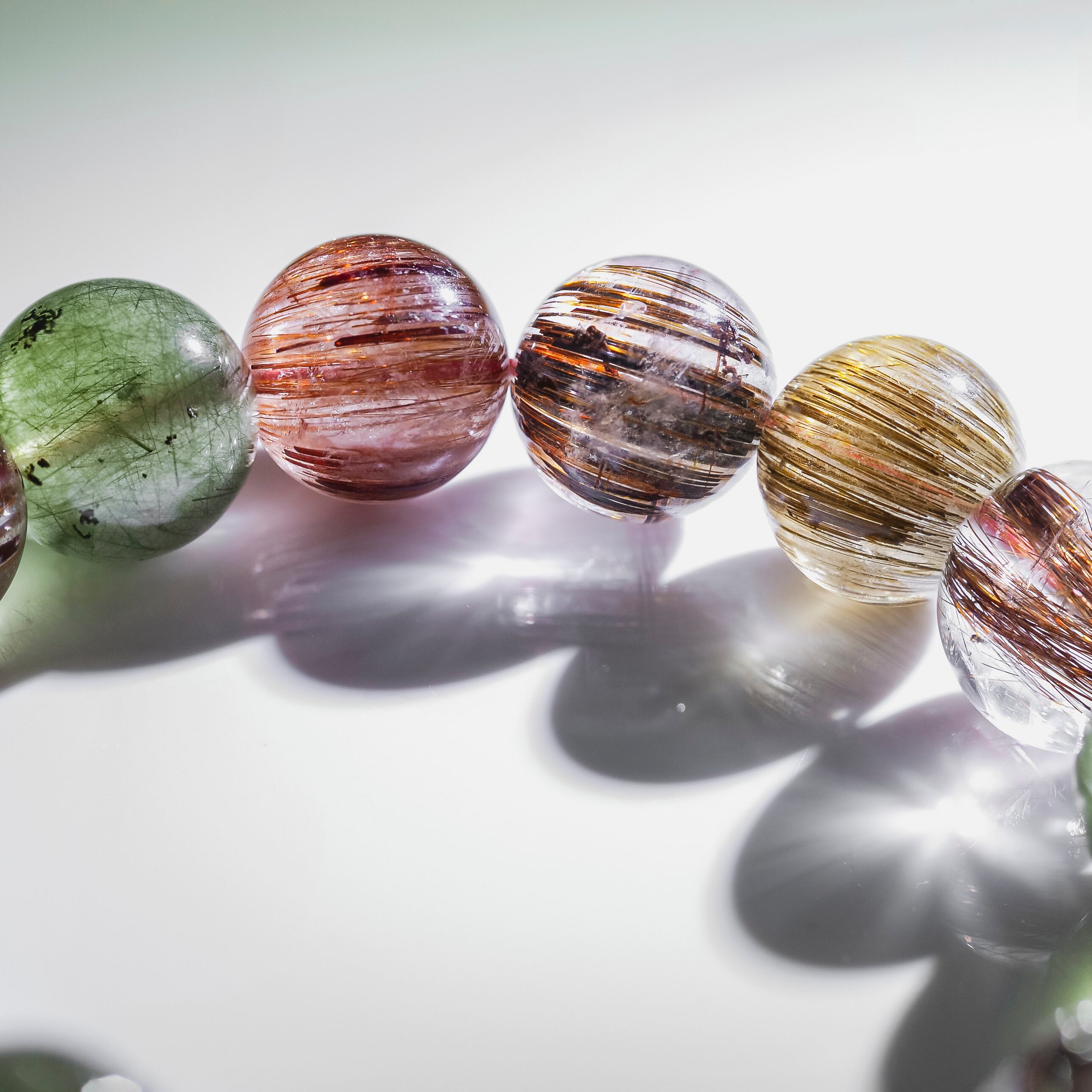 大玉ルチルクォーツ、赤針、金針、緑針、褐針のようなフワフワとした微細な針が合わせた綺麗なミックスルチルクォーツブレスになります。