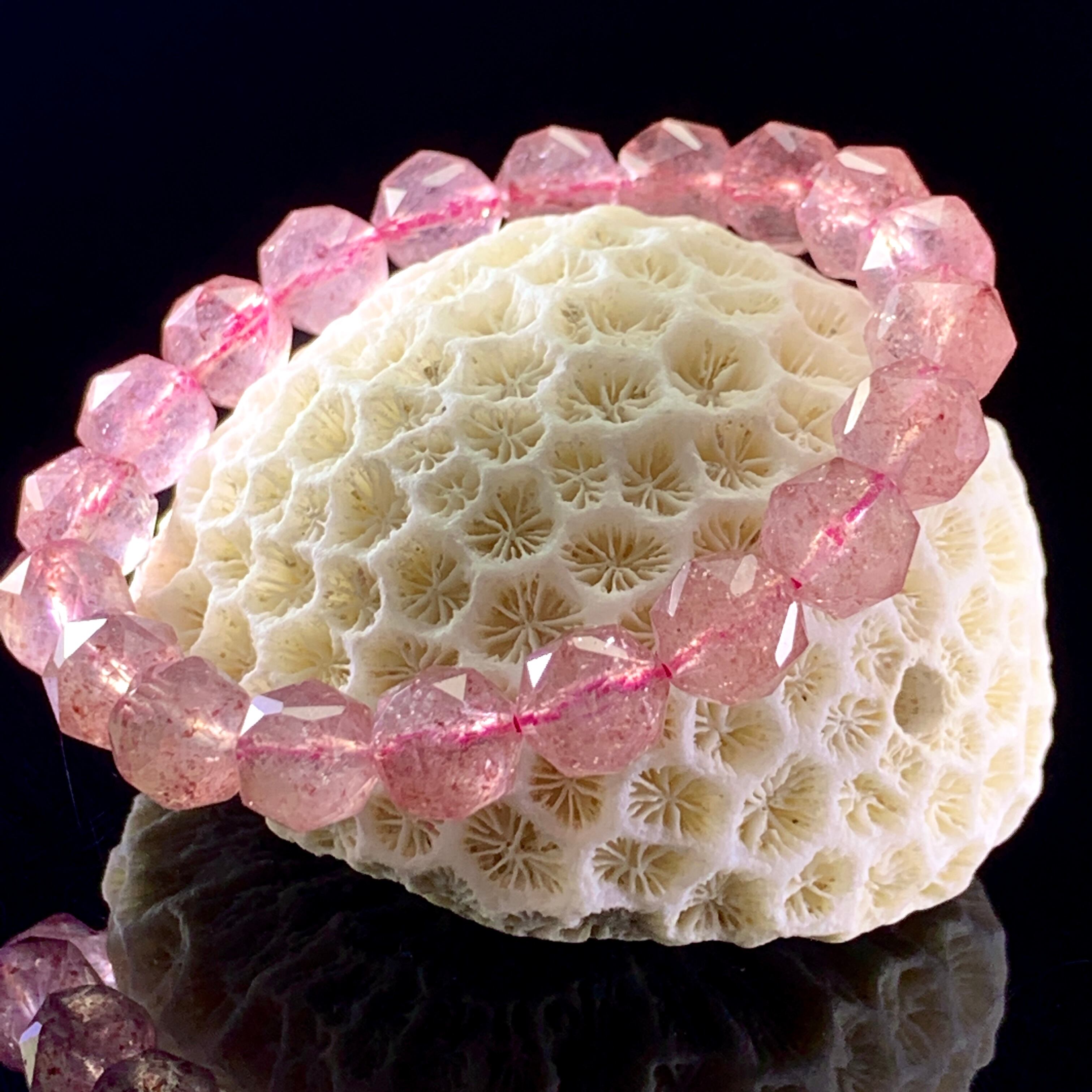 氷のように透明のストロベリークォーツカットは女性にとっては最高の守り石の一つで、愛と美を象徴する石です。