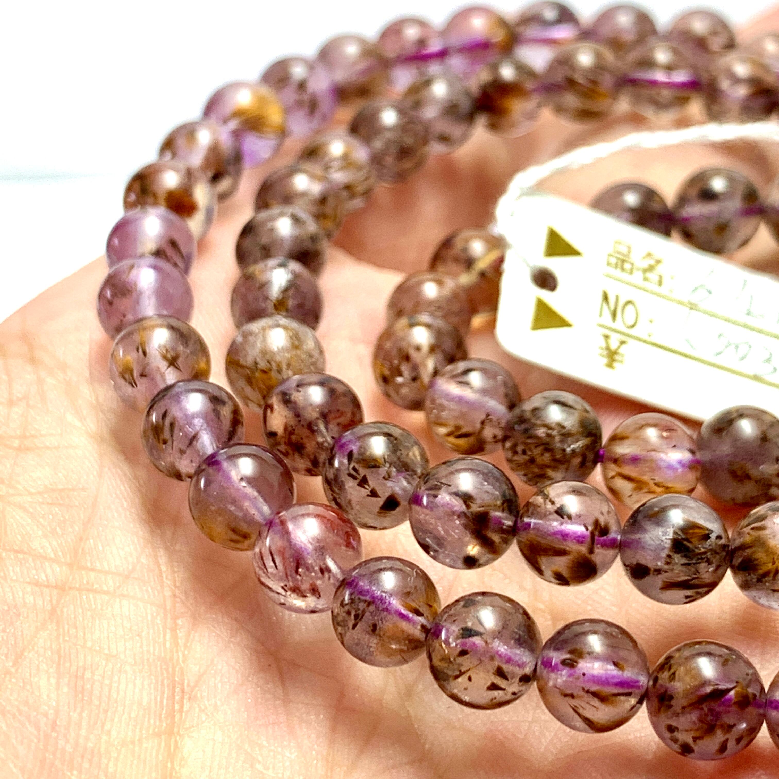 宝石質のカコクセナイトブレスレット(又名:カコクセナイトインアメジスト、インクルージョンアメジスト、スーパーセブン)。3本の中には、一番濃い目のブレスレット。紫とゴールド色の内包物がよく溶け合っています。美しい色合いでも抜群ですね。3連です。