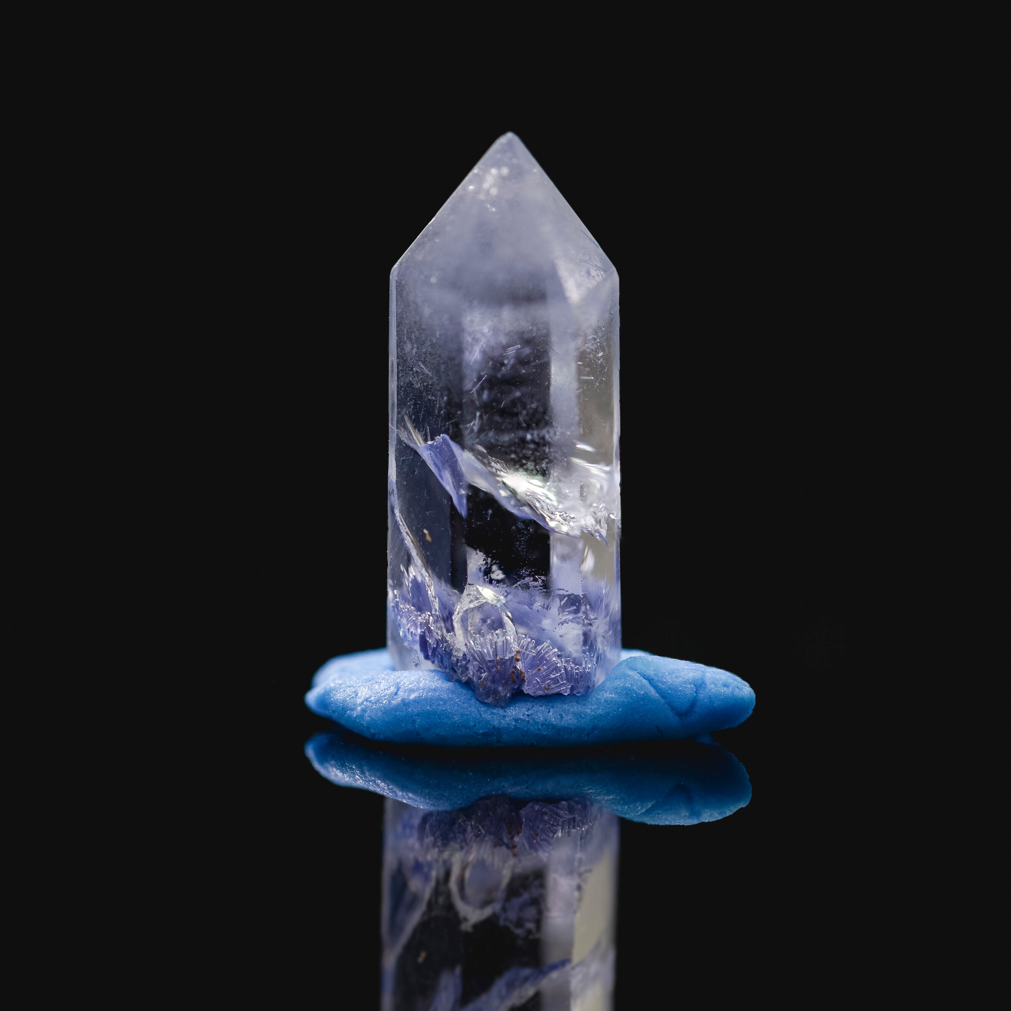 このデュモルチェライトインクォーツ、透明感が拔群ですので、濃い色の微針状結晶の集合体が見てやすい。雪山の麓には氷花芝生を閉じ込めたよう、虹がある。とても綺麗ですね。