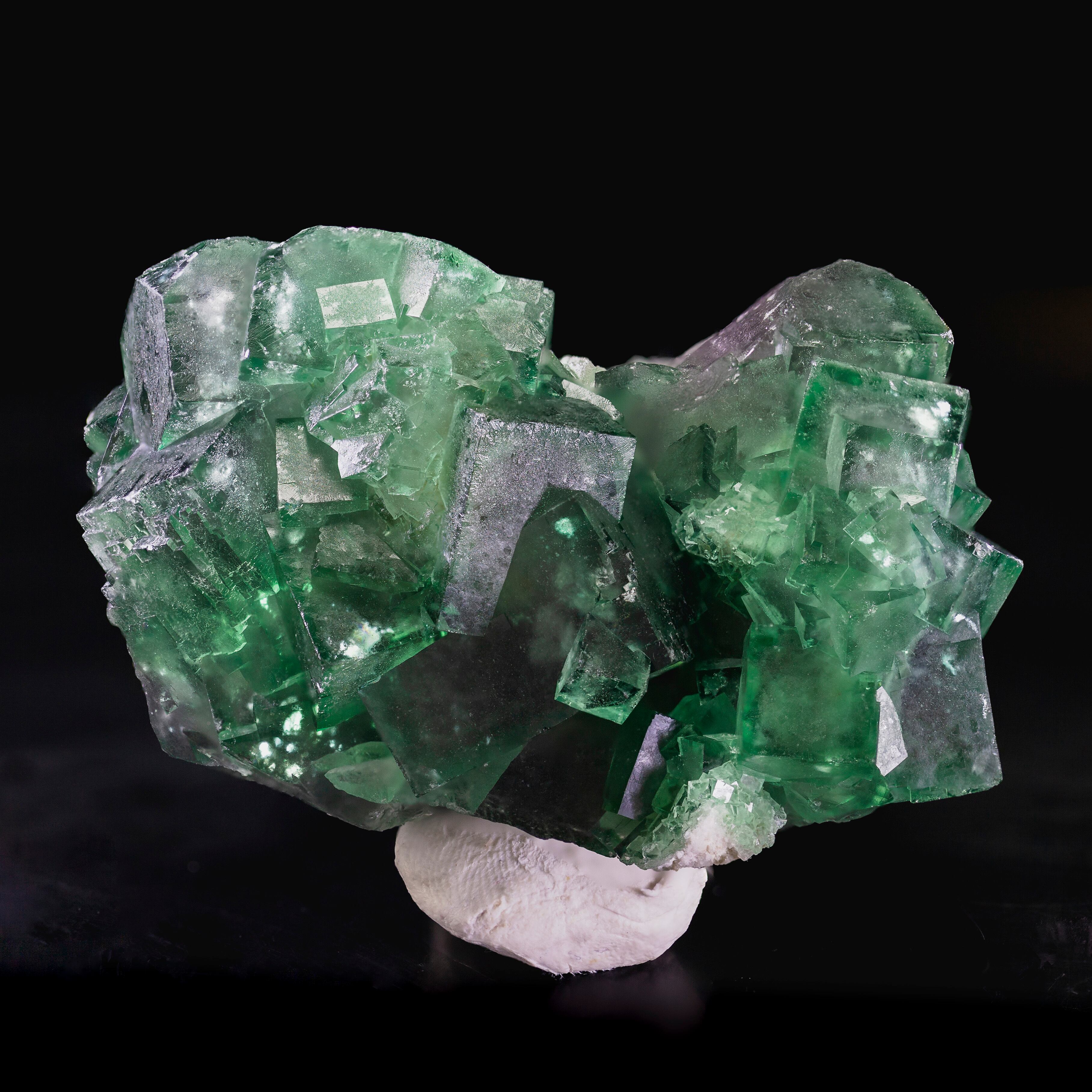 母岩に深いグリーンのフローライトが非常にクリアでテリも強い良結晶と、色々な角度から楽しめるフローライトとカルサイトの共生標本です。非常にユニークな景色があります。
