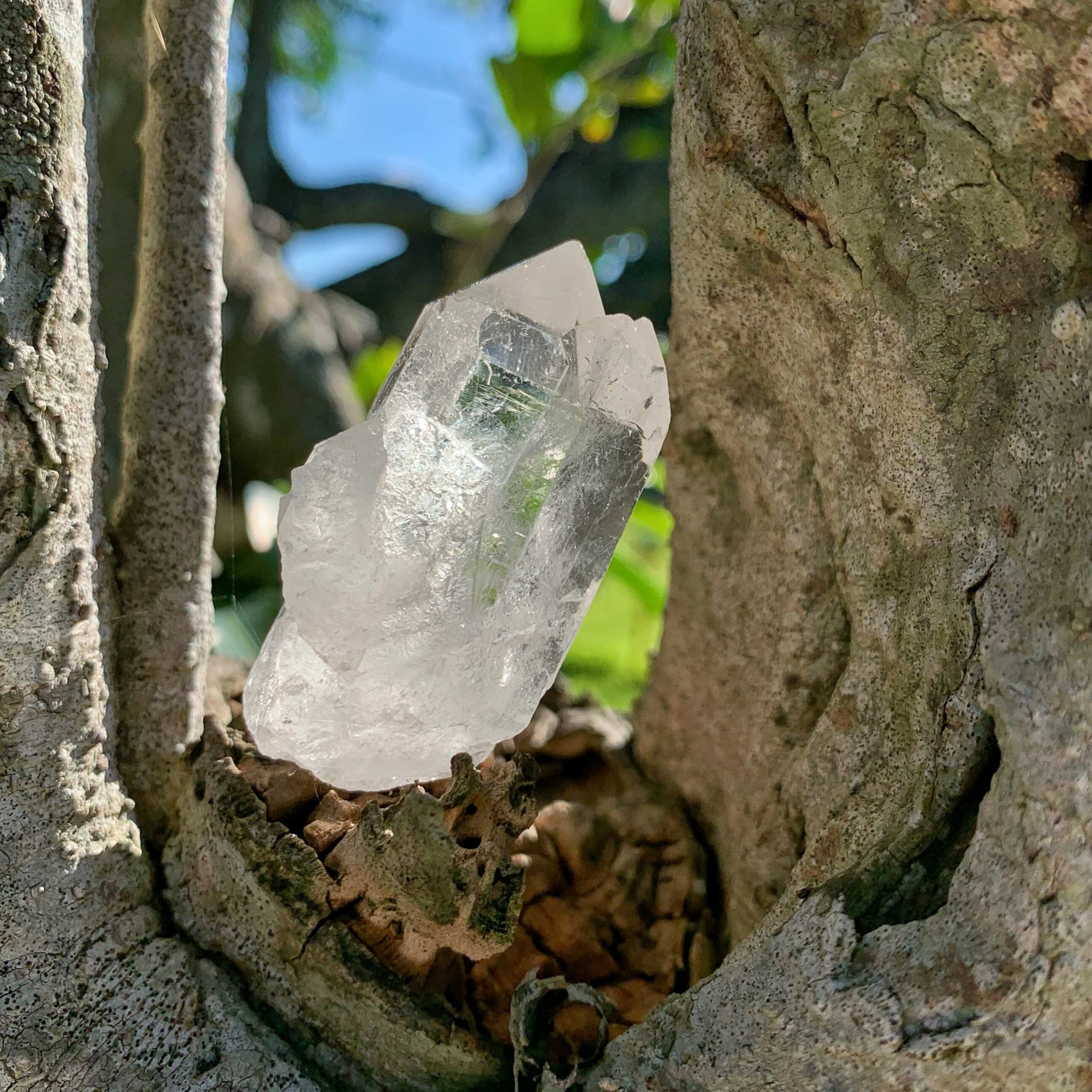 透明感がある、大変美しいクォーツになっております。二つのクリスタルが共通(一つ)の根元から成長し、虹ちゃんがあります、美しい姿に。