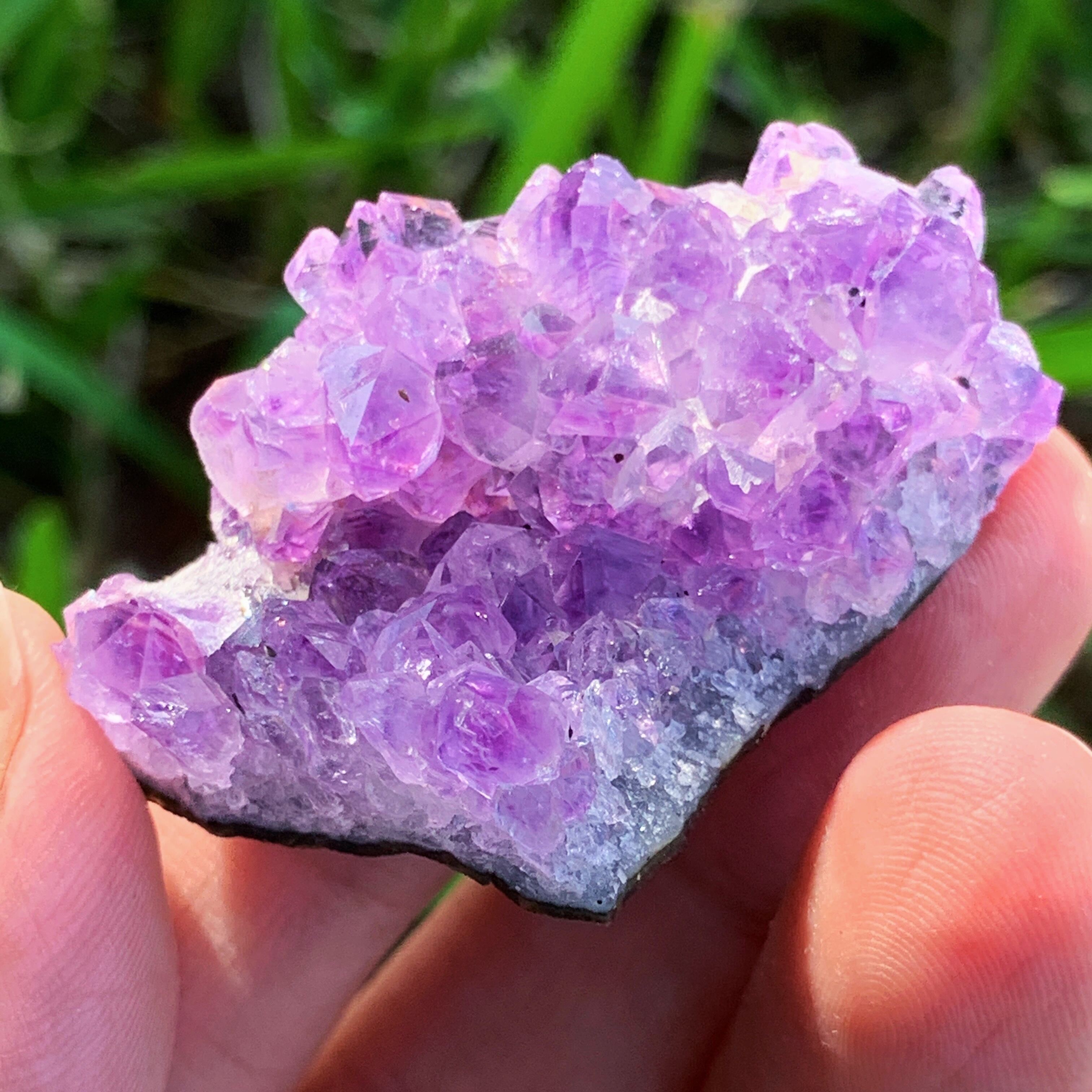 高貴で深みのある濃い紫、ウルグアイ產のアメジストのクラスターです。虹があるので、太陽の光に照らされてキラキラですね。