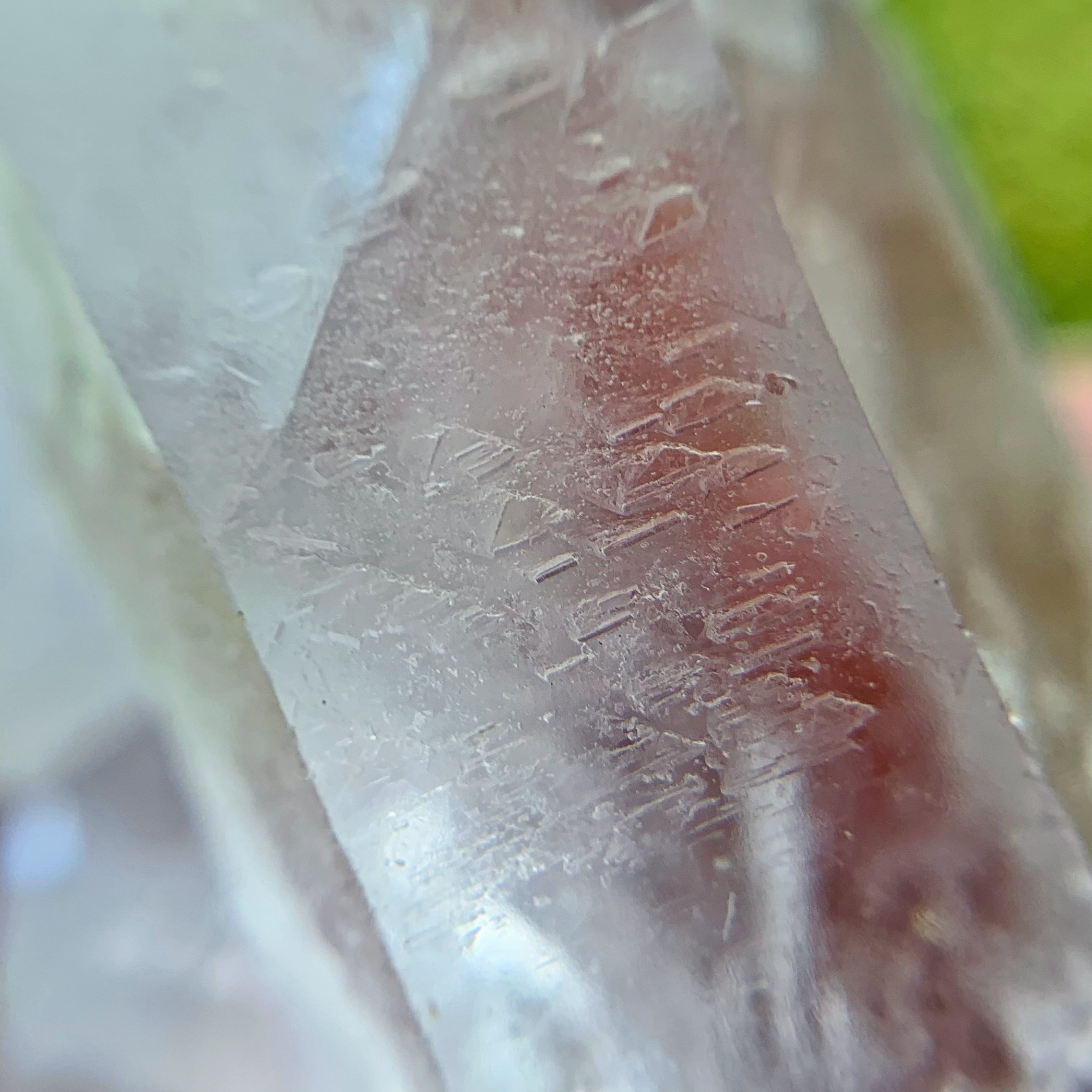 こちらクォーツには、レコードキーパー(Record Keeper)の特徴があります。水晶の表に三角形▲の凹凸が見られるものをレコードキーパーといいます。レムリアンシード(レムリア水晶)の特徴もある、バーコードのように横に伸びる線のことて、神聖な輝きを放ちます。とても希少です。