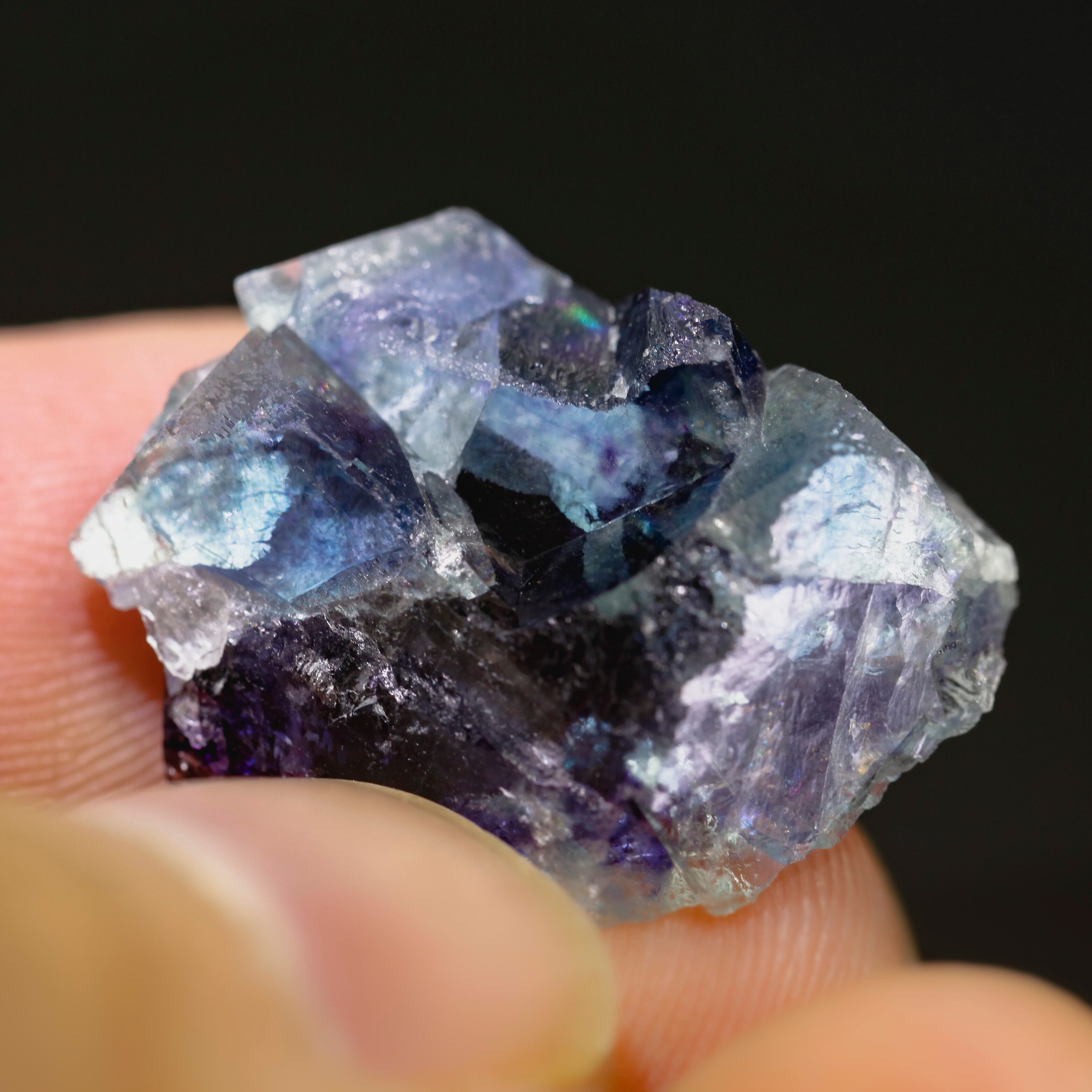 所々に虹が見られます!濃いブルーとパープルブルーの結晶はクリアでテリが強く、これがまた透けて不思議な雰囲気を見せてくれる得難い鉱物標本です。とっても綺麗です。
