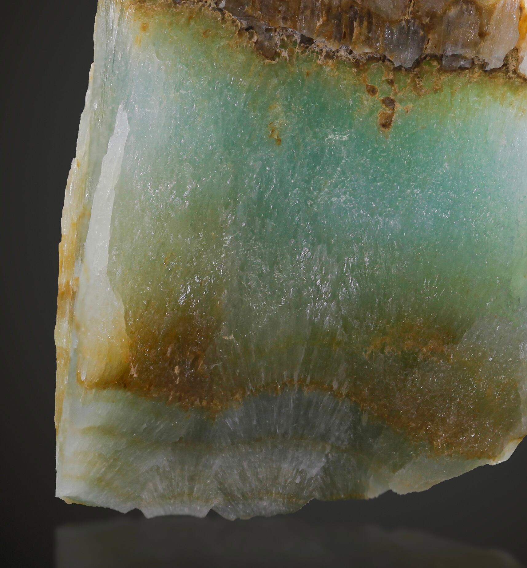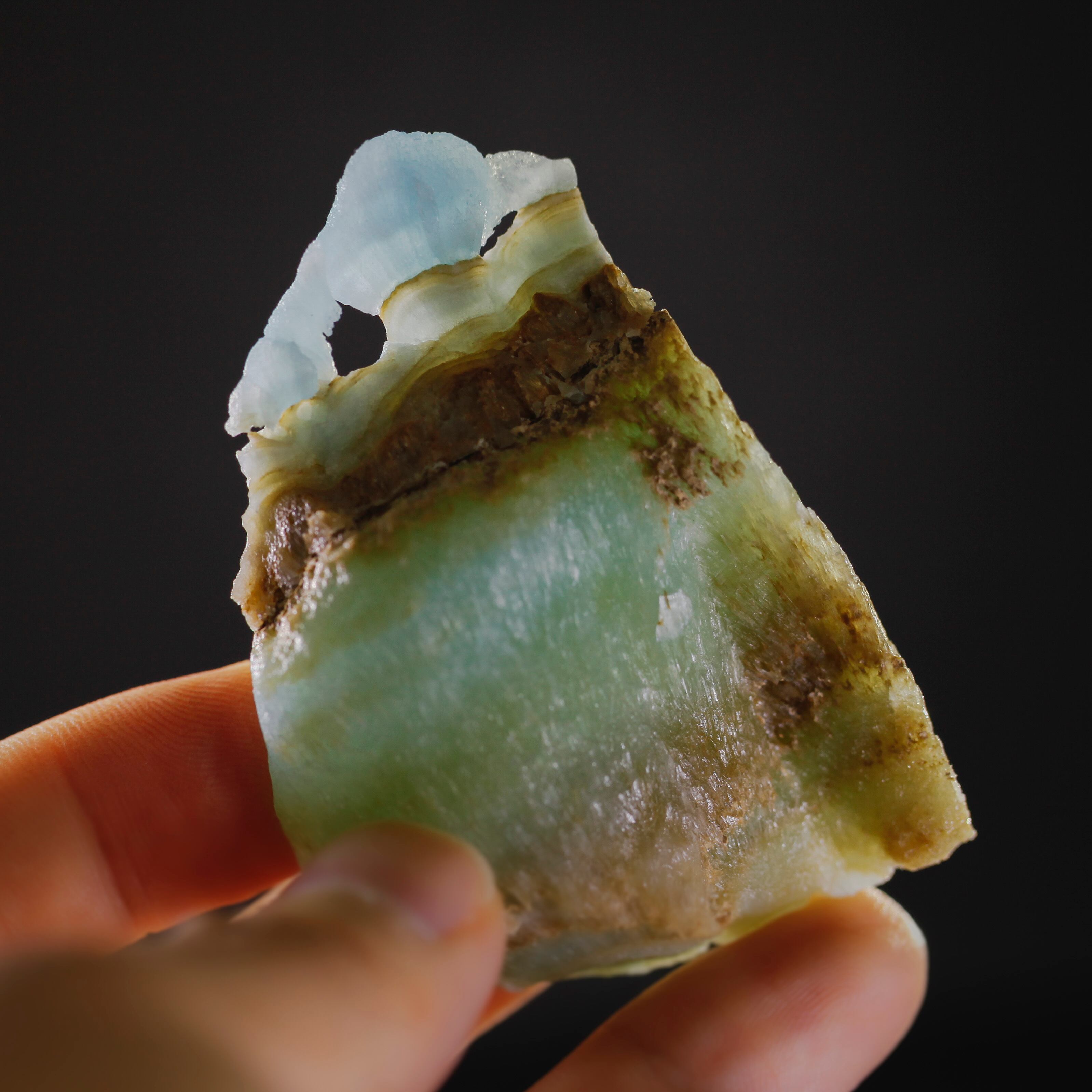極地の氷山のような涼やかな青。針状の結晶が集まるがそのまま凍ったかのようでもある。茶色と青色の断面は、溶けていく極地を思わせる。本当にトップの氷がもう溶けないように願います。唯一無二の形は持つに値する。こちらはブルーアランゴナイト。