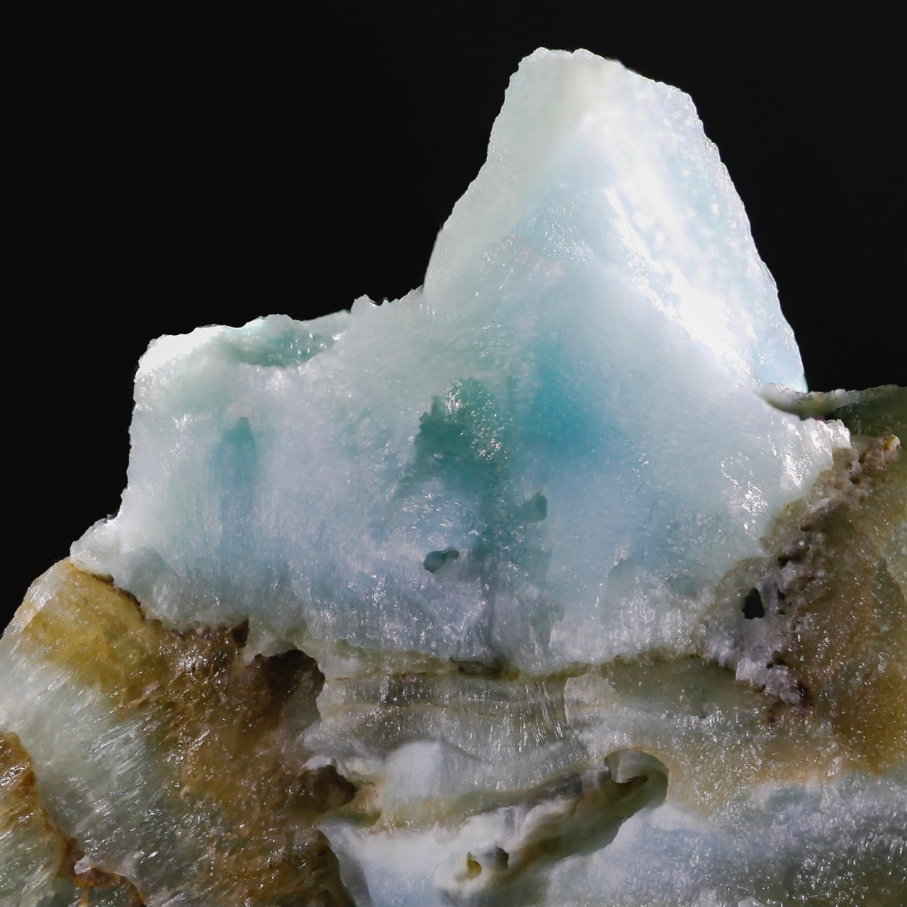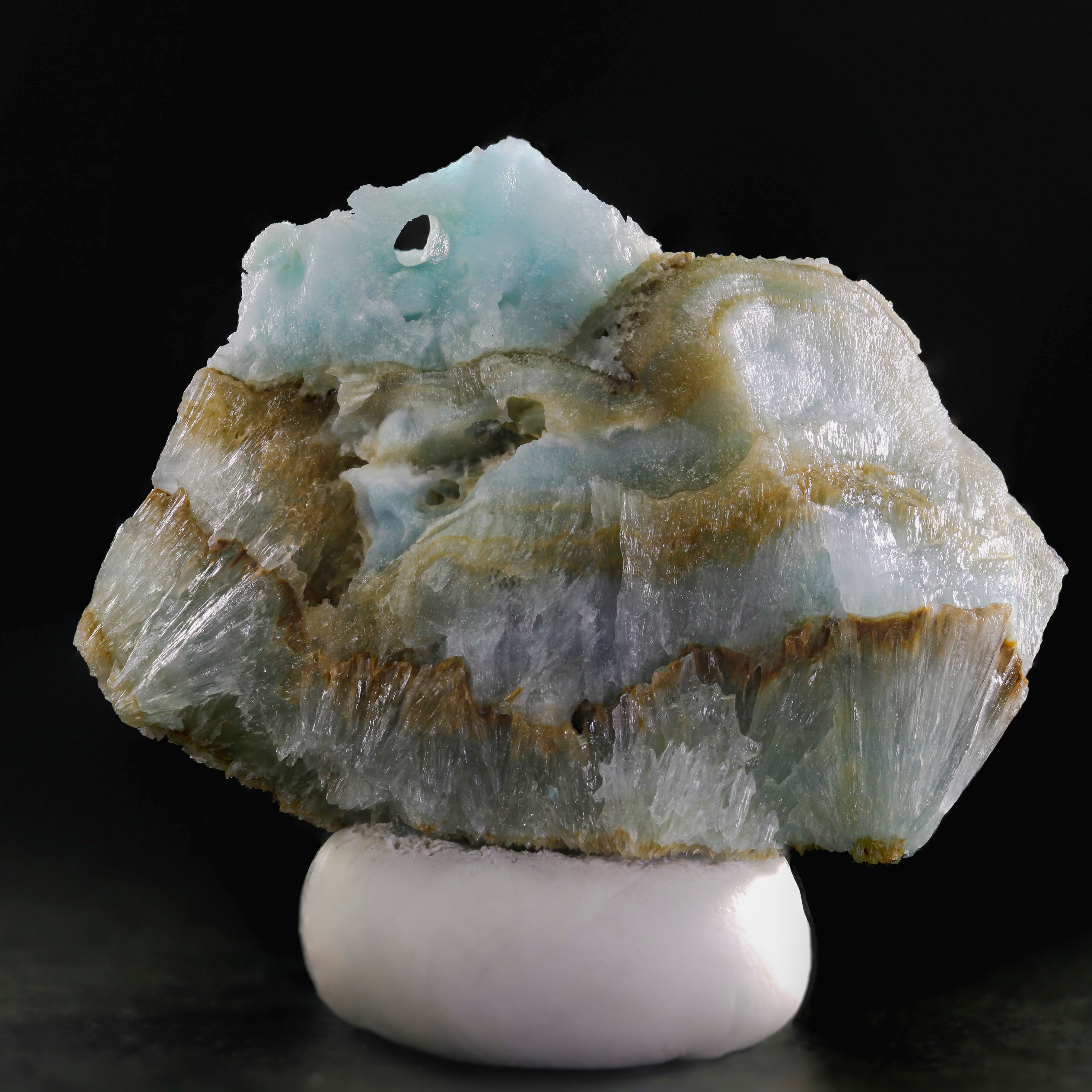 美しい淡い青色で、世界にも誇れる大きな「霰(あられ)石」だ。アラゴナイトの色は白色、褐色、黄色、ブルー色などがありますが、こういう綺麗なブルー色はすごく希少です。久しぶりに良質なブルーアラゴナイトを手に入りました。美しさともに一級品の鉱物標本。