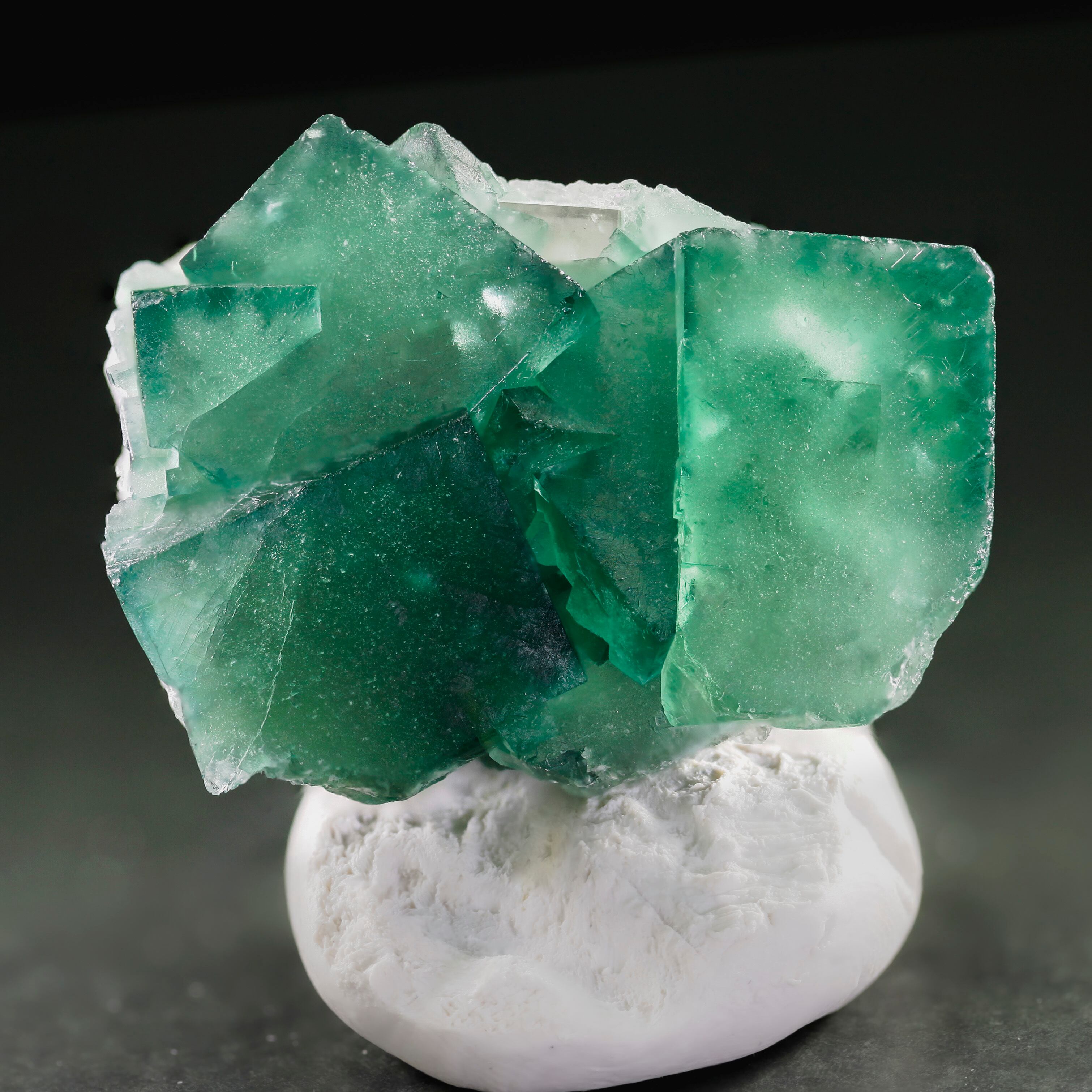 マダガスカル產の母岩に深いグリーンのフローライトが非常にクリアでテリも強い良結晶と、色々な角度から楽しめるフローライトとカルサイトの共生鉱物標本です。非常にユニークな景色があります。