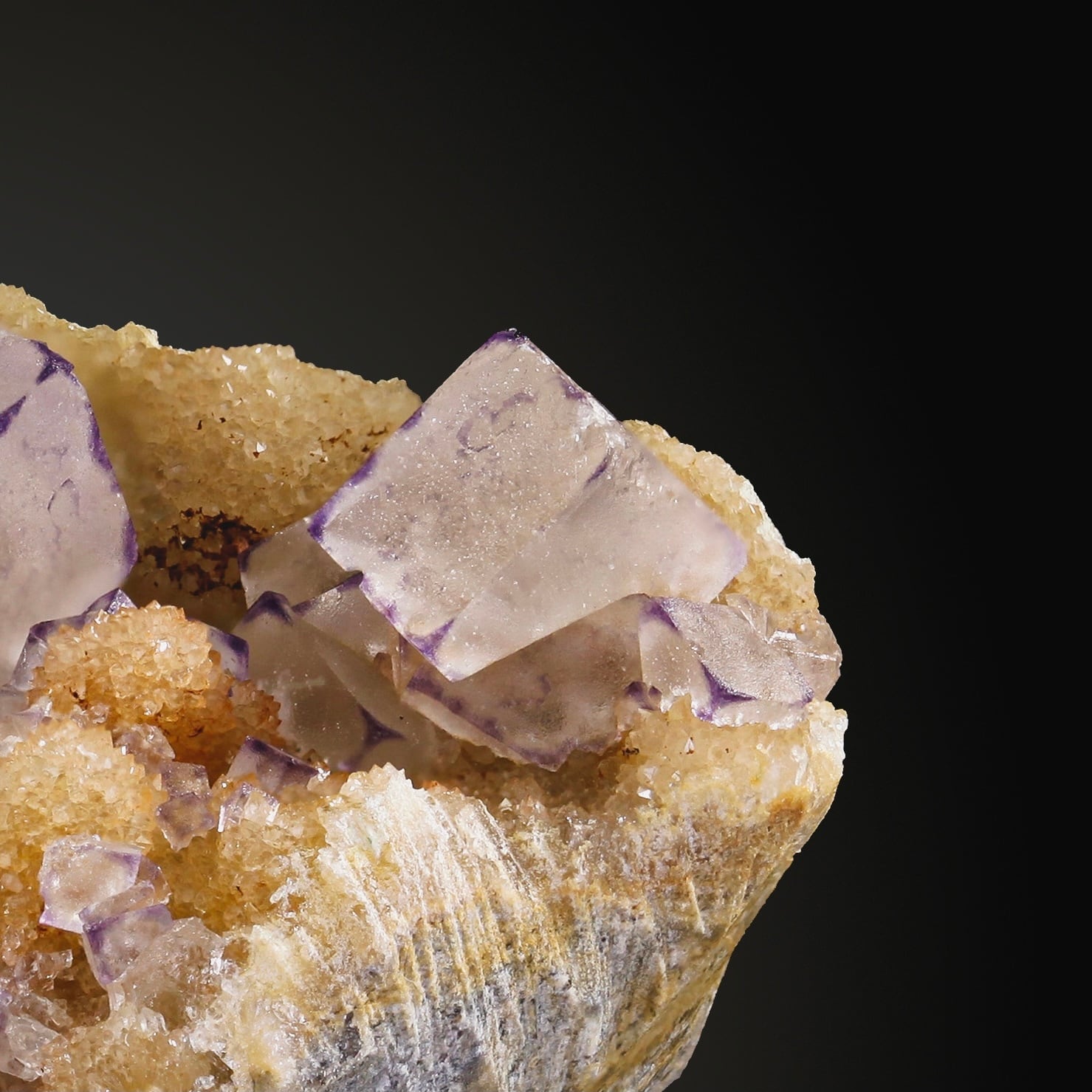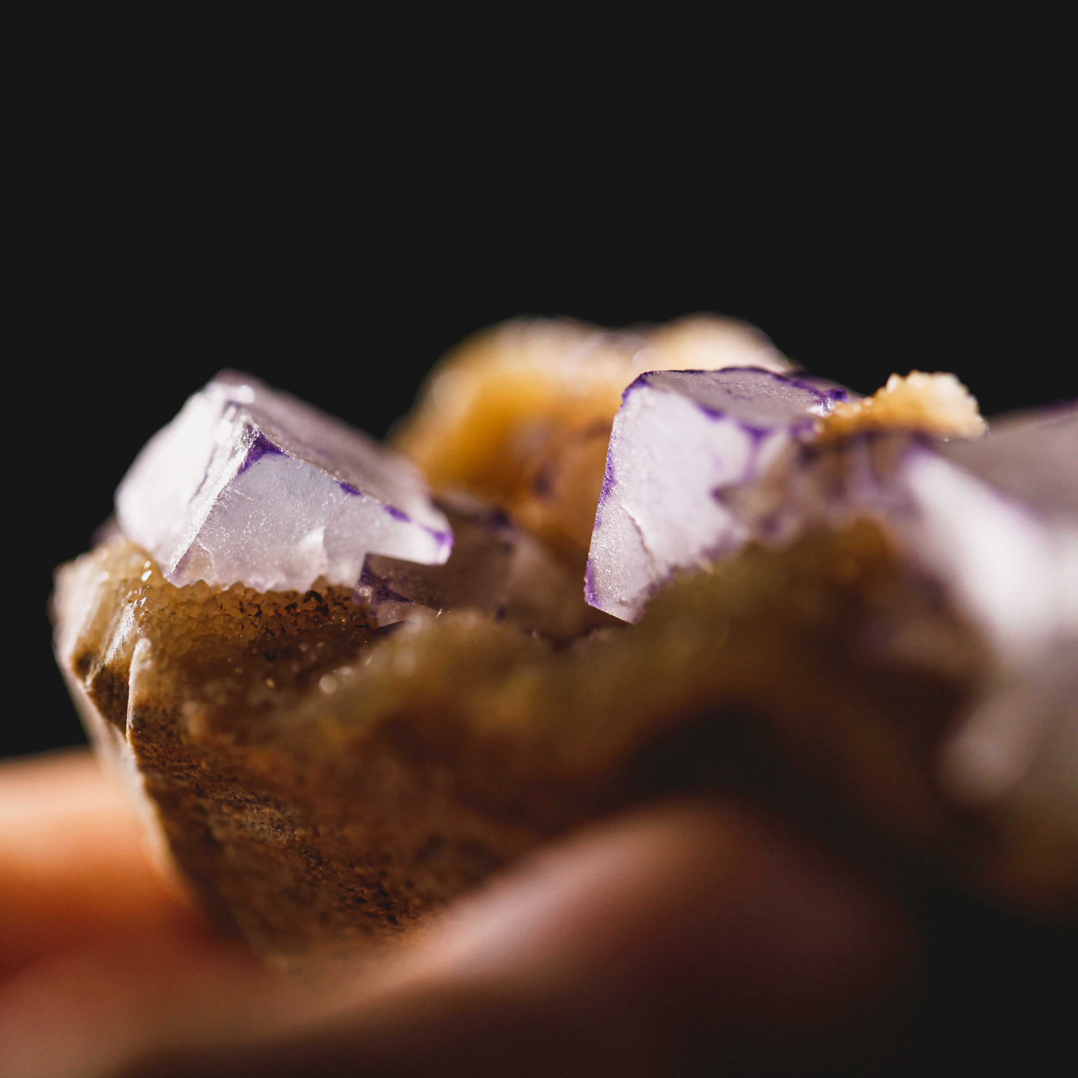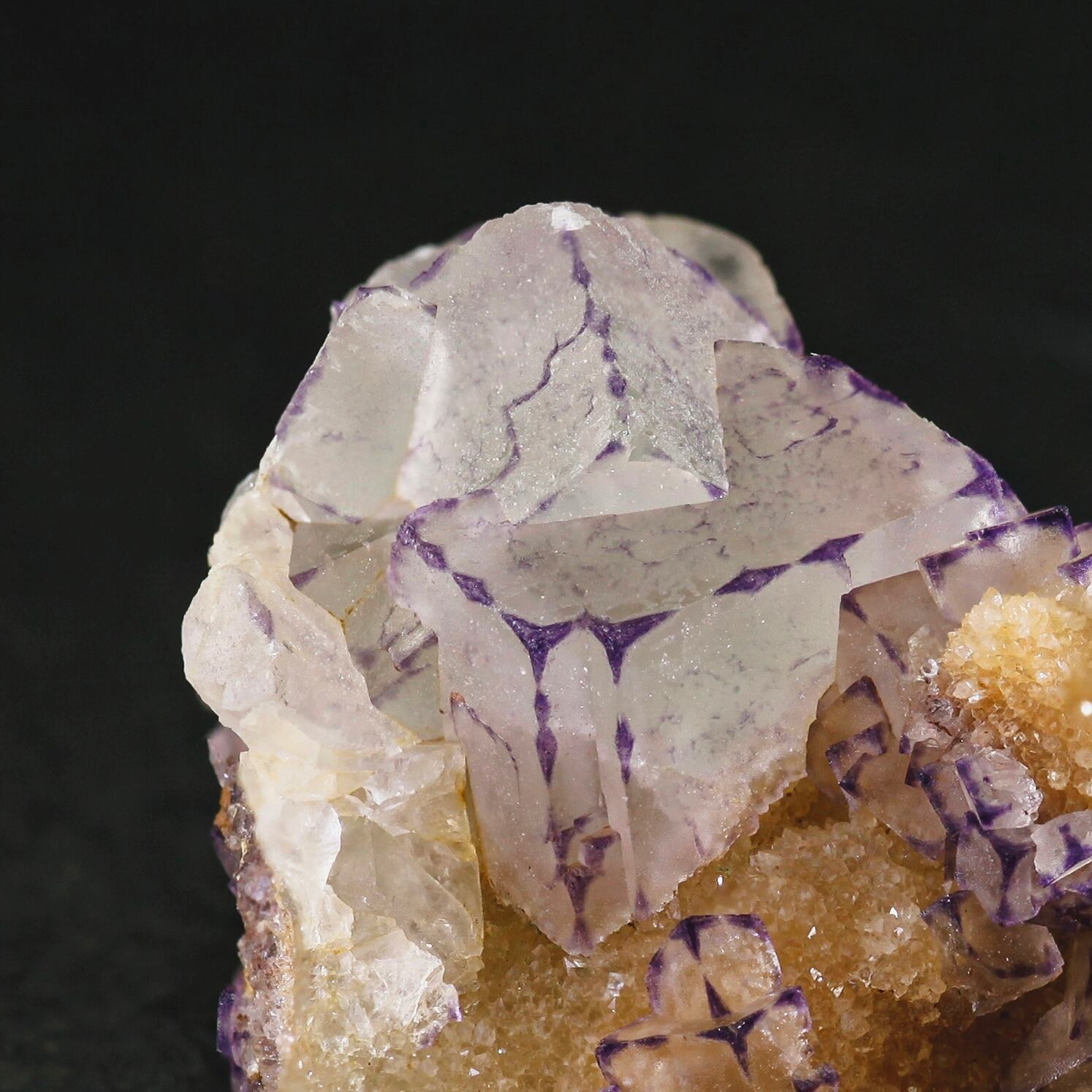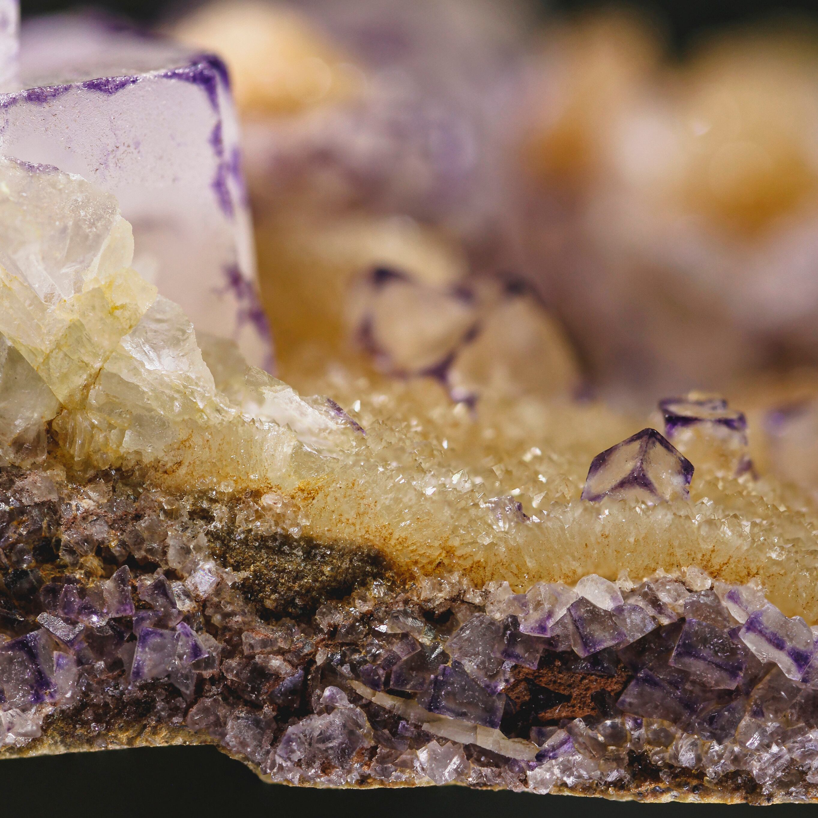 こちらは、フローライトとイエローバライトとカルサイトとの共生鉱物標本。四角の濃いパープルと間中淡い色が綺麗なフローライトなっています。別名はQRコード蛍石も言われています。