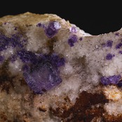 こちらは、カルサイト上にイットロ蛍石が共生しています。 やや褐色気味のカルサイトの花畑に、可愛らしいイットロ蛍石がひょこひょこと芽を出した、趣があります。イットロ蛍石は濃いパープルでして、良いテリが確認できます。いろいろなサイズのイットロ蛍石があります。小さい蛍石の部分は、水粉画のように見えます。とても細かな結晶ですが、ルーペなどでご覧頂くと繊細で美しい世界が見えます。写真と動画では蛍光の様子もあわせてご覧頂けます。