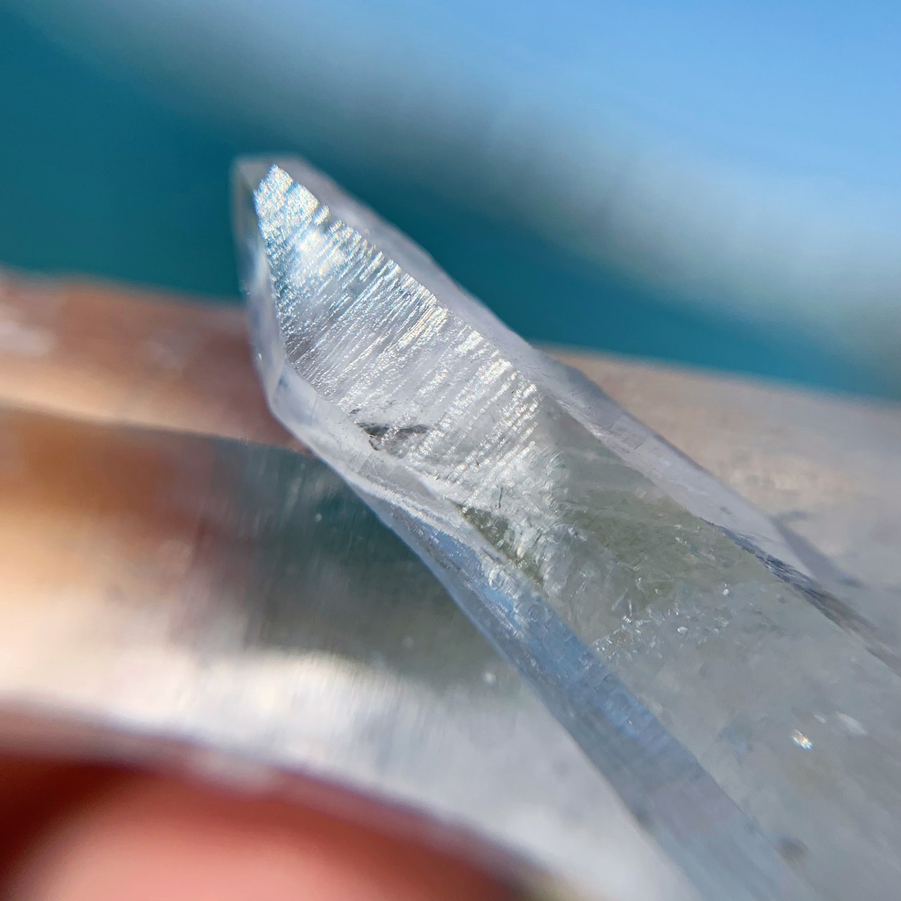 横に刻まれたものバーコードが見える。神聖な輝きを放ちます。小さなクォーツが横から生えてきて、親子のようです。とても綺麗ですね!