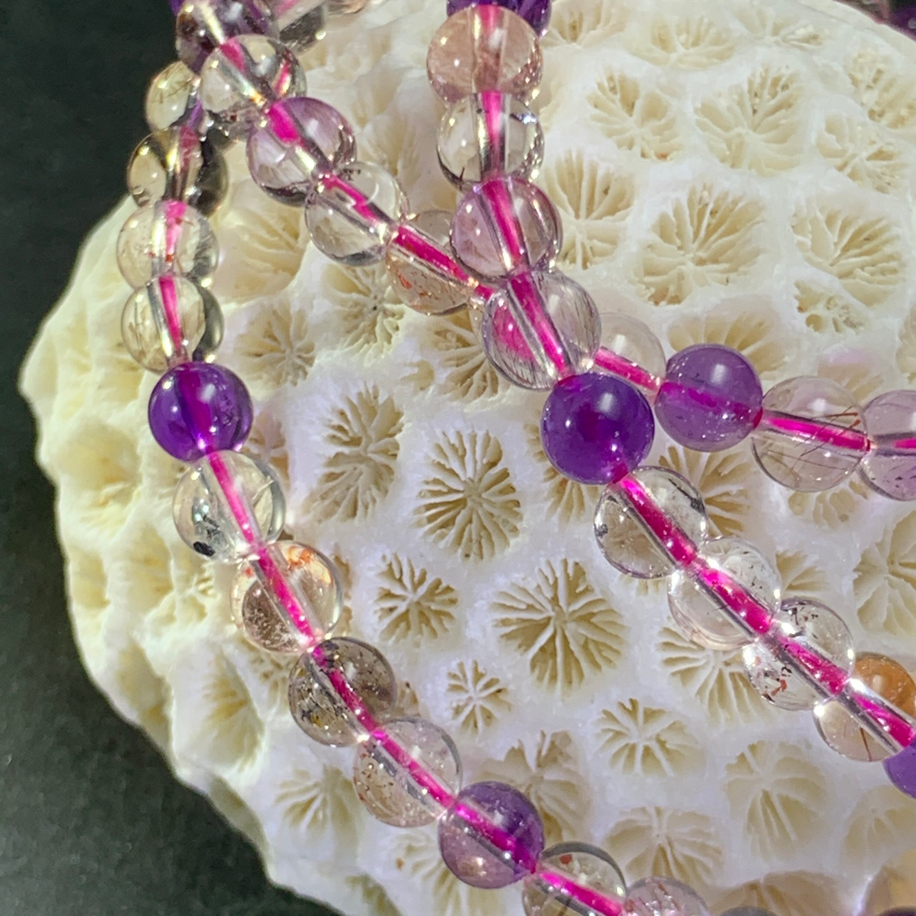再入荷の3連宝石質のスーパーセブンです。透明感高い、内包物が大変美しいです。小粒ですが、玉には虹があります。