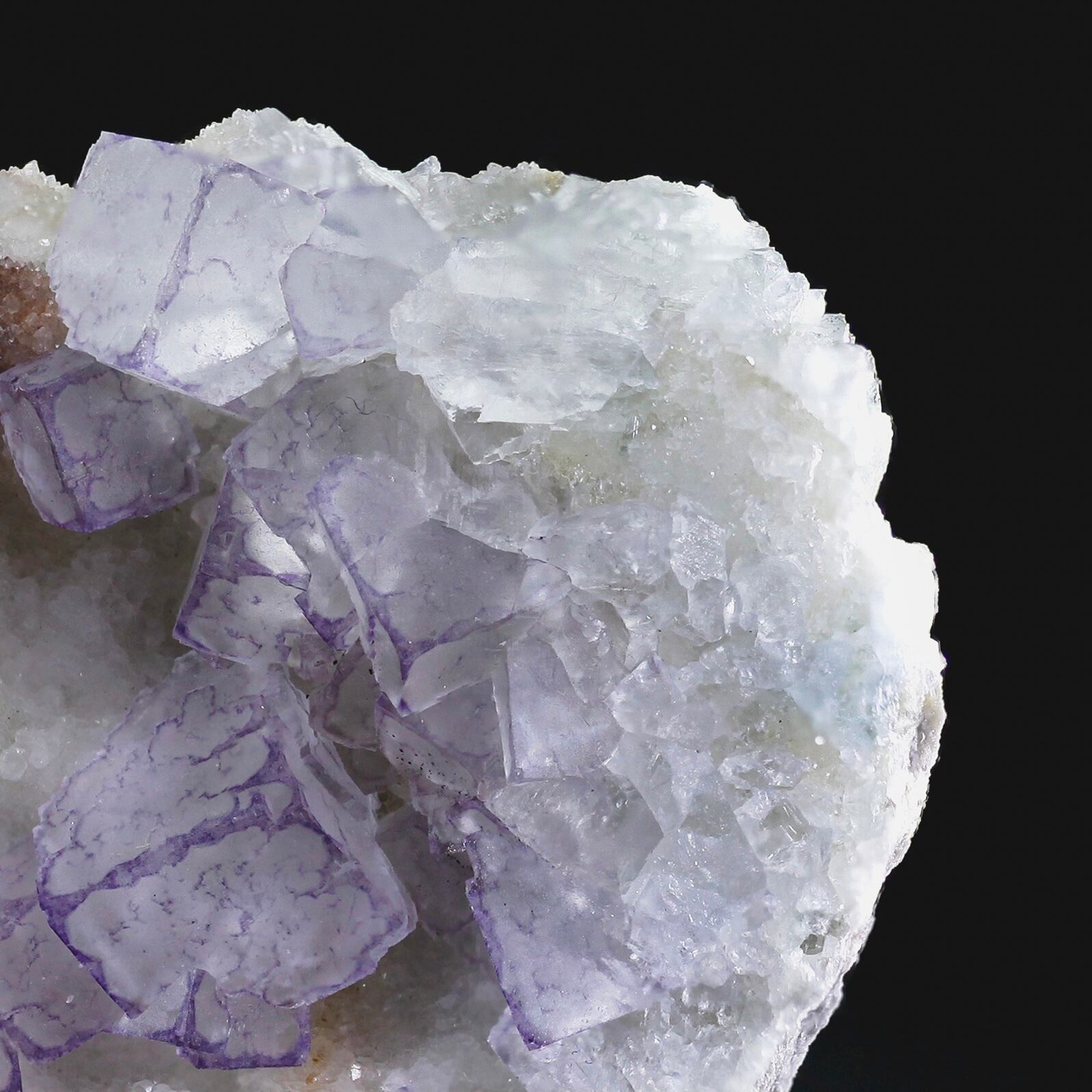 こちらは、フローライトとバライトとカルサイトとの共生鉱物標本。四角の濃いパープルと間中淡い色が綺麗なフローライトなっています。別名はQRコード蛍石も言われています。
