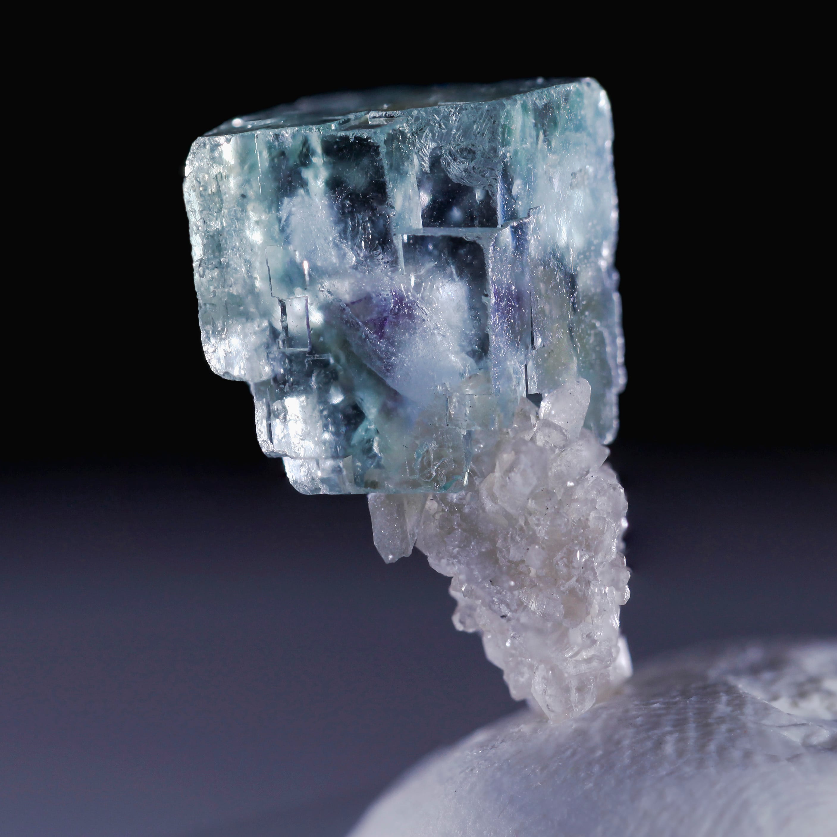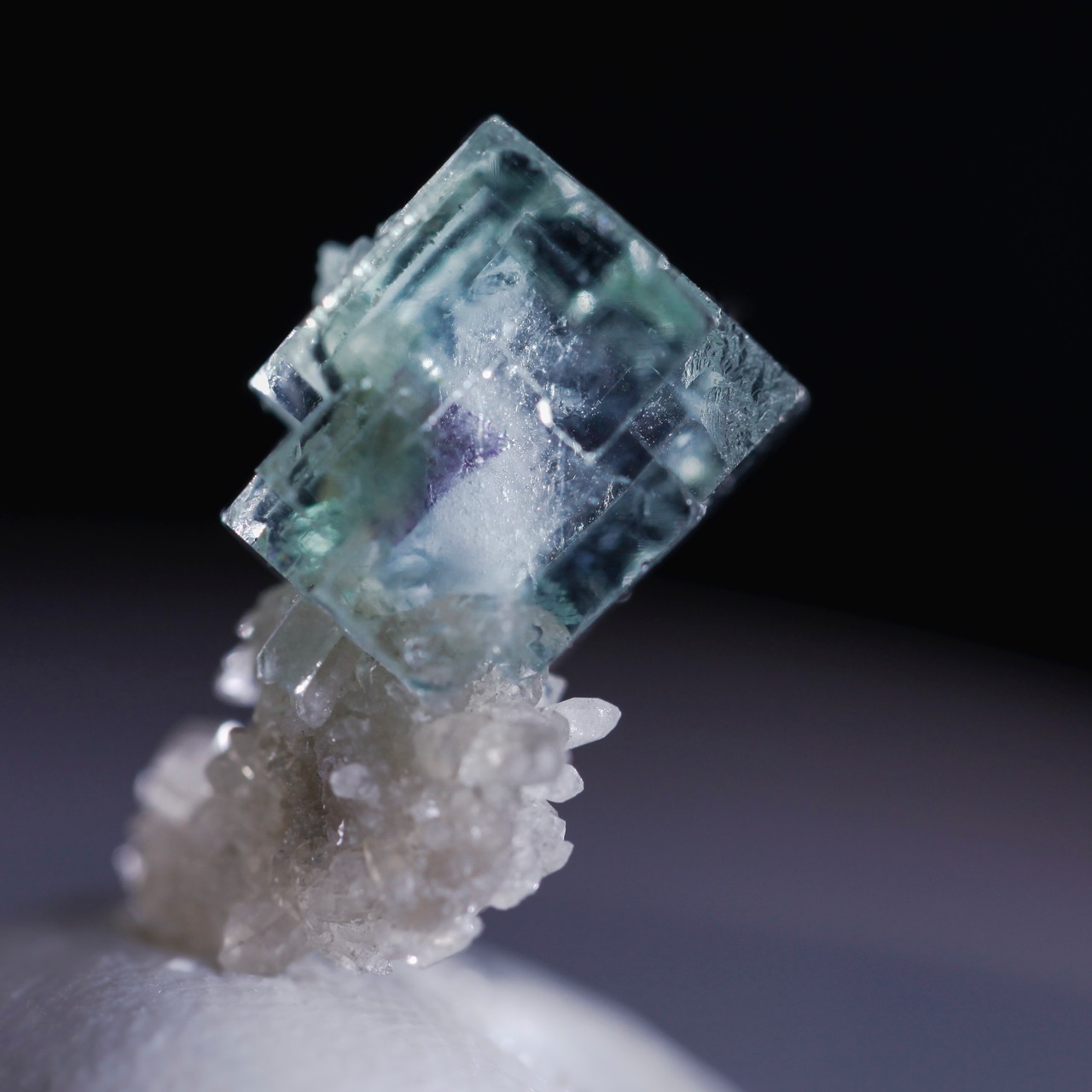 こちらはミニクレアなフローライトとカルサイト共生した鉱物標本です。淡いグリーンのフローライトにテリが良好で、見応えのあるステップ状結晶が透過光で美しいの色合いが確認出来ます。鉱物標本の体積は小さいですが、蛍石結晶の割合は70%を占めています、とっても綺麗です。