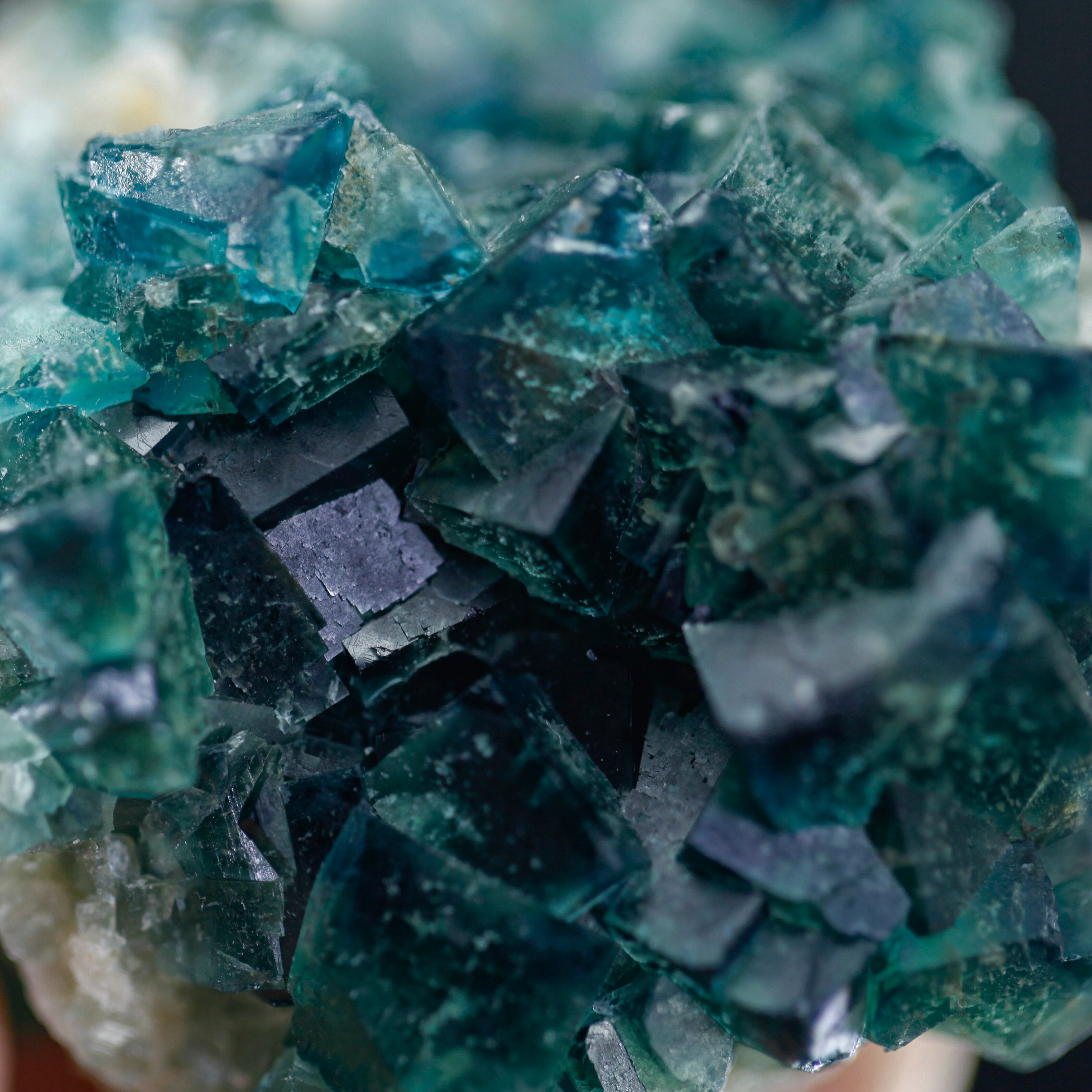 アフリカ、Northern Cape產のフローライトとカルサイトの共生鉱物標本です。母岩にフローライトの両方には2種類の緑色が分けられるあります。片側は明るいの青緑色、小さい結晶クラスターで,もう一方は黄緑色、結晶大きいである。非常にユニークな景色があります。非常にクリアでテリも強い良結晶と、色々な角度から楽しめる。