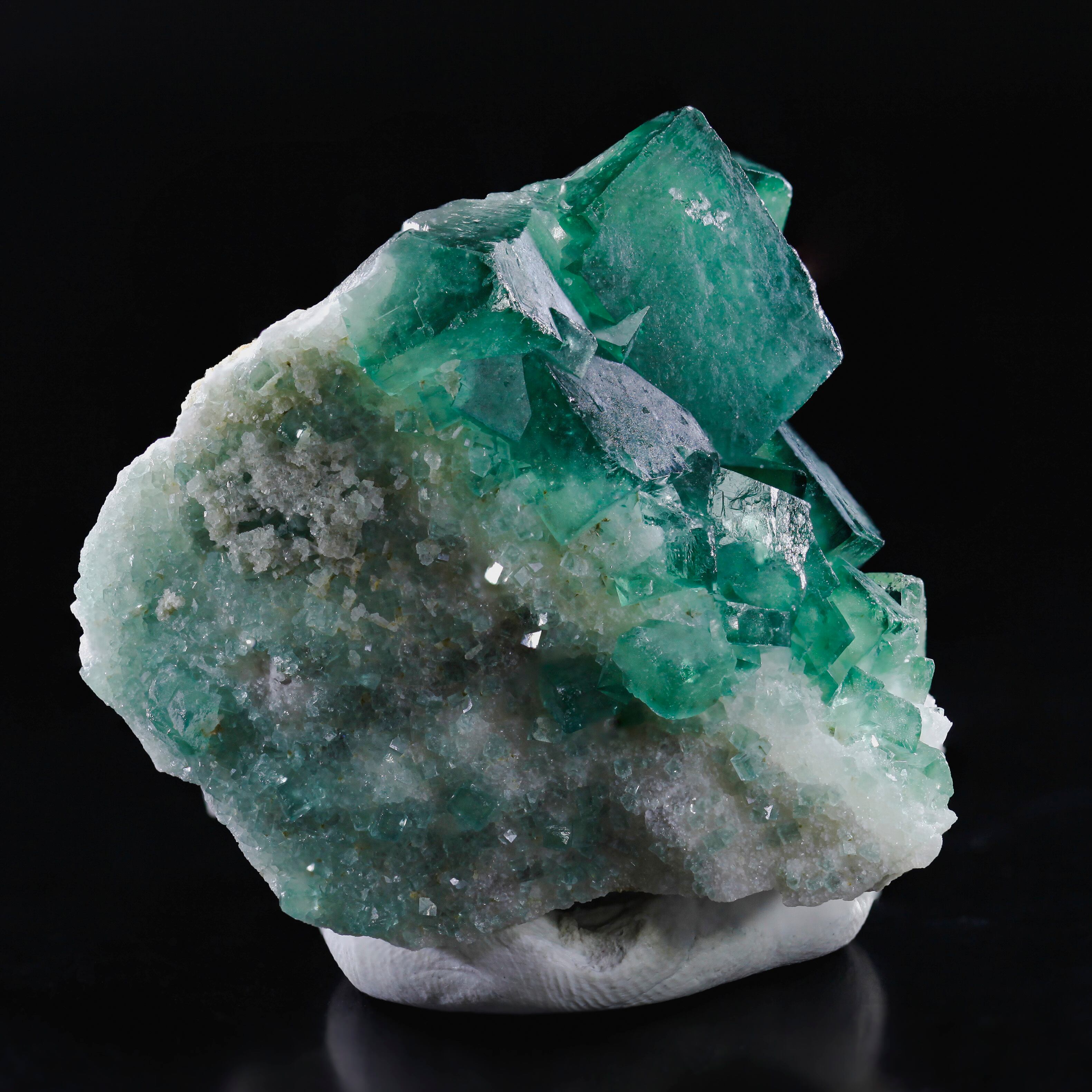 マダガスカル產の母岩に深いグリーンのフローライトが非常にクリアでテリも強い良結晶と、色々な角度から楽しめるフローライトとカルサイトの共生鉱物標本です。非常にユニークな景色があります。