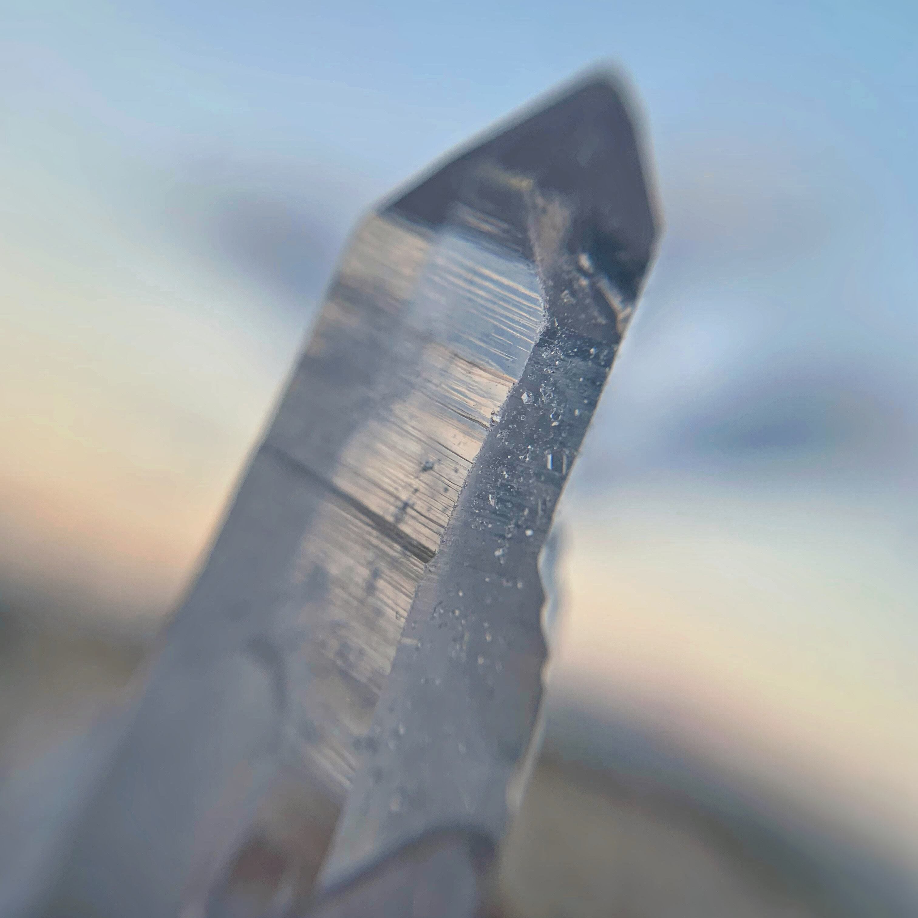 希少価値の高い照り艶良く、氷のような美しさを纏い、水晶の先端部に小さい三角形▲の凹凸、横にも刻まれたものバーコード(レコードキーパー)が見える。神聖な輝きを放ちます。