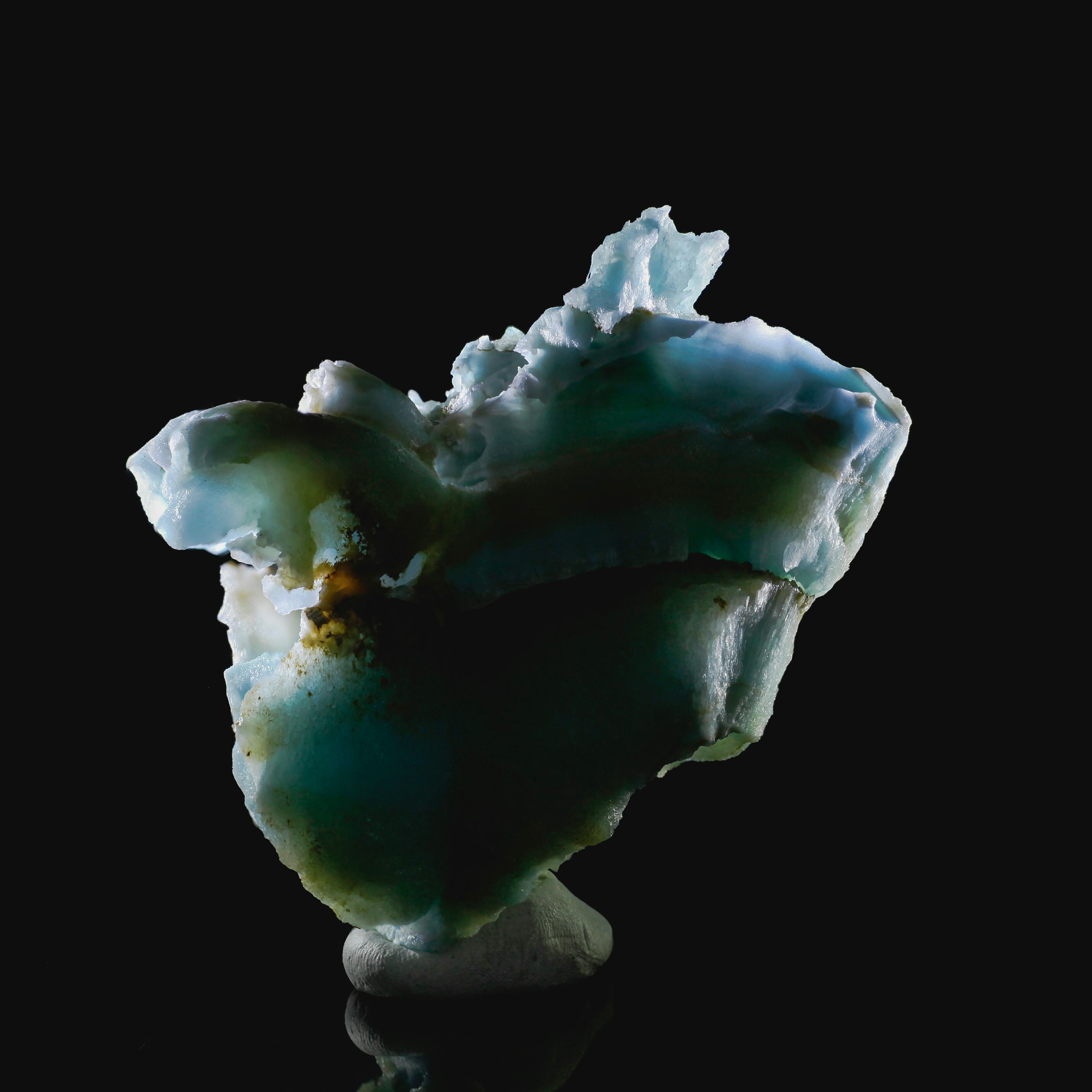極地の氷山のような涼やかな青。母岩には薄いブルー結晶がそのまま凍ったかのよう。唯一無二の形は持つに値する。こちらはブルーアランゴナイト。
