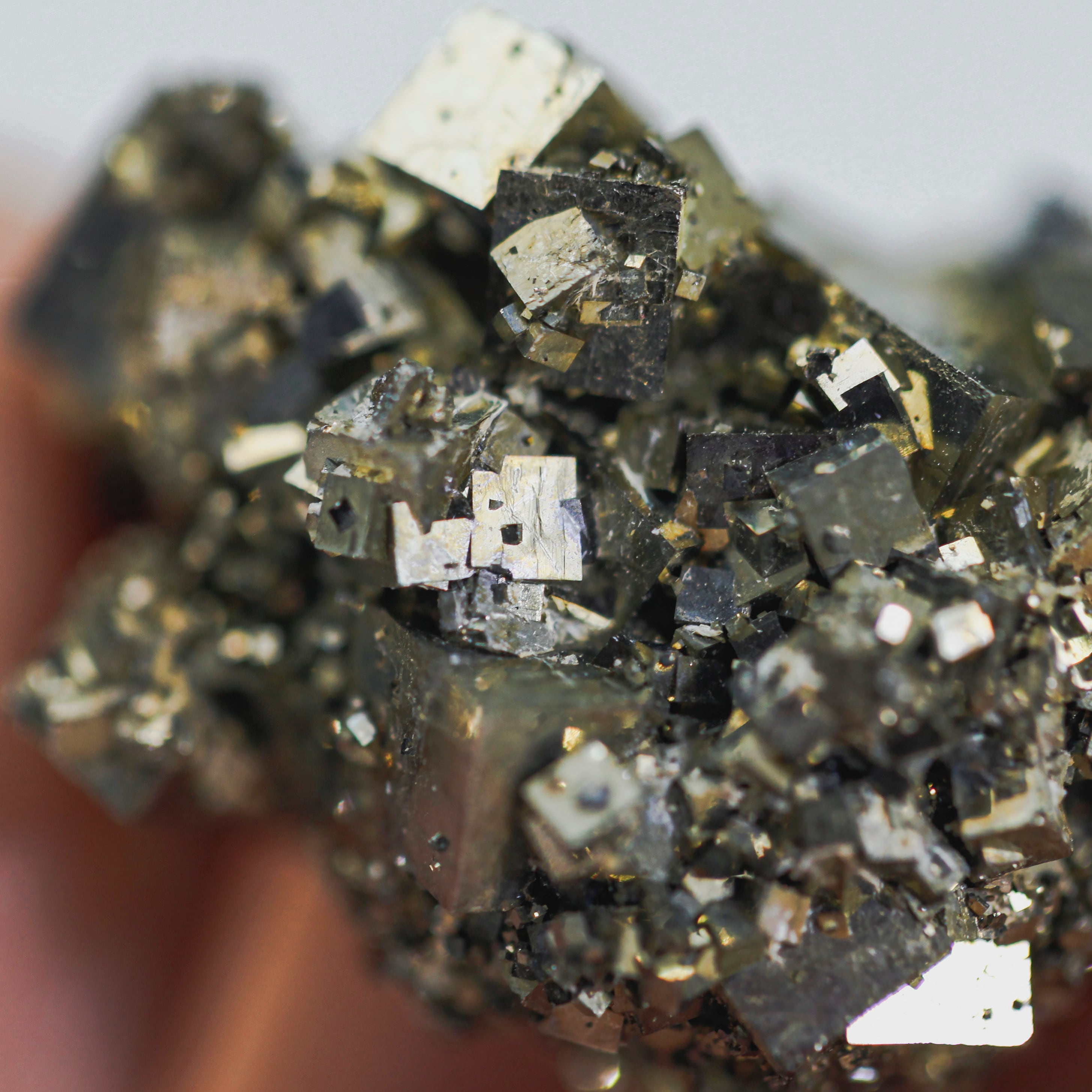 中国産パイライトの結晶は美しく、金属光沢な大きいも、小さいも、沢山の立方体が組み合わせって、面白い形になります。