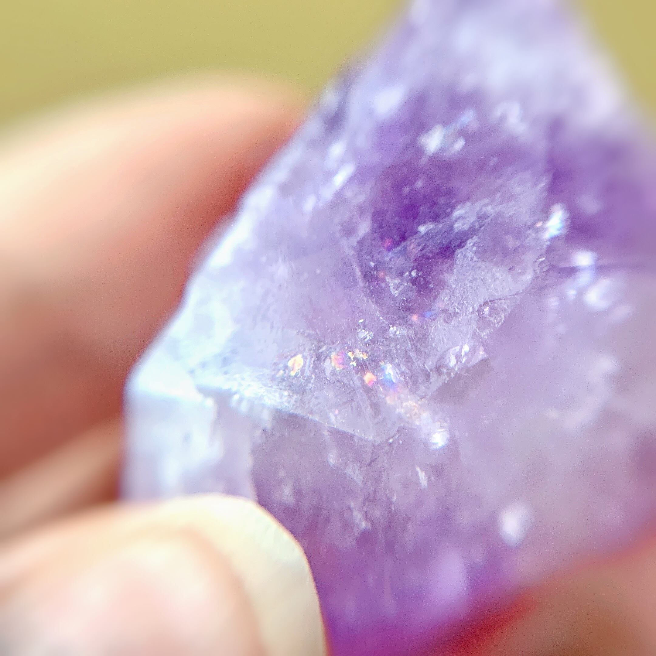 可愛いアメジスト クラスター。虹がありますので、太陽の光に照らされて、キラキラした、パープルもピンクパープルになって、とても綺麗ですね。
