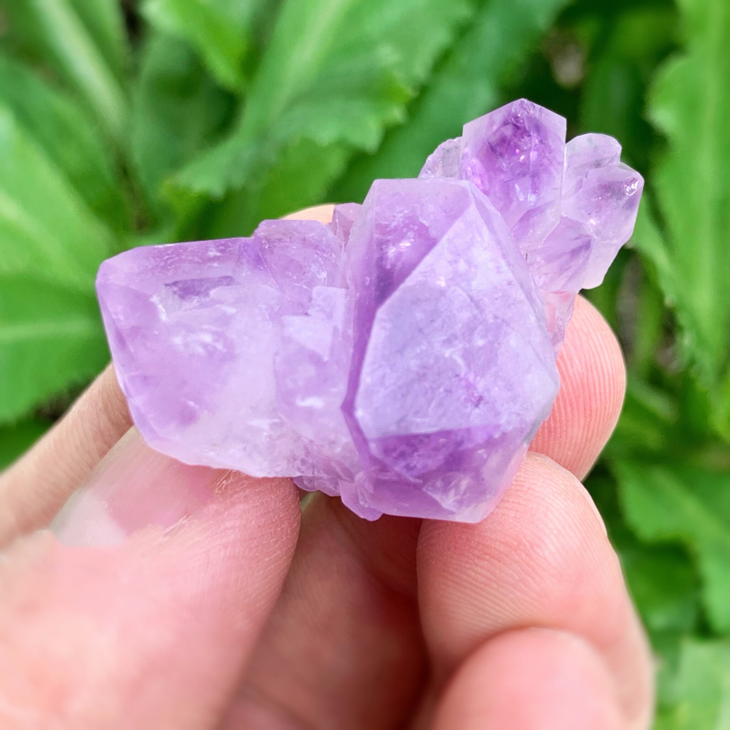 可愛いアメジスト クラスター。虹がありますので、太陽の光に照らされて、キラキラした、パープルもピンクパープルになって、とても綺麗ですね。