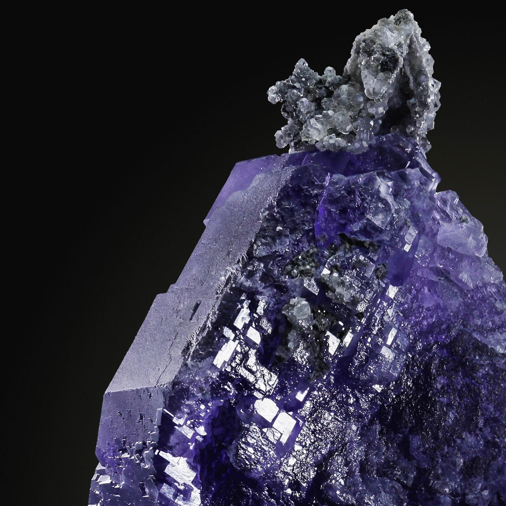 こちらは厚いフローライトの鉱物標本です。厚み約15mmの深いパープルのフローライトは薄い母岩に包まれている、非常にクリアでテリも強い良結晶と、透過光で美しいの色合いが確認出来ます。標本のトップにはカルサイトがいます、やまの峰のように...とっても綺麗です。