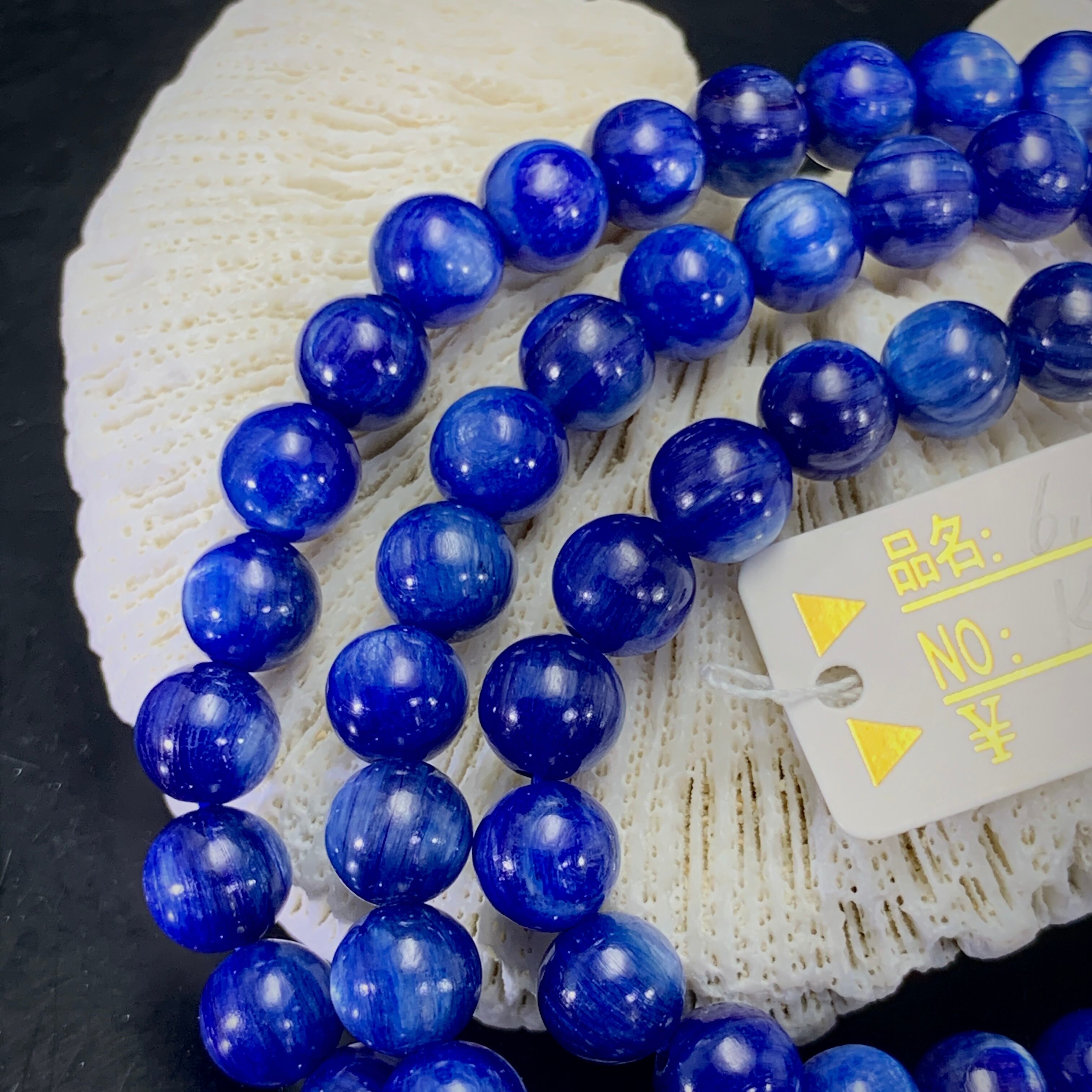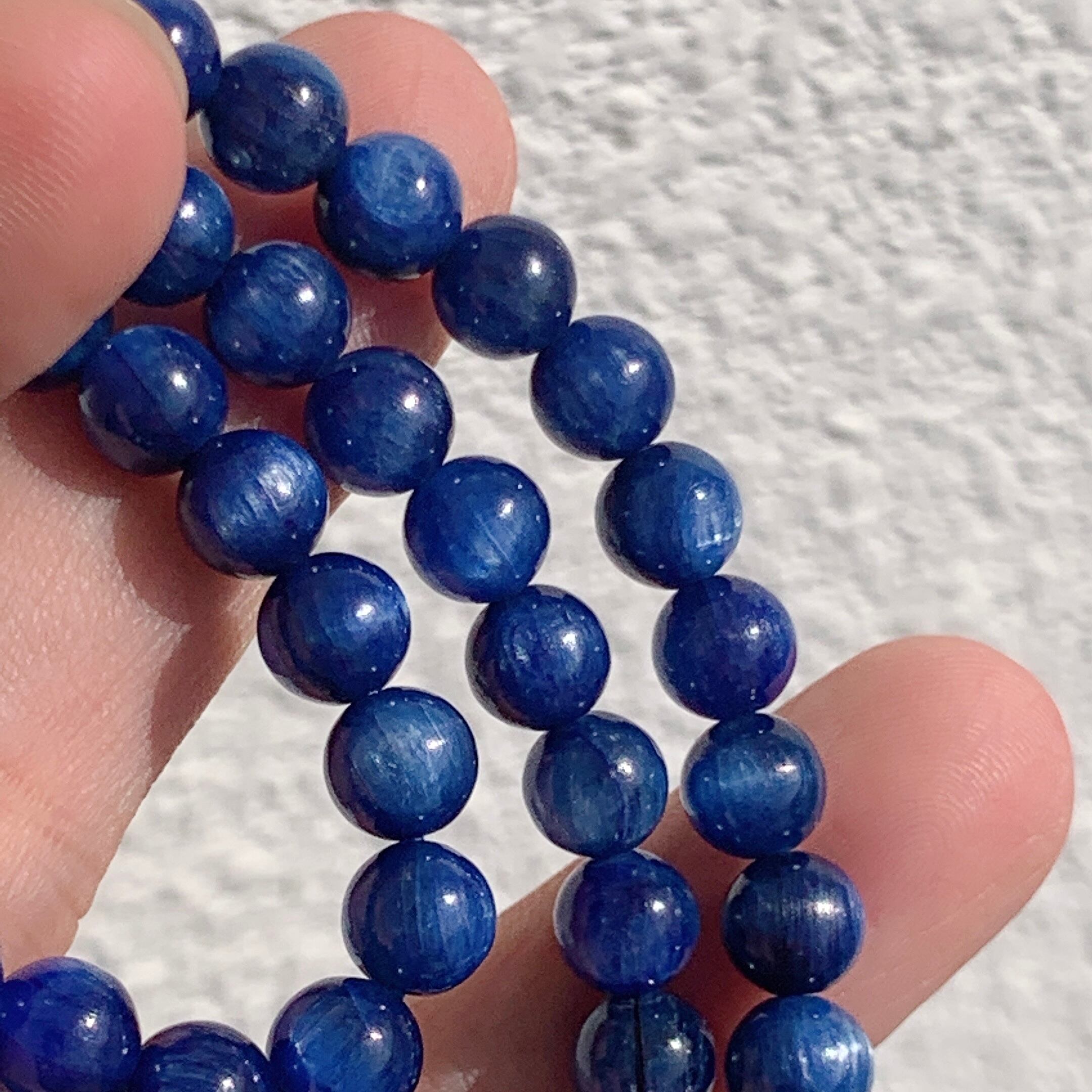 3連のカイヤナイト、ほとんどキャッツアイ効果があります。カイヤナイトの青色は、心に癒しと安らぎがもたらされます。海のような寛大な優しさと静かな力強さを秘め、 洞察力や創造力を高める効果があるともいわれています。
