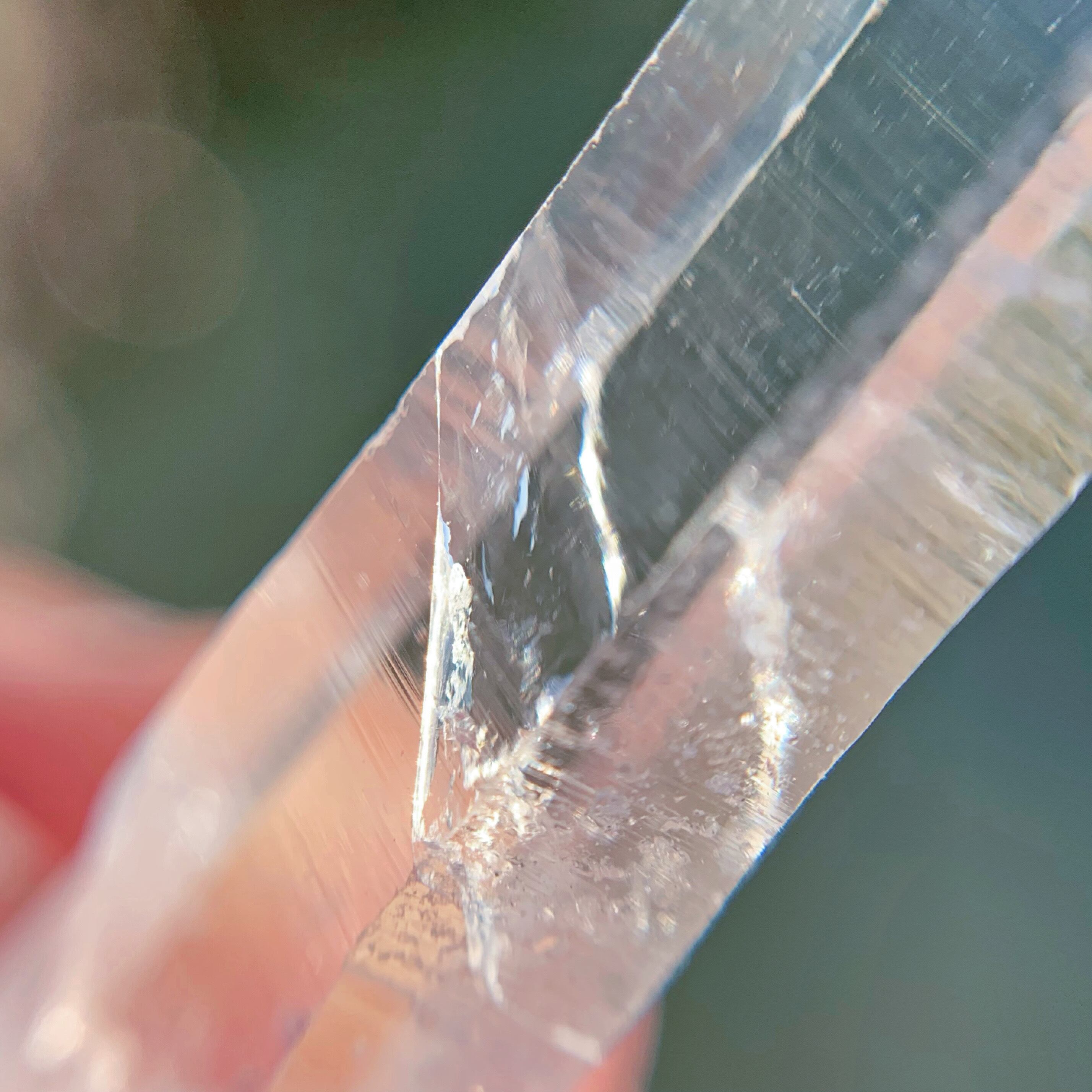 希少な透明度が高い照り艶良く、綺麗なレーザークォーツは、先端に向かって細長く長柱状に伸びた形をしている、透明度が高い。横に刻まれたものバーコード(レコードキーパー)、水晶の錐面に三角形▲の凹凸と金字塔ようの紋が見られるが見されます。神聖な輝きを放ちます。
