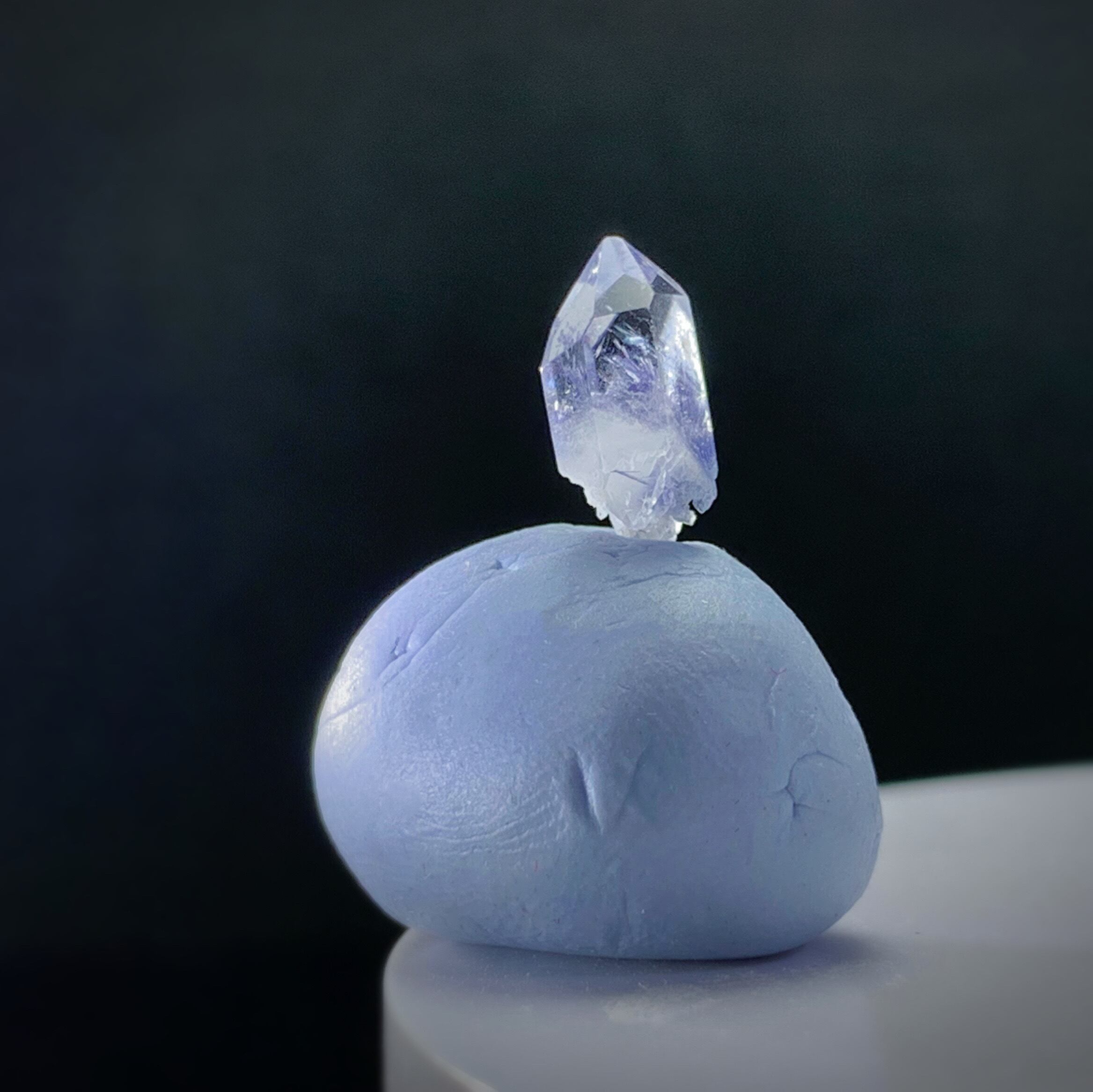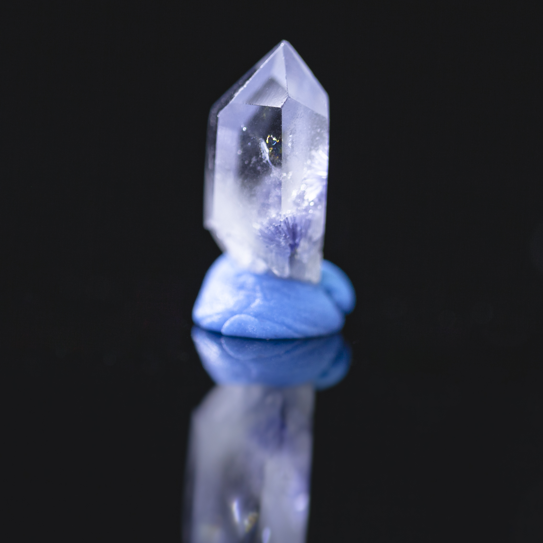 このデュモルチェライトインクォーツ、透明感が拔群ですので、濃い色の微針状結晶の集合体が見てやすい。雪山の麓には氷花芝生を閉じ込めたよう、大きな虹がある、とても綺麗ですね。