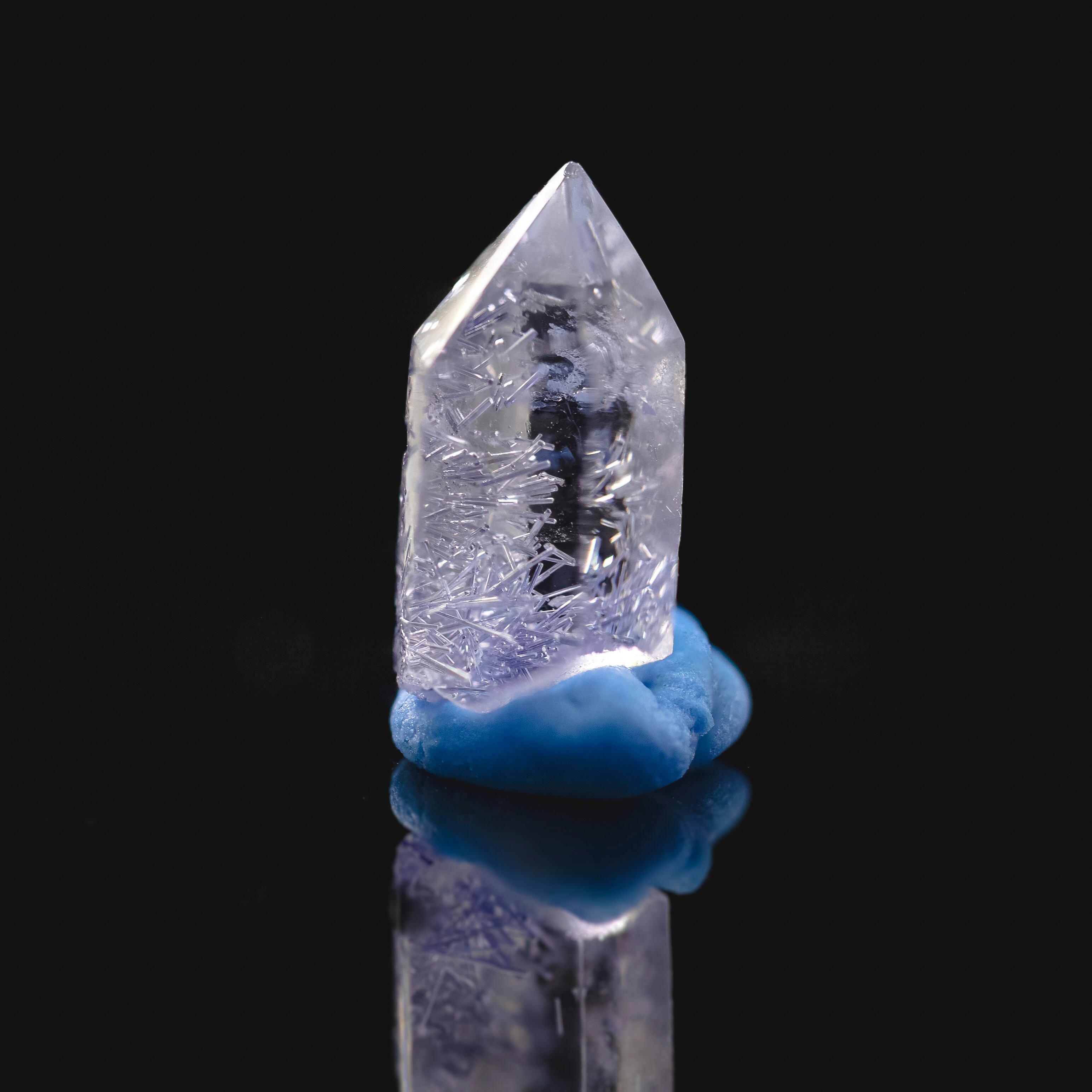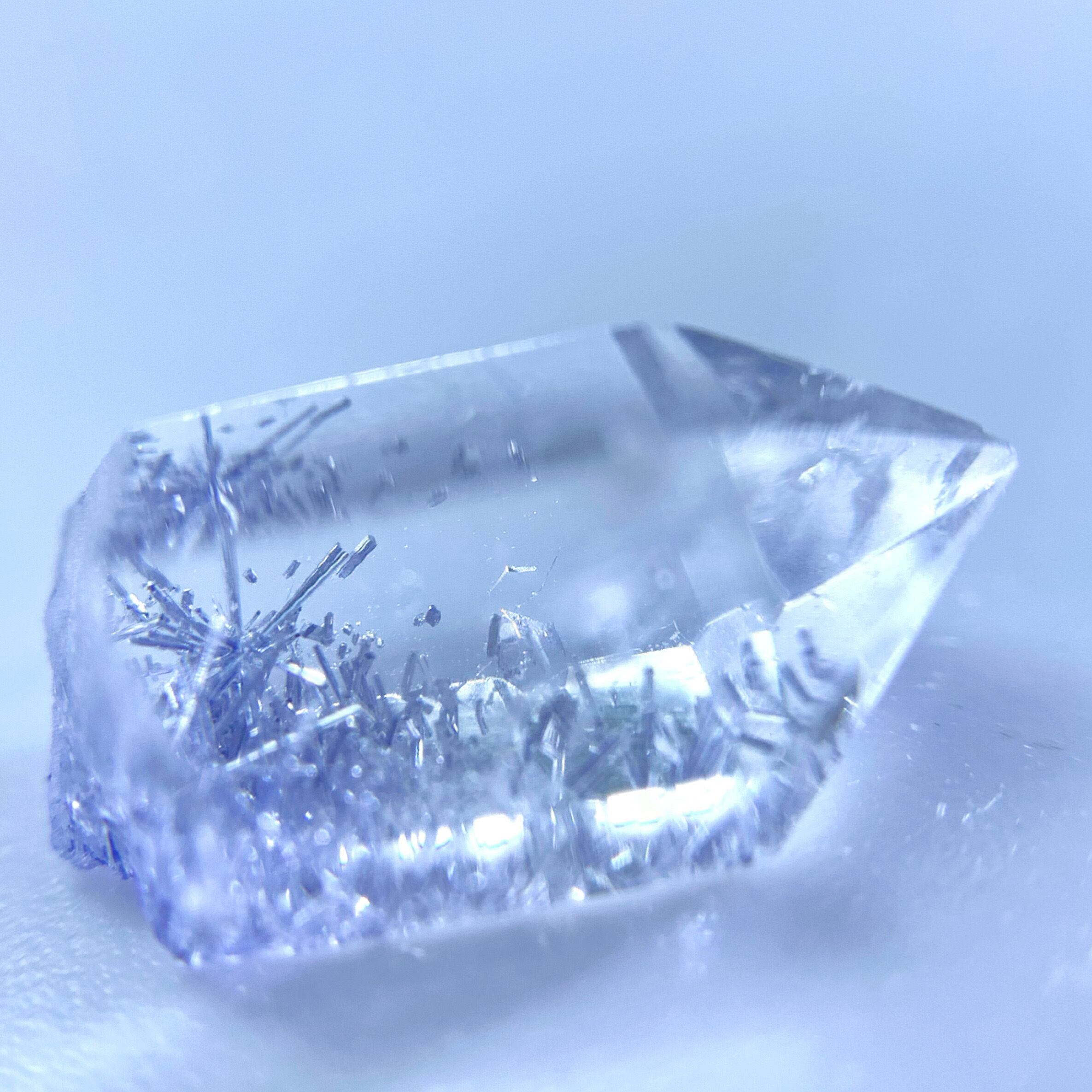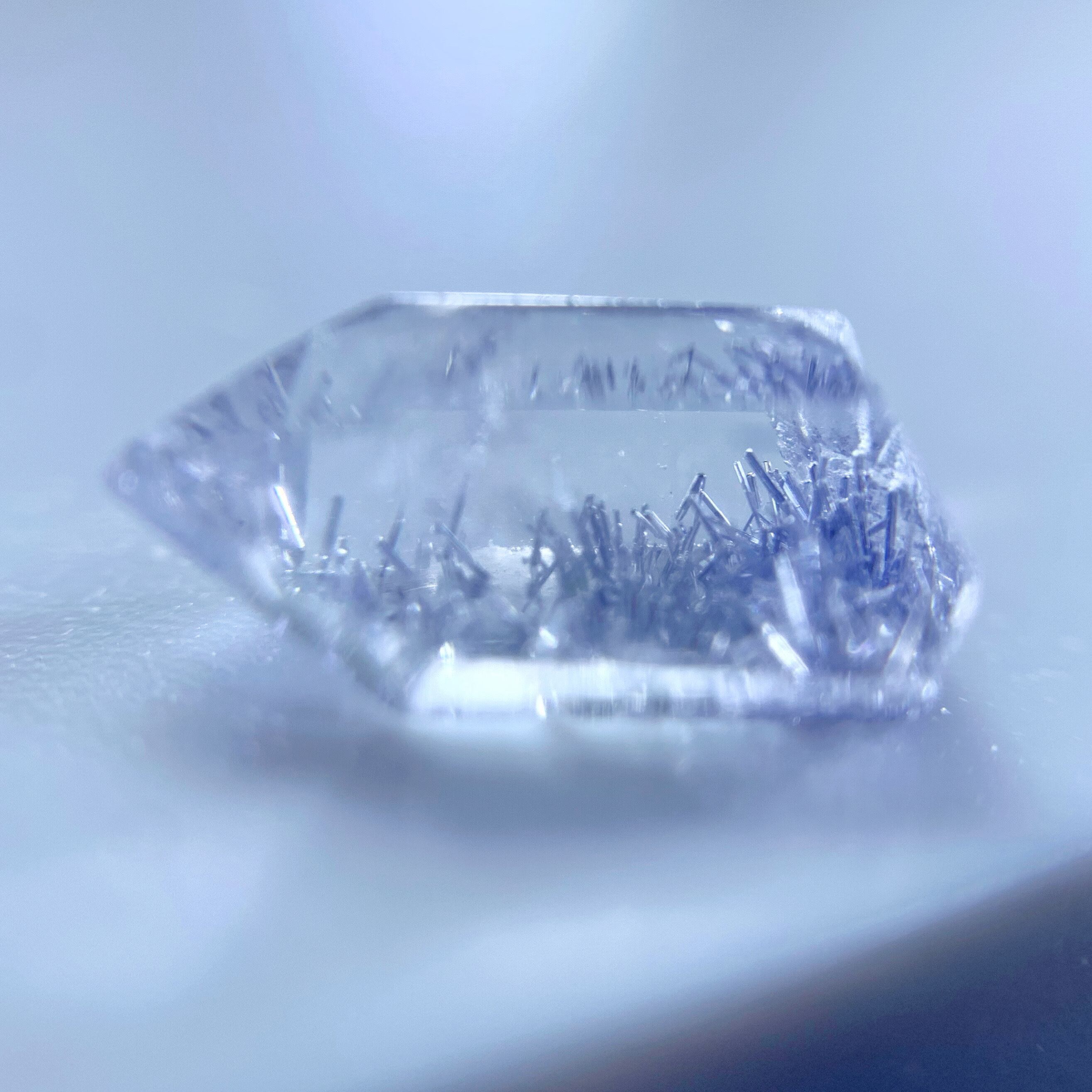 このデュモルチェライトインクォーツ、透明感が拔群ですので、濃い色の微針状結晶の集合体が見てやすい。氷花芝生を閉じ込めたよう、とても綺麗ですね。