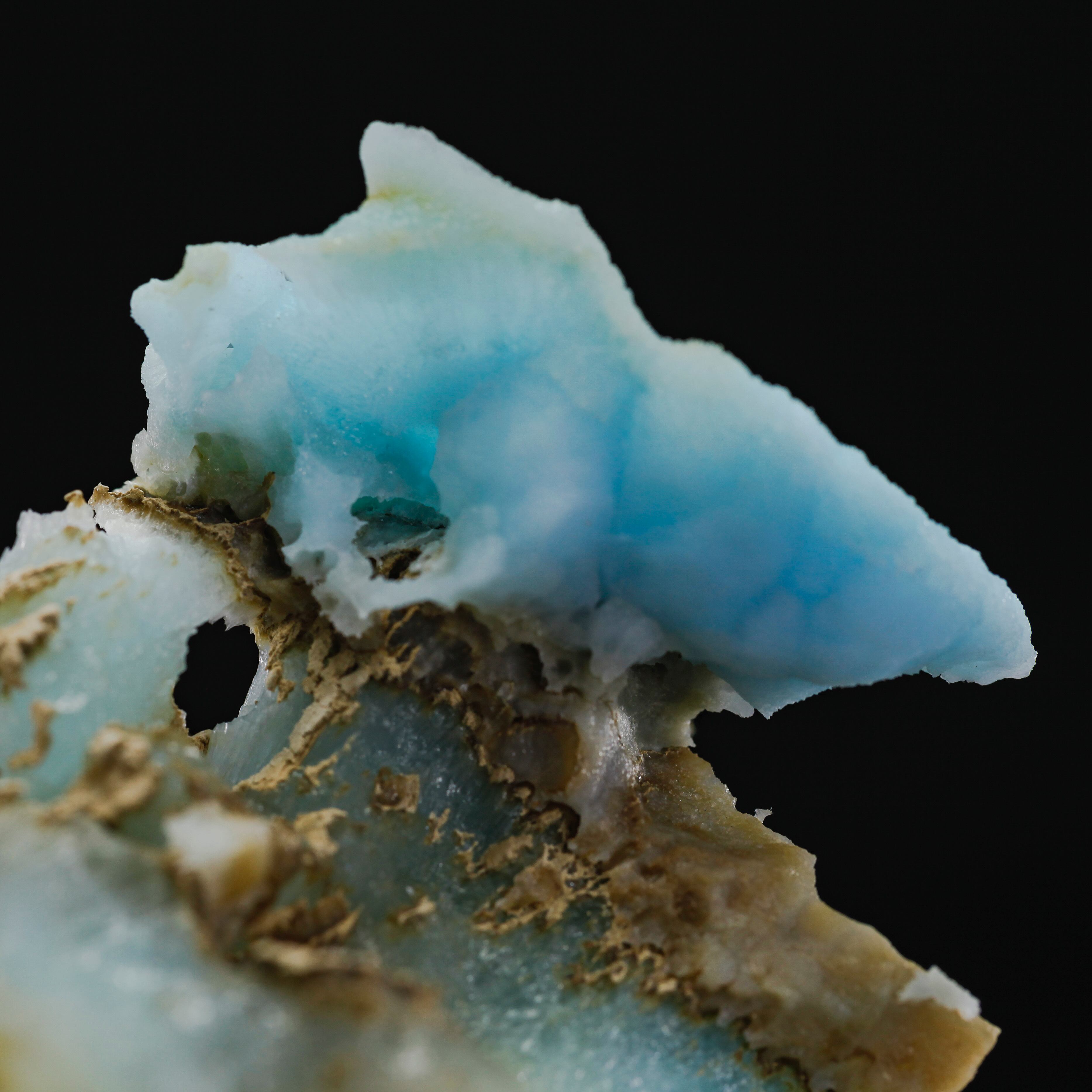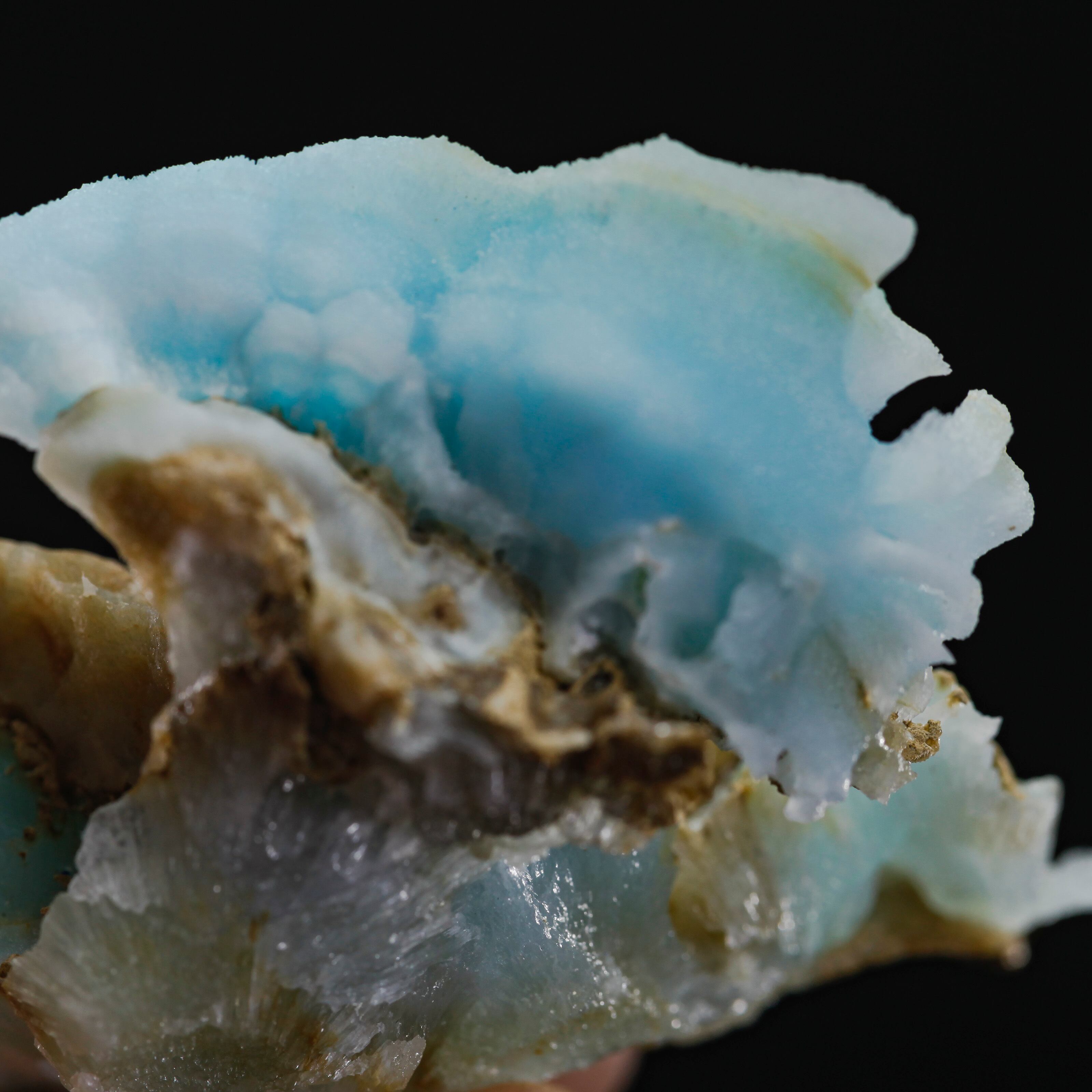 極地の氷山のような涼やかな青。母岩には薄いブルー結晶がそのまま凍ったかのよう。唯一無二の形は持つに値する。こちらはブルーアランゴナイト。