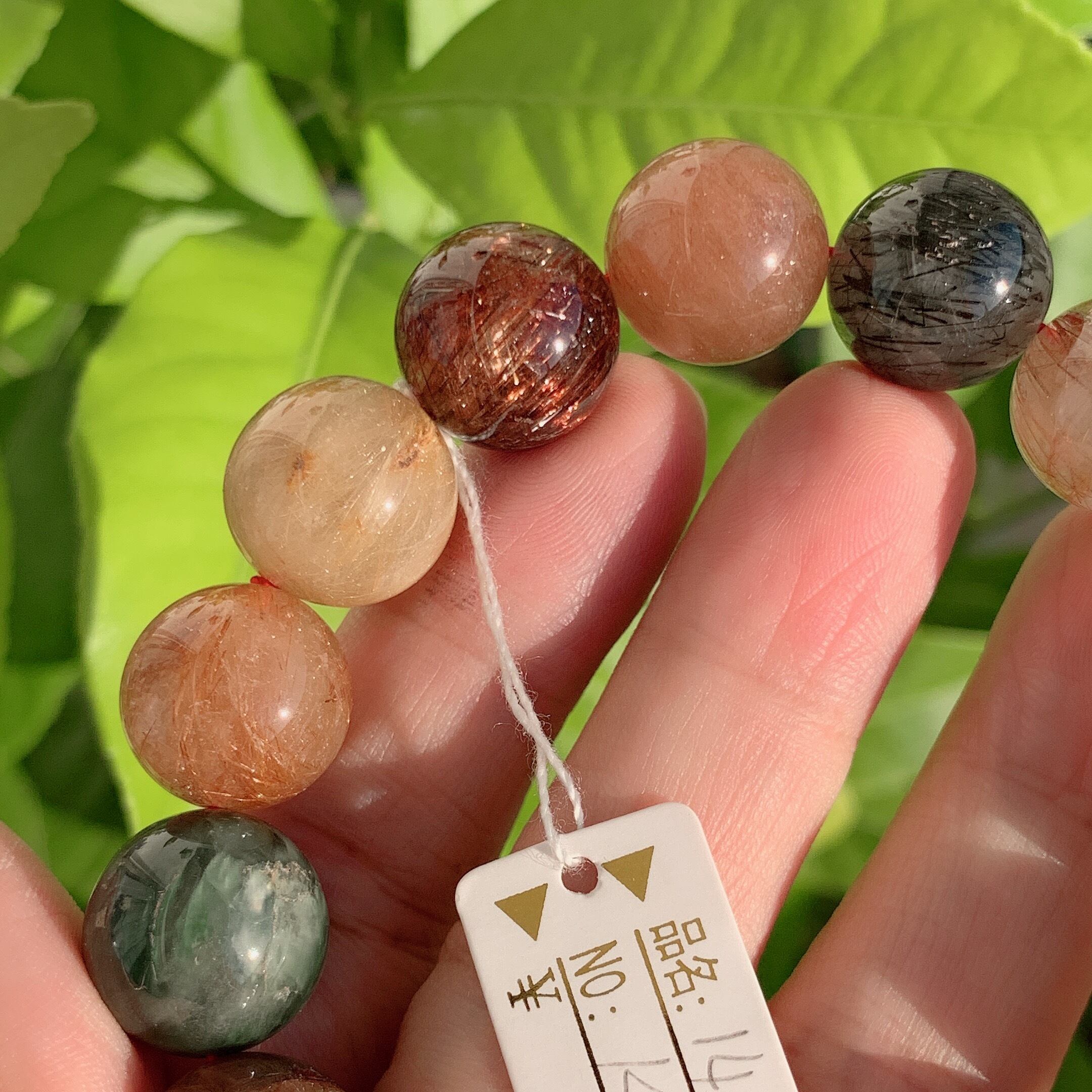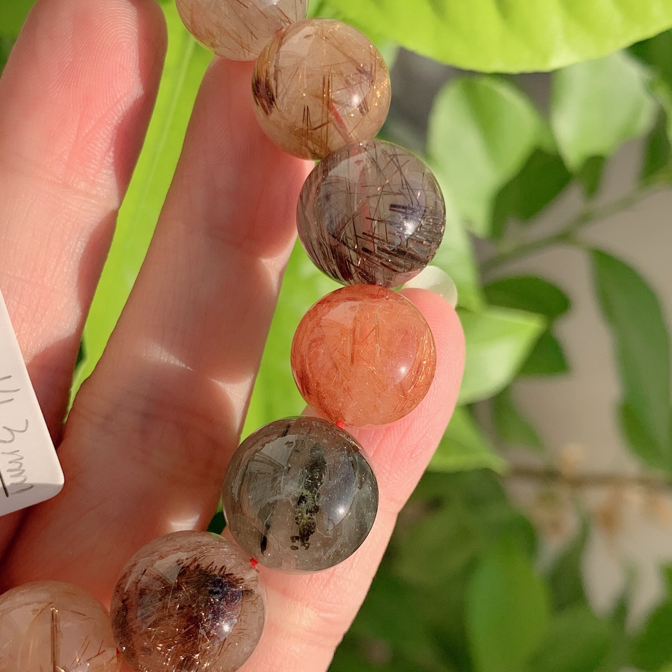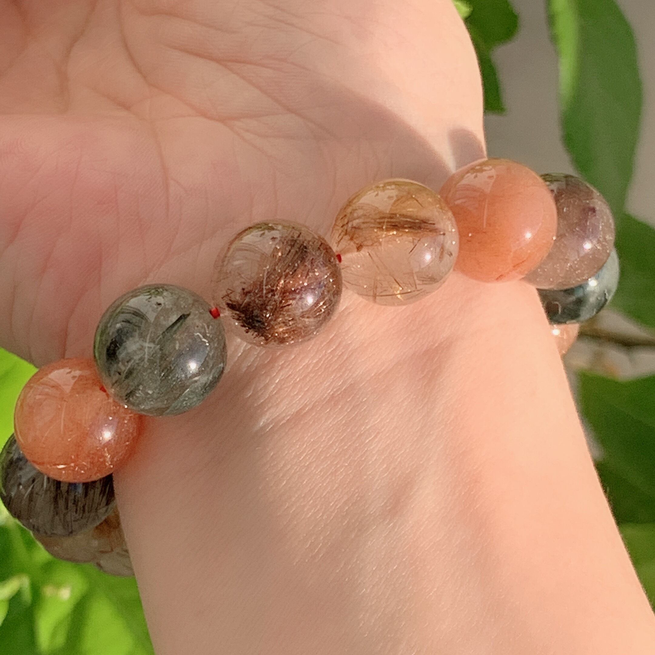 赤針、金針、緑針、褐針、黒針、シルバー針のようなフワフワとした微細な針がある、合わせた濃厚なミックスルチルクォーツのブレスになります。とても綺麗ですね。