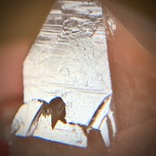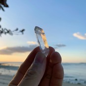 こちらクォーツもは、二つのクリスタルが共通(一つ)の根元から成長し。レムリアンシード(レムリア水晶)の特徴がある、水晶の先端部に小さい三角形▲のの凹凸、横にも刻まれたものバーコード(レコードキーパー)が見える。神聖な輝きを放ちます。