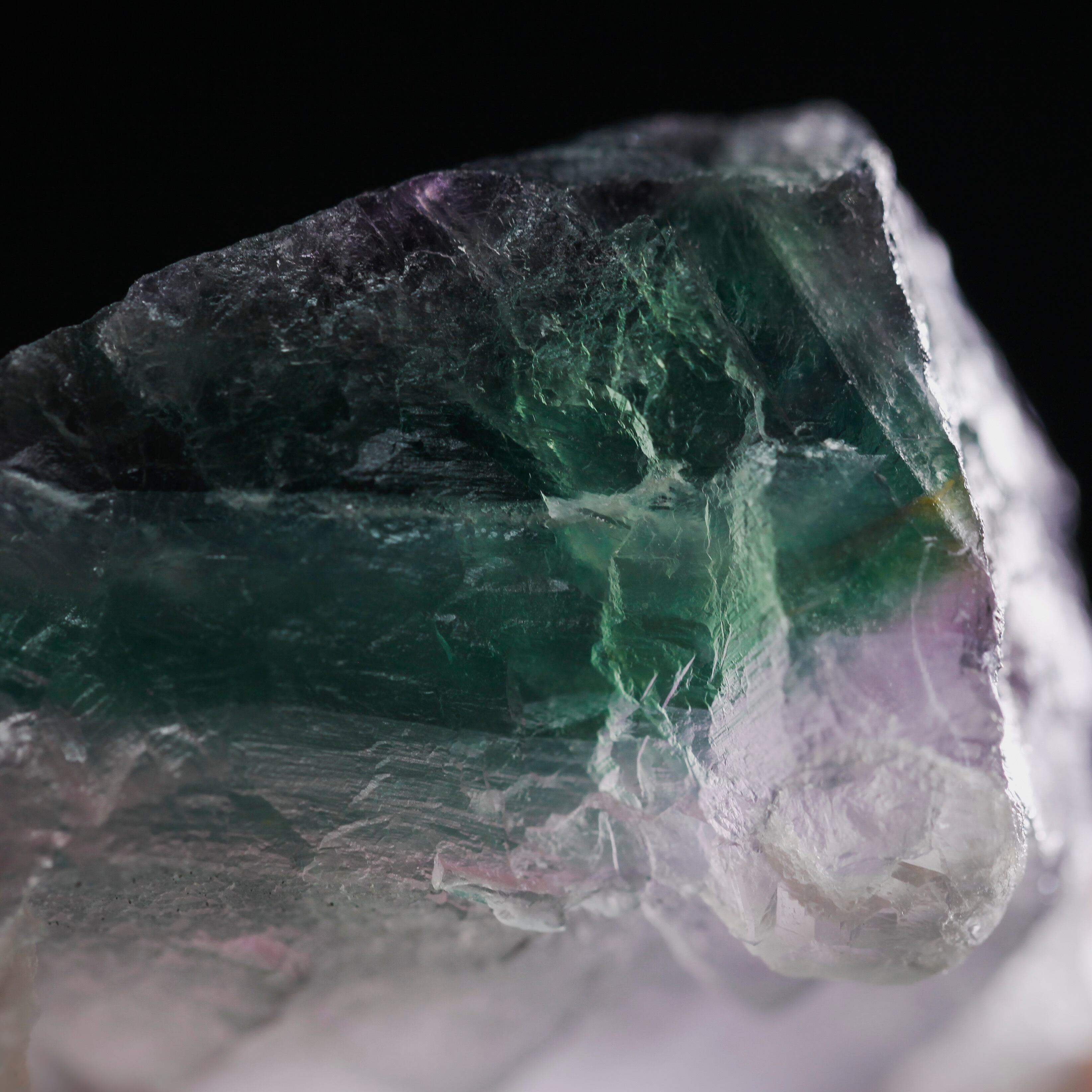 グリーンとパープルのレインボーフローライトとカルサイトの美しい原石鉱物標本です。グリーン、パープルと色合いの変化が楽しめる!こんな結晶の集合体が個性的、市場で希少な標本です。