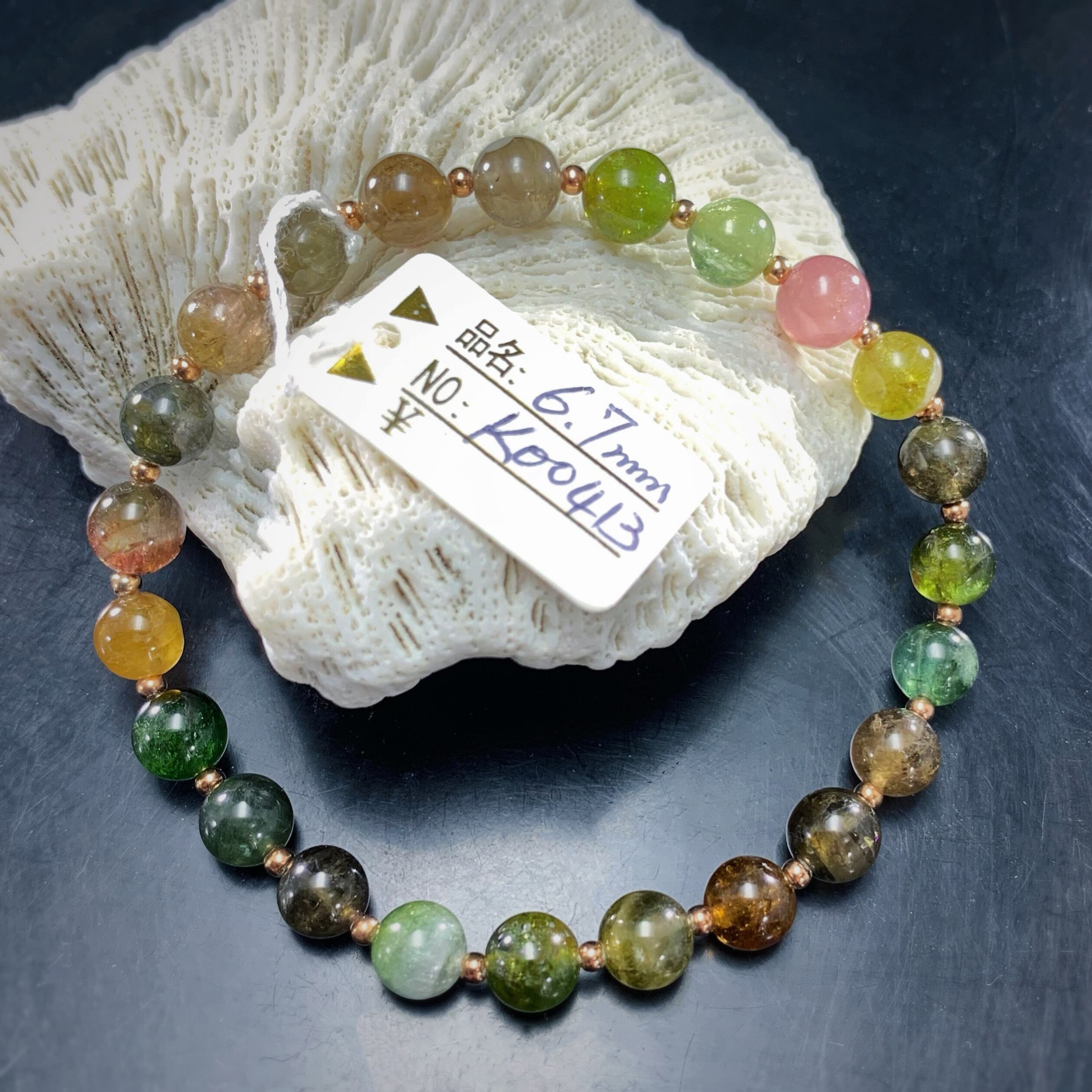 10月の誕生石、6.7ミリのミックストルマリンです。濃厚のグリーン、イエロー、ブラウン、ブラック、ブルーのトルマリンを厳選しました。キャットアイの效果があるので、とても綺麗です。多種多様な色彩を持ち、カラーバリエーションの豊富さはパワーストーンの中でも随一と言われております。