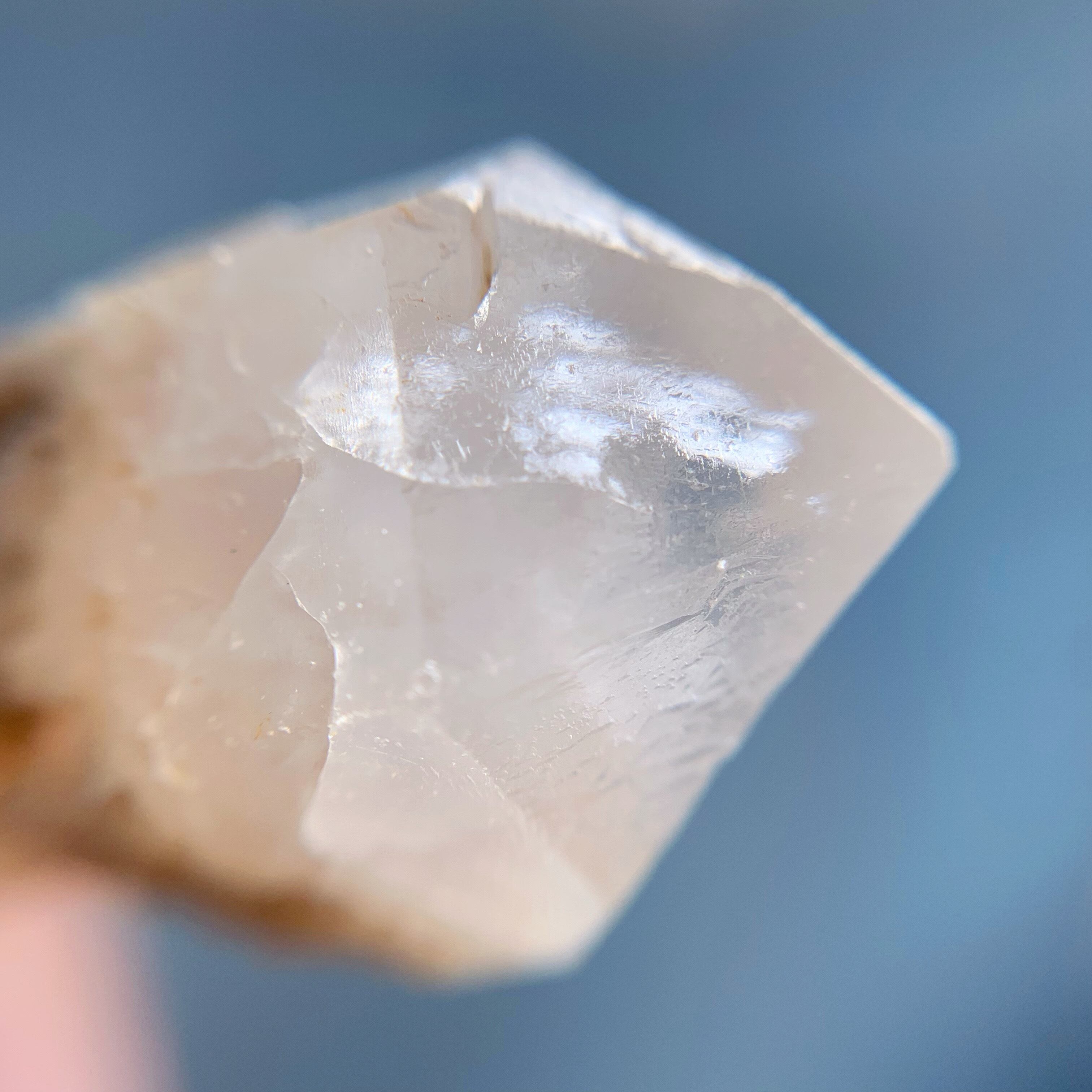 トライゴーニック水晶の錐面に逆三角形▼が深く刻まれたものをトライゴーニックといいます。大変珍しいものですが、インドのマニカラン地方で産出されるアイスクリスタルによく見られます。