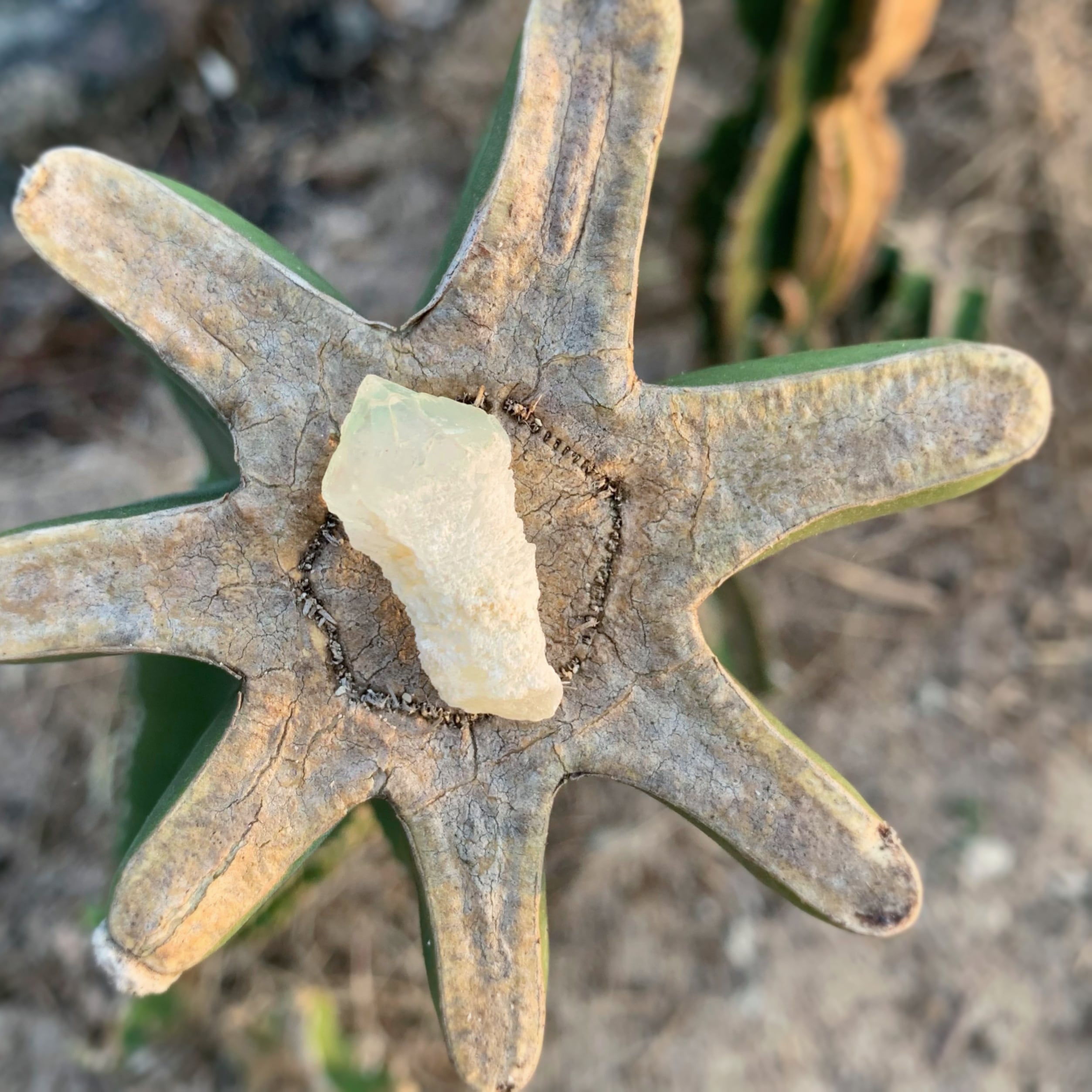 エッチドクォーツ(蝕像水晶)はクリスタルが成長過程で外部から何らかの干渉や影響を受け、表面がボコボコと変化したもの。クリスタル表が溶かされ丸みを帯びた、その独特な姿はとても個性的で、この蝕像に一目惚れしてしまいました。とても神秘的ですよね。