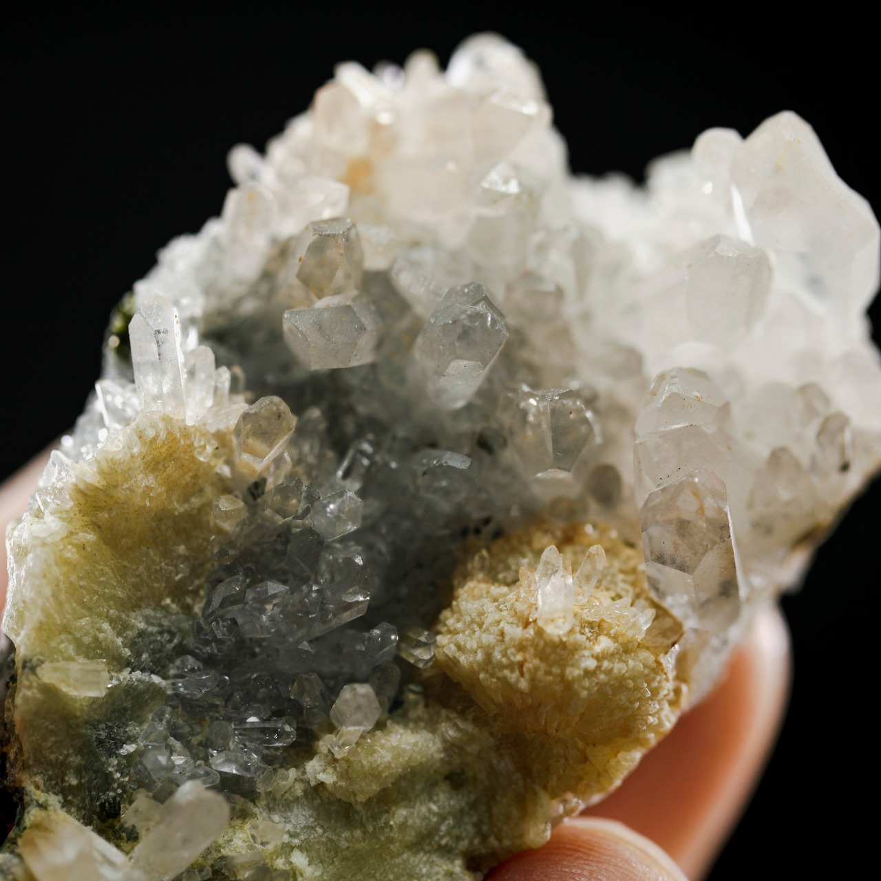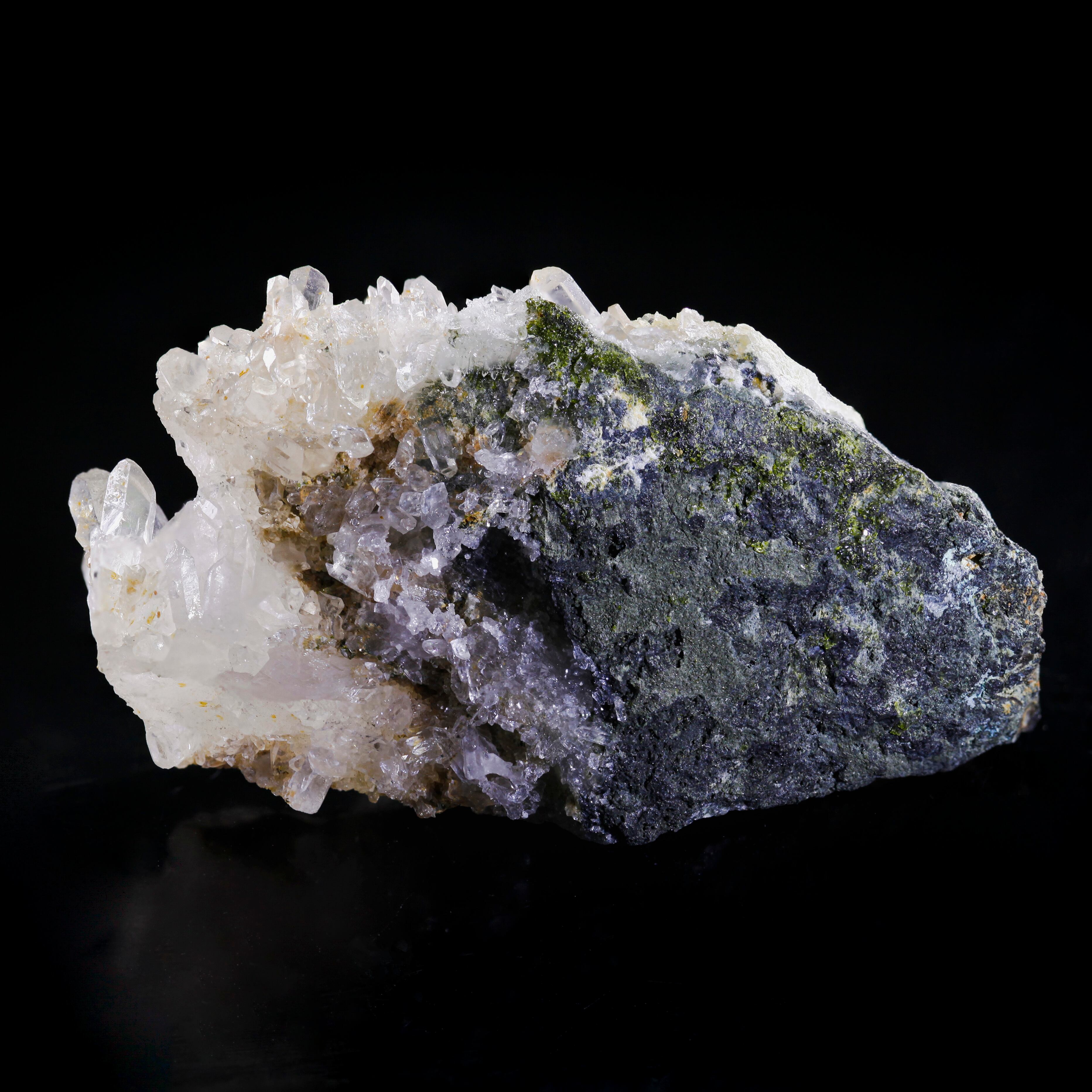 こちらはクォーツとカルサイトの共生鉱物標本です。キラキラと輝く放射状のクォーツを優しく守る。ミニ水晶ジャングルみたい。