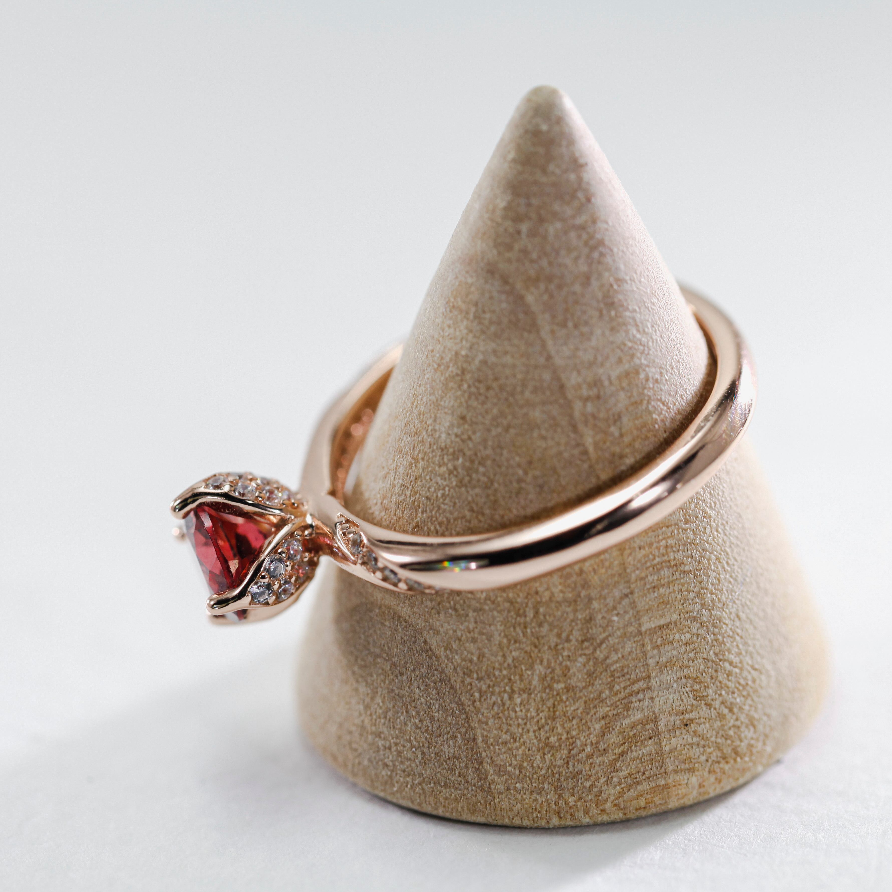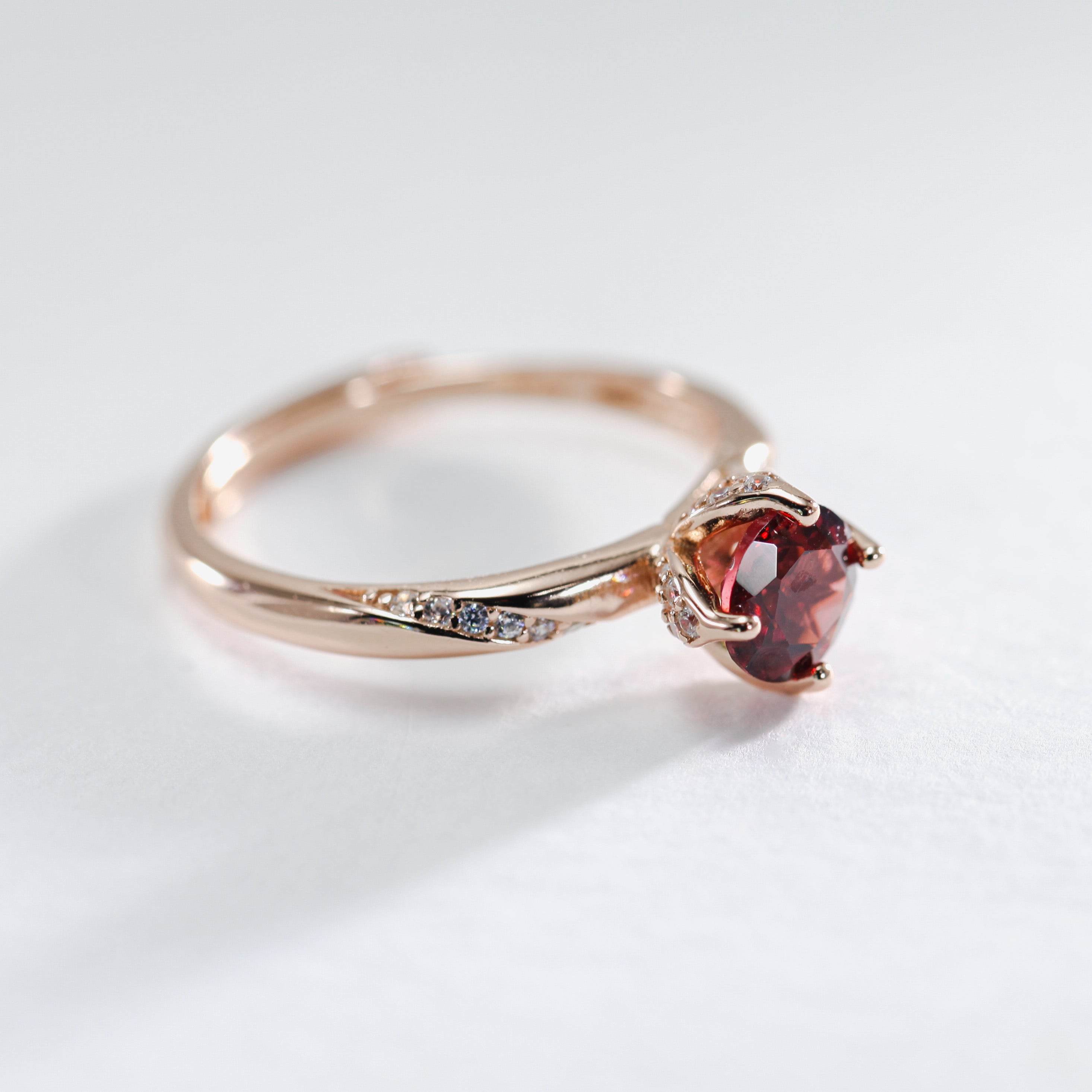 1月の誕生石。こちらはパイロープガーネット(薔薇柘榴石)です。カットはオーソドックスなラウンドカットです。色は美しいCherry Pinkで、肌を色白に見せてくれる効果があります。ピンクゴールドシルバー(S925)と、上品に仕上がるデザイン。滑らかな曲線が指を包み込み、細く綺麗に見せてくれます。