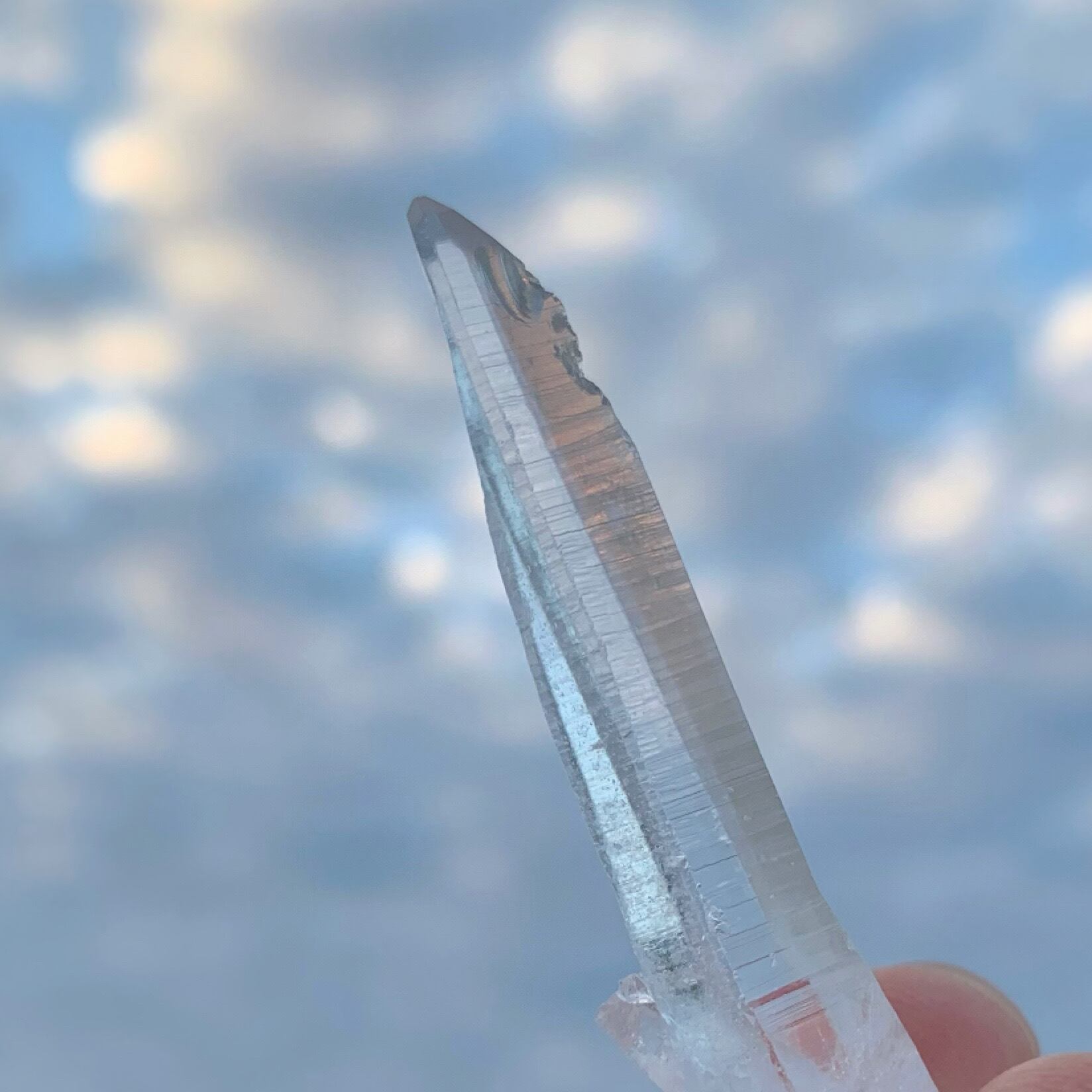 希少価値の高い照り艶良く、綺麗なレーザークォーツです。先端に向かって細長く長柱状に伸びた形をしている、透明度が高い。レムリアンシードの特徴もあります。氷のような美しさを纏い、横に刻まれたものバーコード、神聖な輝きを放ちます。
