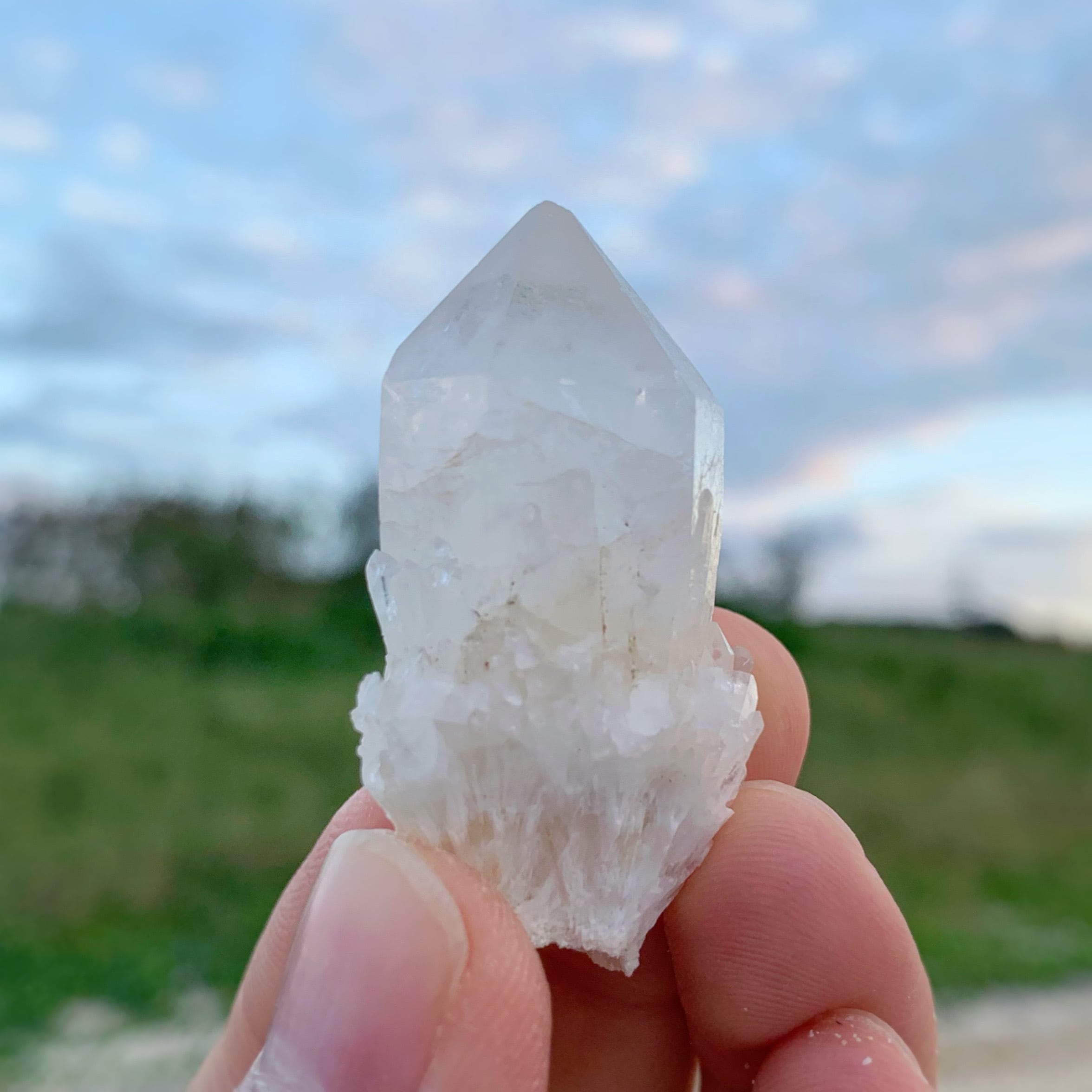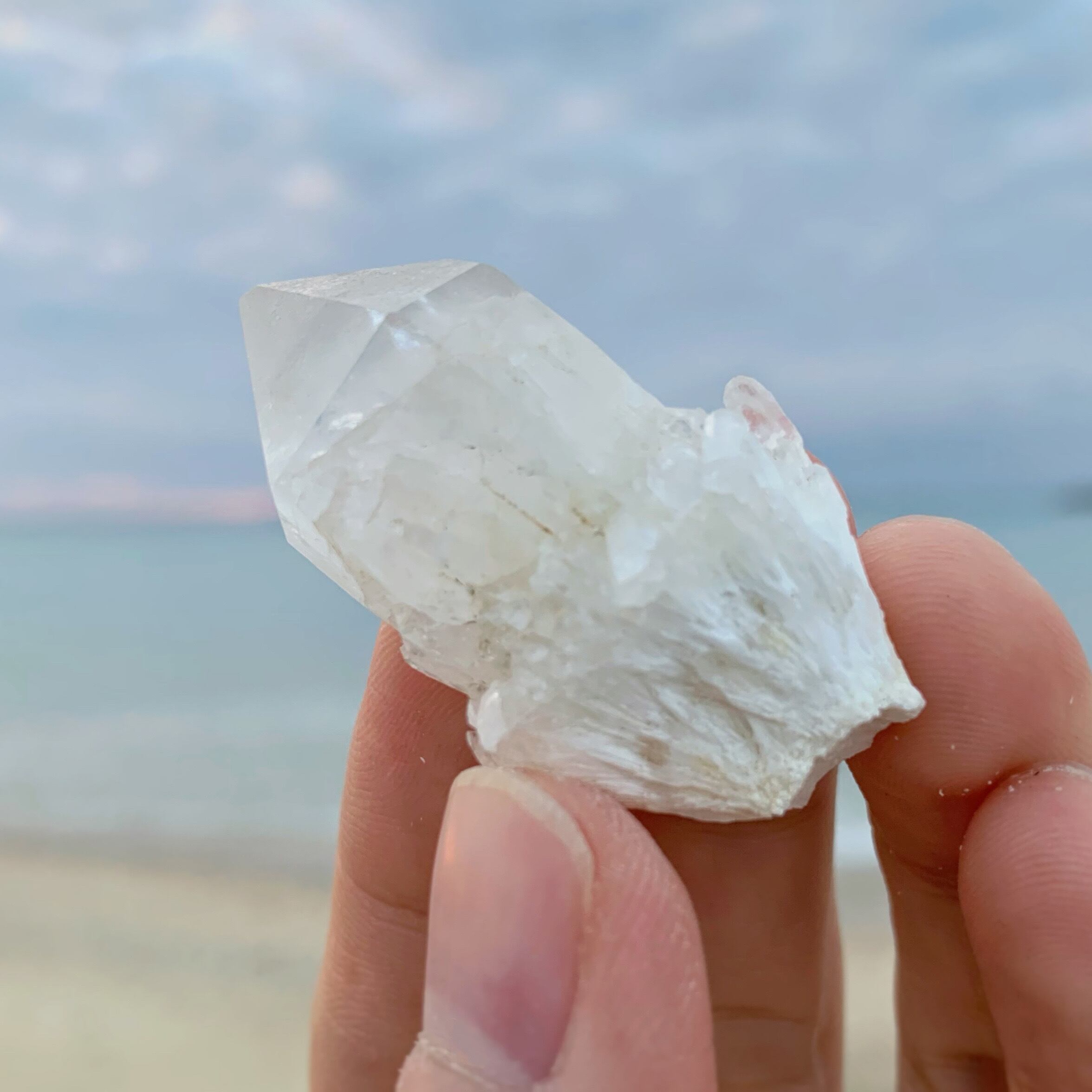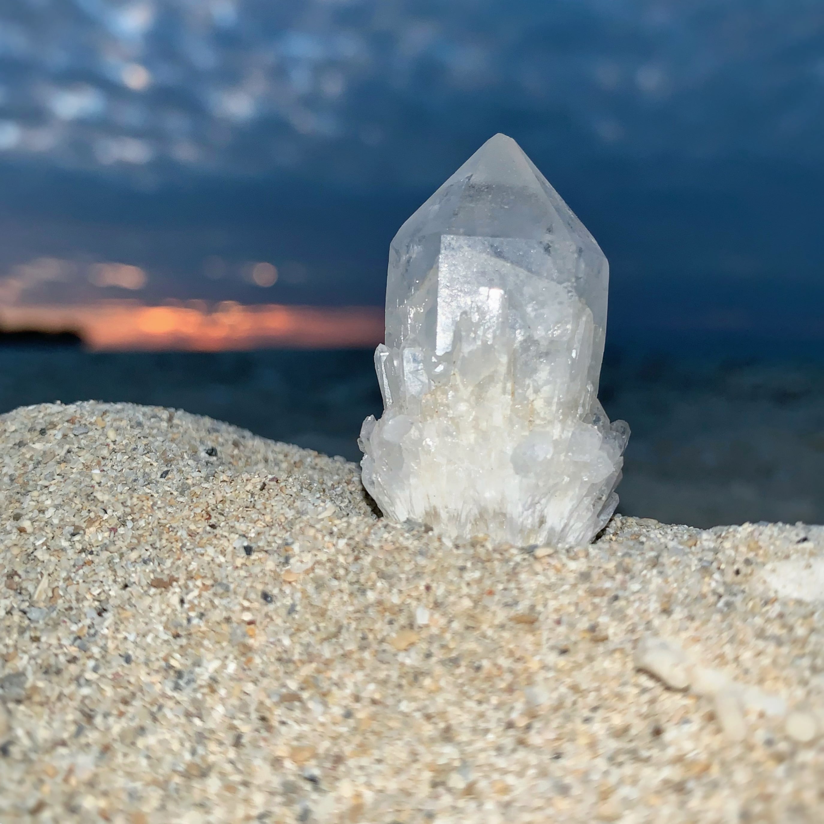 透明感がある、大変美しいクンダリーニクォーツになっております。6面体のポイントの周りには、多数の小さな結晶が群生している、クラスターを形成しているものもあります。日本の市場ではあまりお目にかかれない逸品となっております。