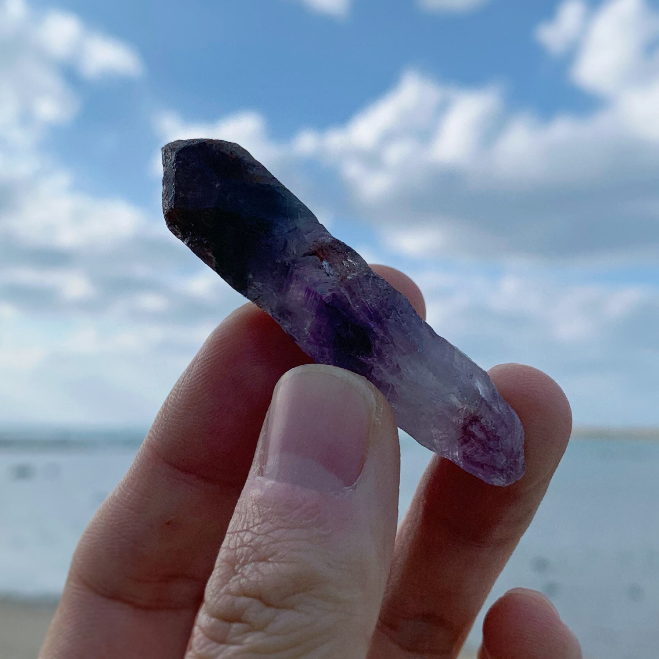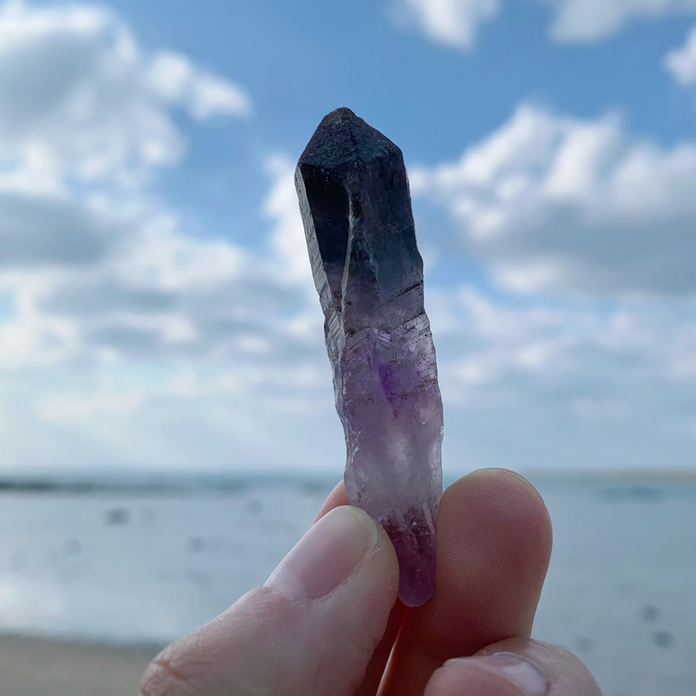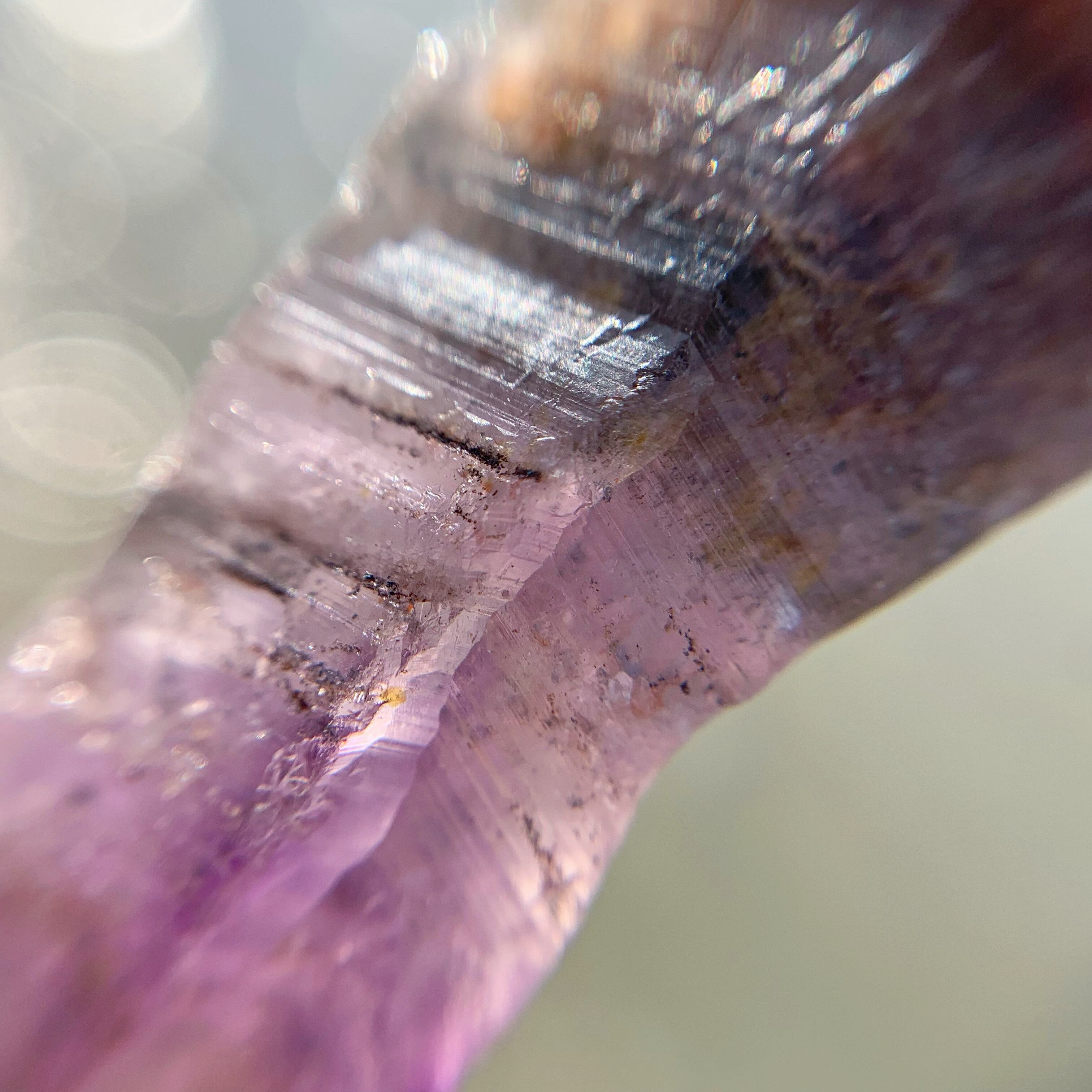 希少なアメジストエレスチャル/セプタークォーツです。キラキラ輝いていて美しいです。パワーストーンの表に横に刻まれたものバーコードもあります。