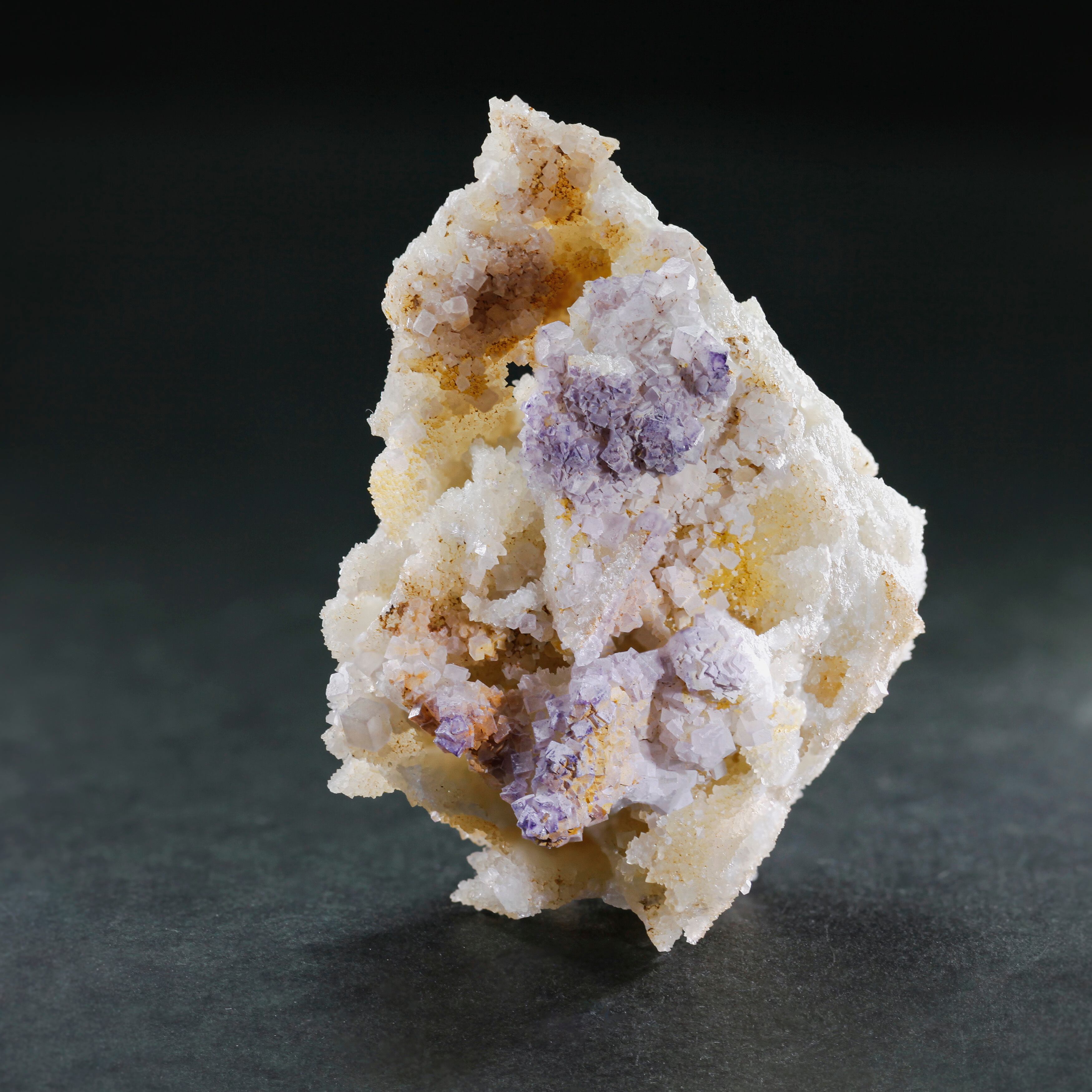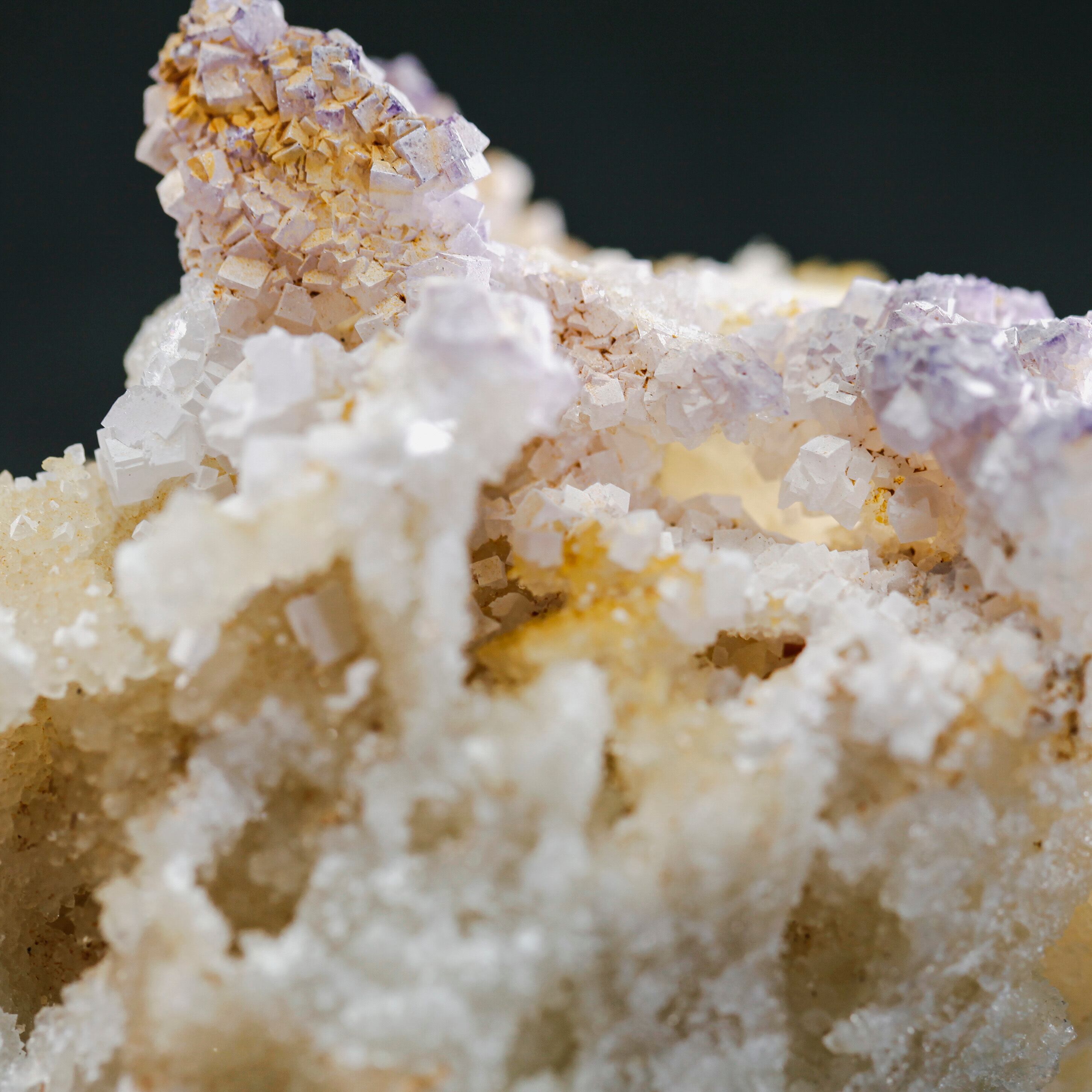 こちらは、カルサイト上に薄い紫色のイットロ蛍石が共生しています。 いろいろなサイズのイットロ蛍石があります。とても細かな結晶ですが、ルーペなどでご覧頂くと繊細で美しい世界が見えます。