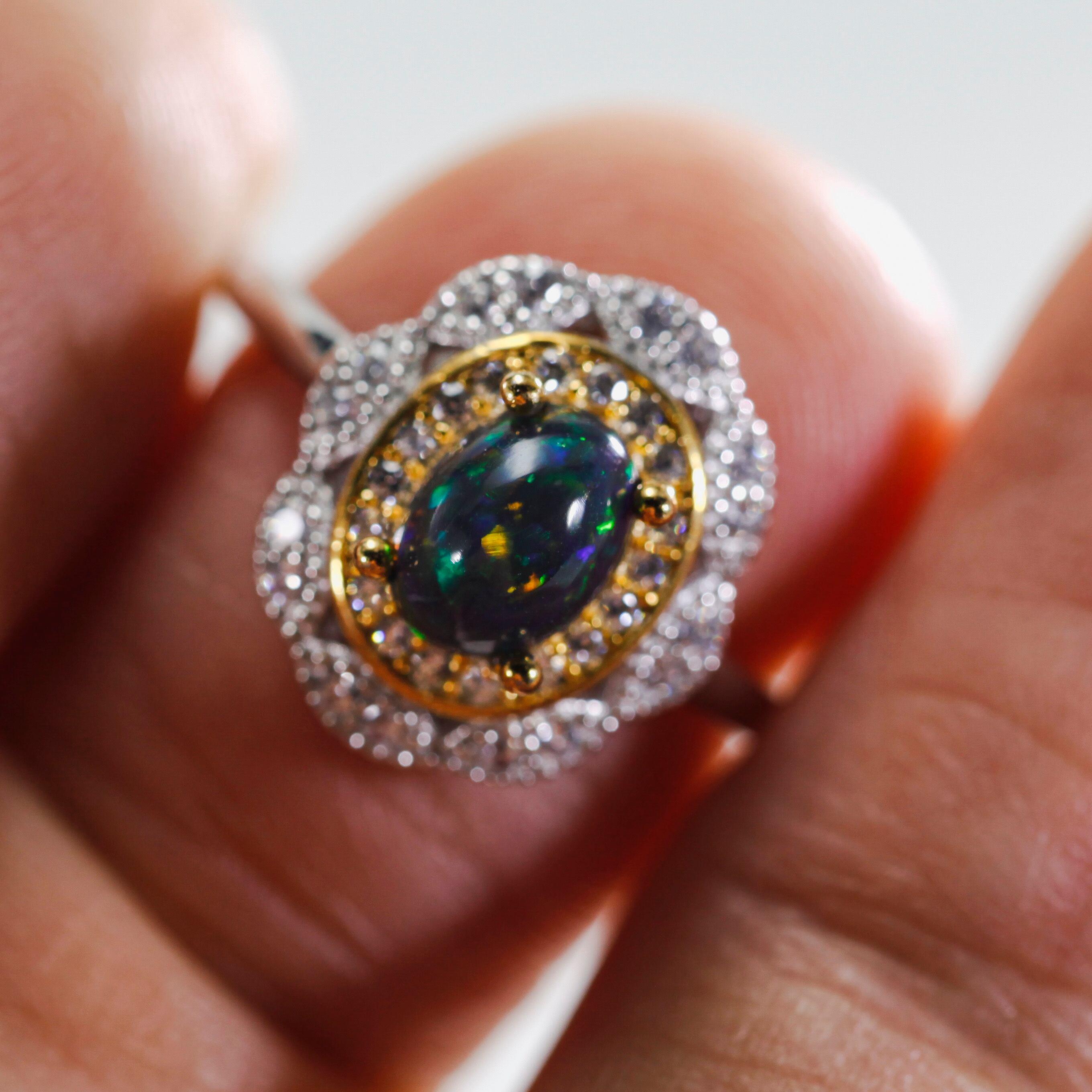 レッド、グリーン、イエロー、オレンジ、ブルー、ボルダーオパールに散りばめられた、華やかな虹色プリズム。遊色効果が見られる、高品質なものです。