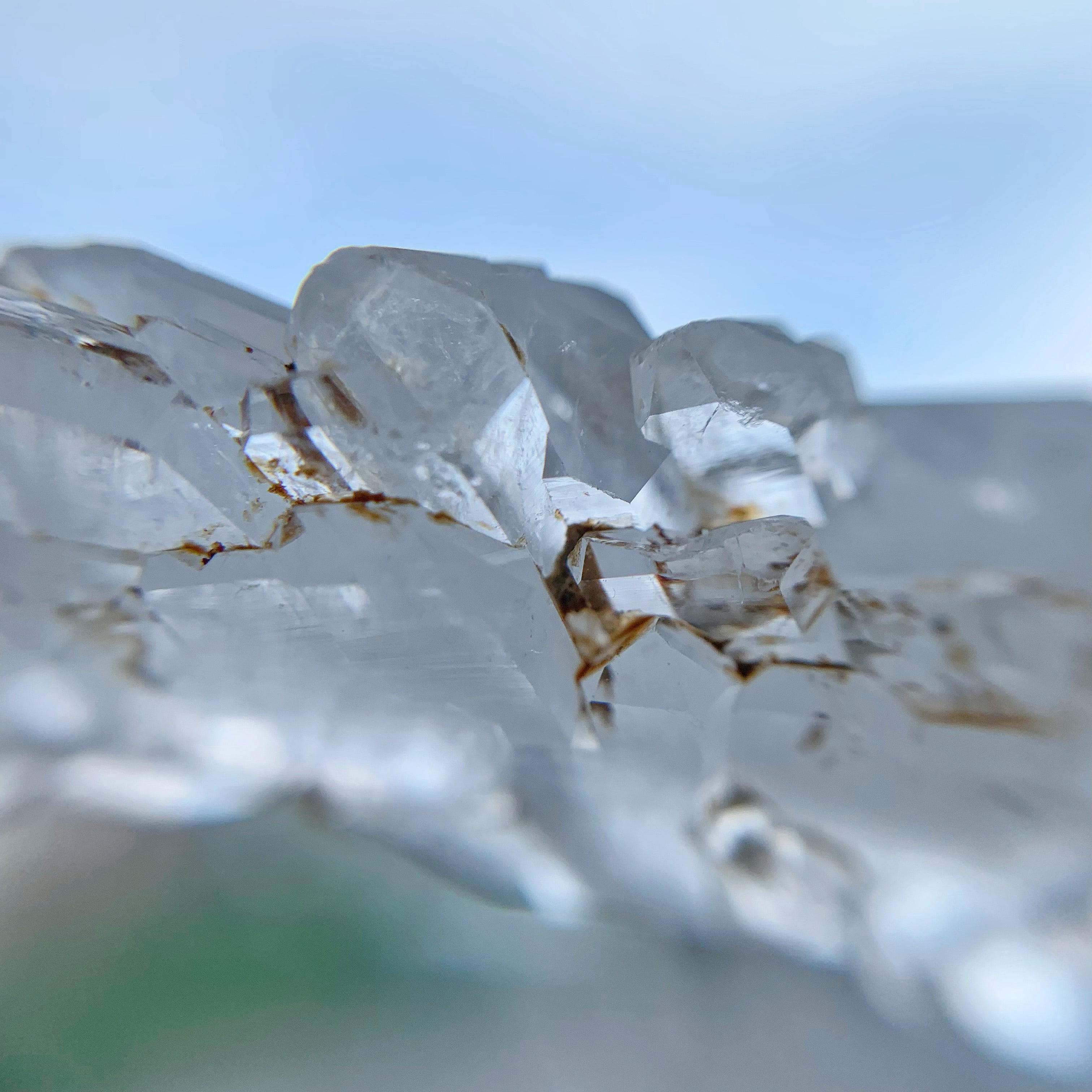 希少価値の高い照り艶良く、綺麗なファーデンクォーツ クラスターは、氷のような美しさを纏い、バーコードのように横に伸びる線のこと。この横線は水晶の成長線であり、たとえて言うのであれば樹木の年輪と同じようなものです。神聖な輝きを放ちます。