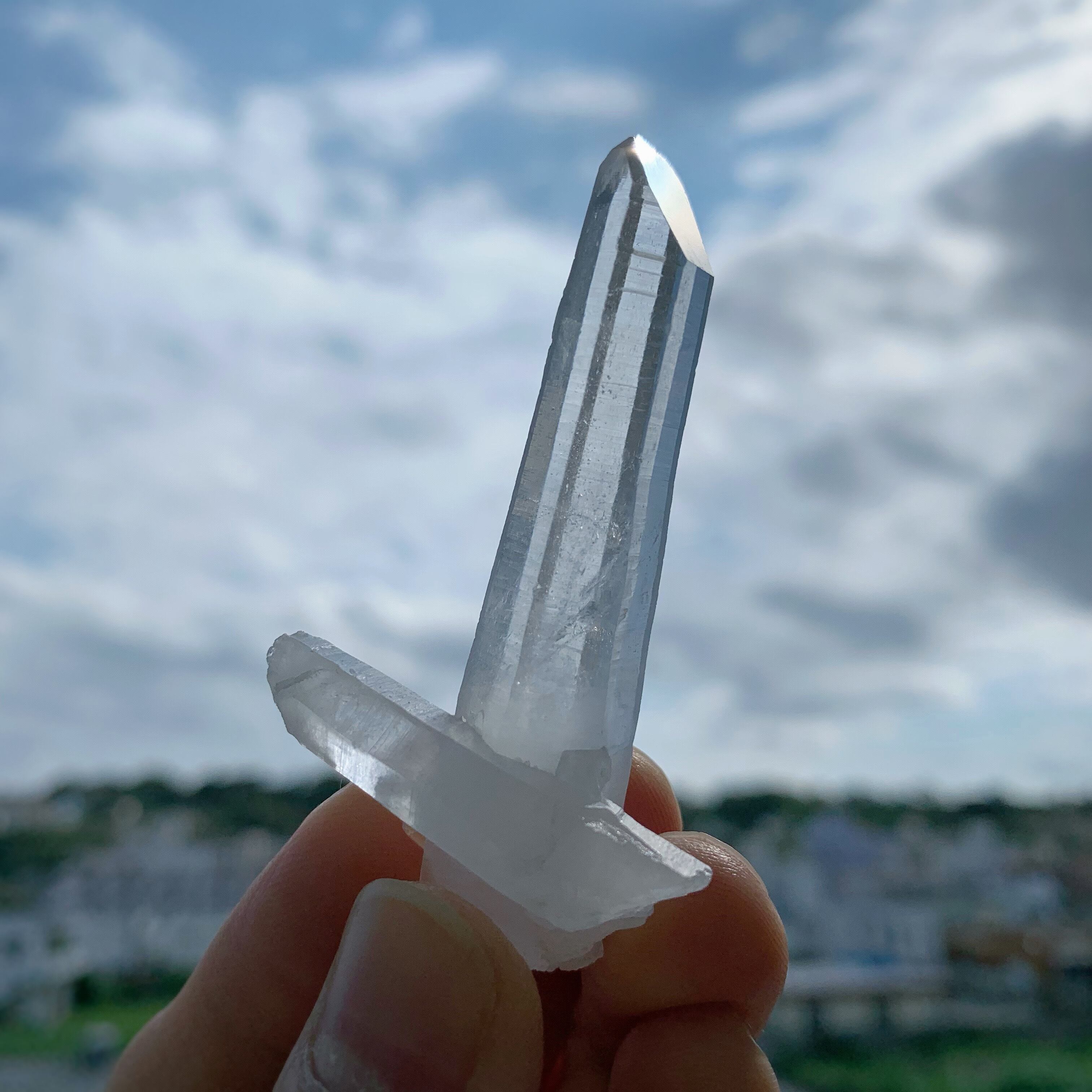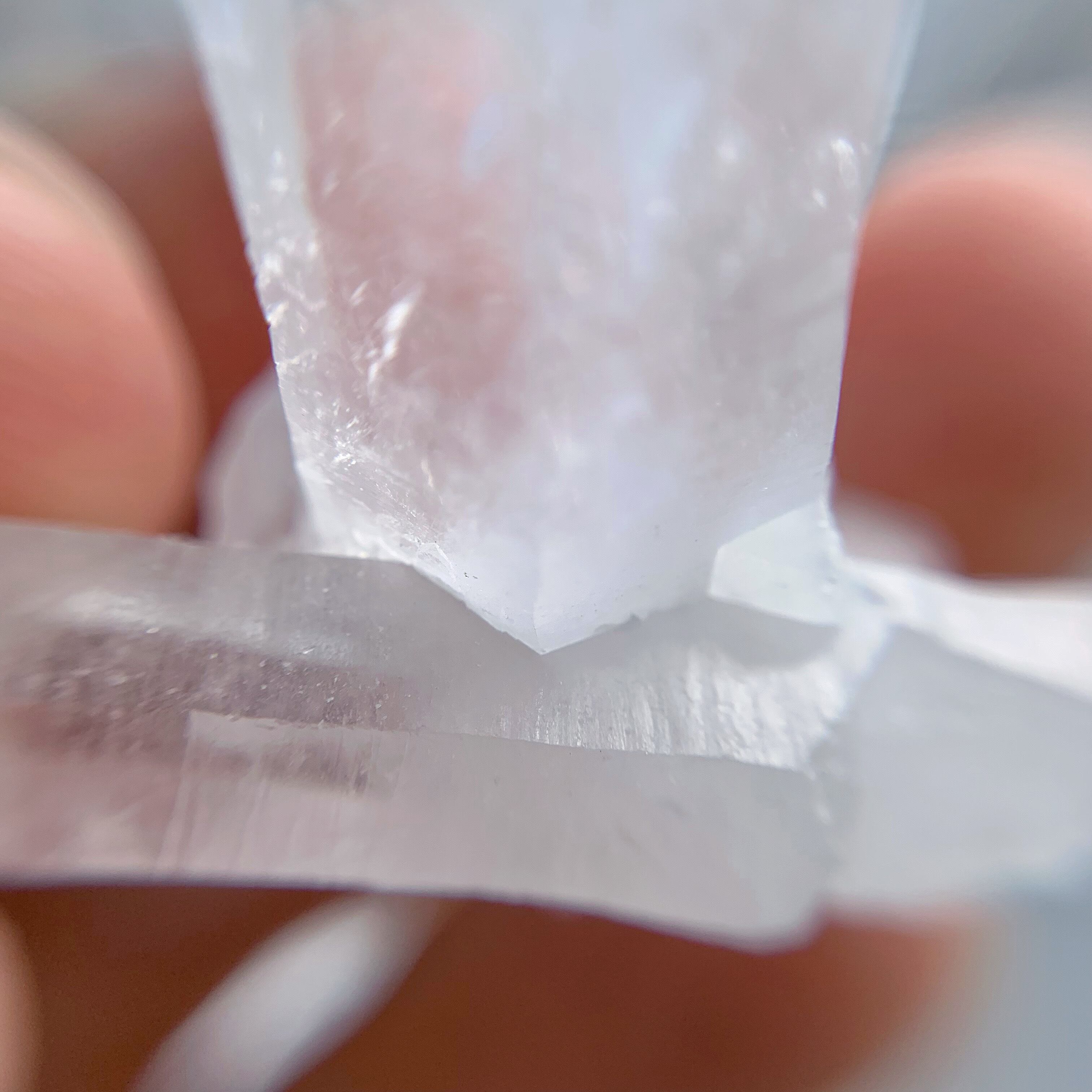 こちらのレムリアンシード(クリスタルクォーツ)は、錐面に六角形の大きな面が見える、背面も六角形の面を持っている、その両側に挟み込むように左右対称の小さな三角形の面を持っている、希少な不可思議な構成される美しい幾何学的パターンを持っているようです。