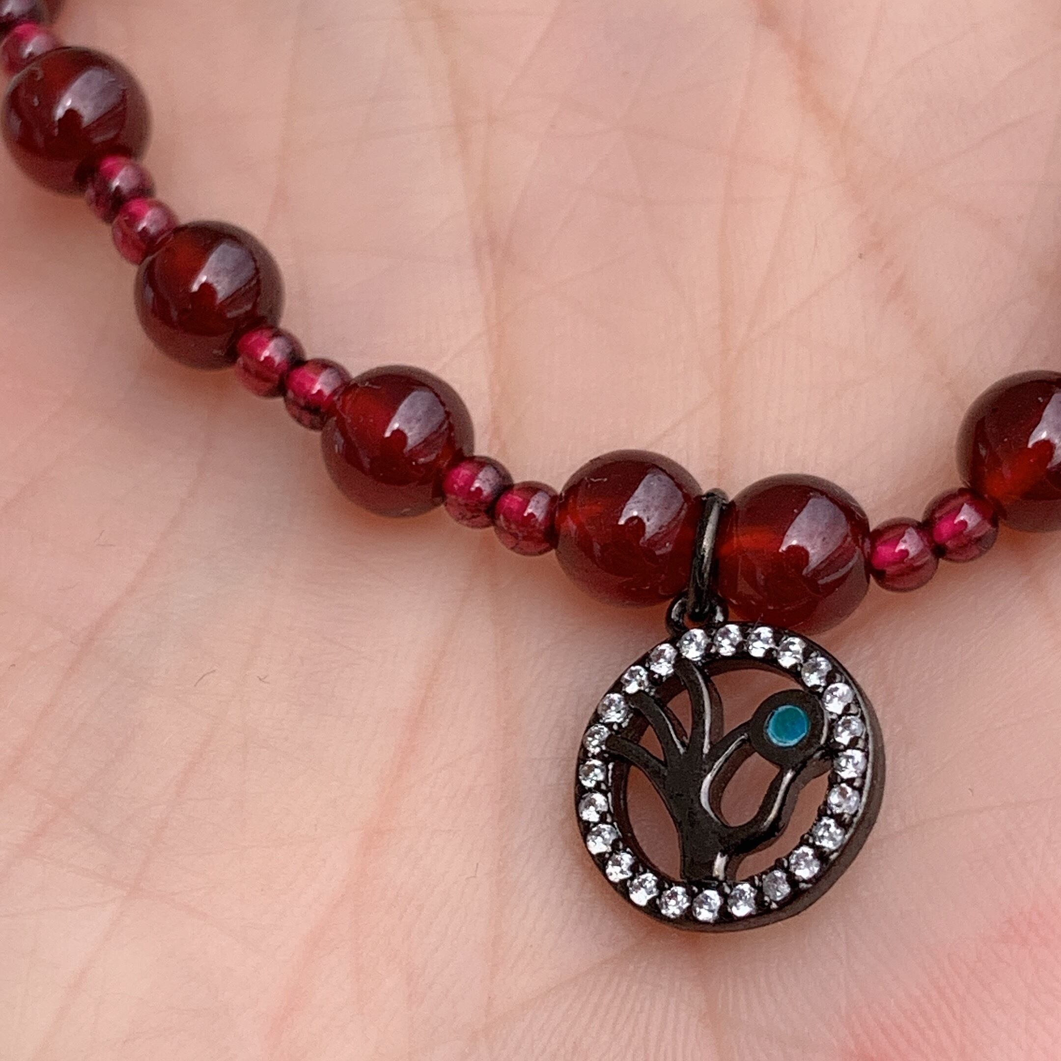 宝石質のパイロープガーネット(薔薇柘榴石)とロードガーネットです。鮮やかさ抜群!!赤向きのブレスレットは美しいガーネットより暖かい存在感!