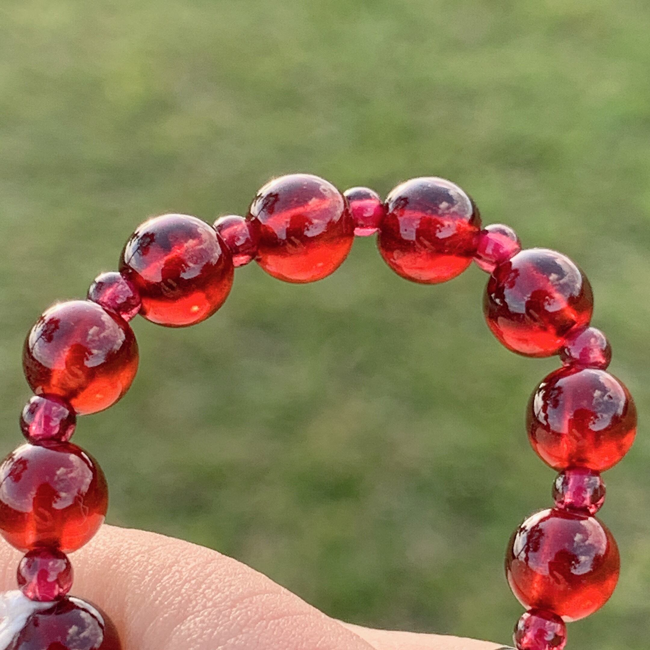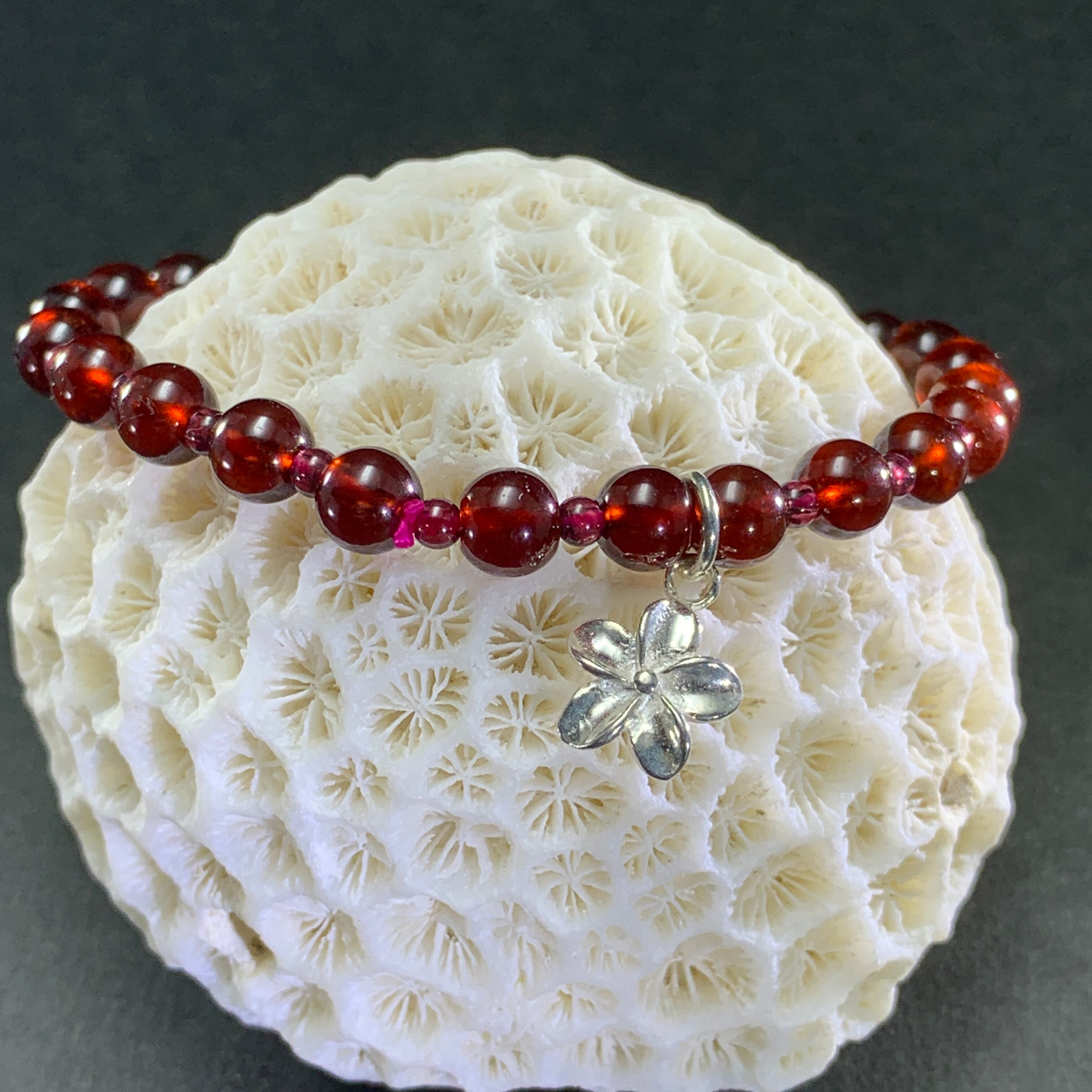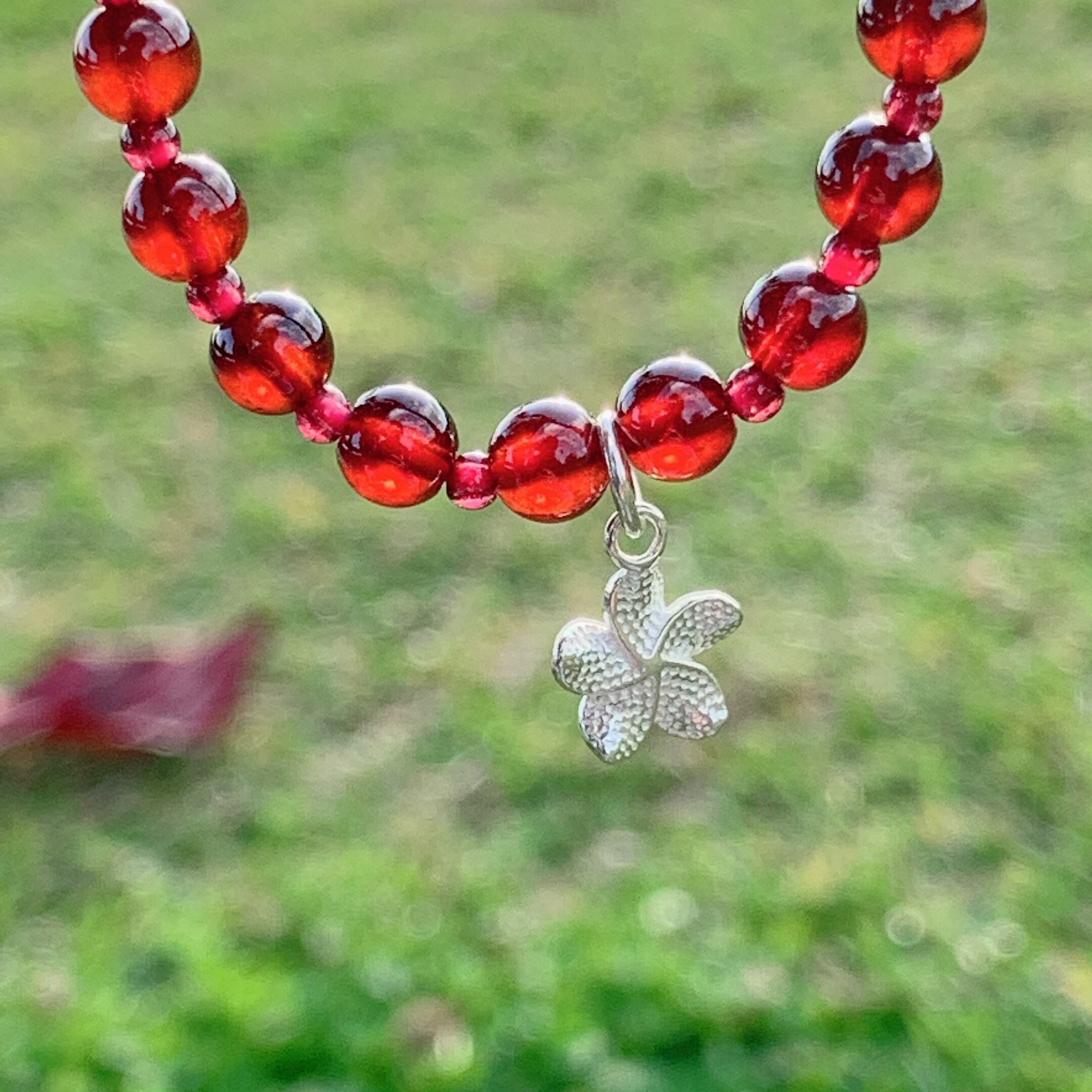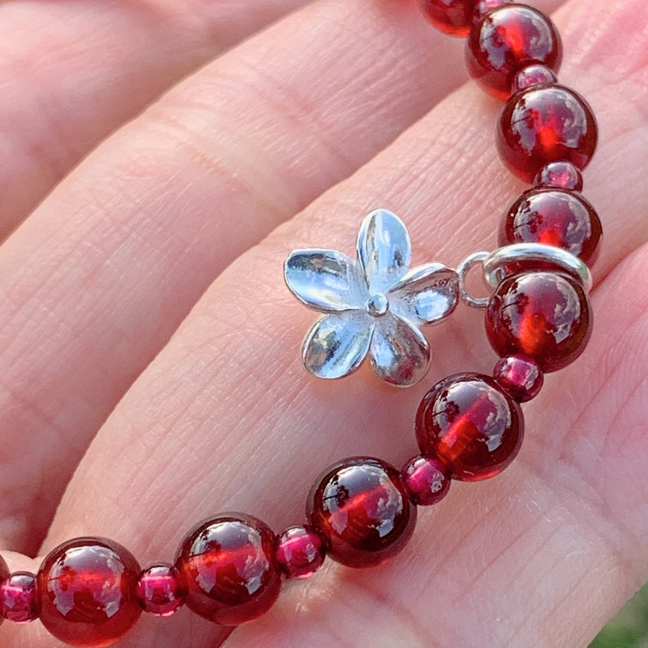 宝石質のパイロープガーネット(薔薇柘榴石)とロードガーネットです。鮮やかさ抜群!!赤向きのブレスレットは美しいガーネットより暖かい存在感!
